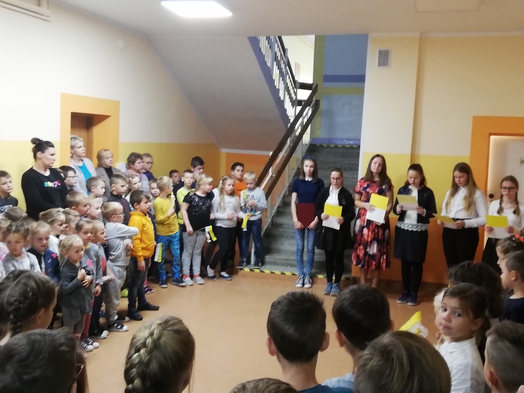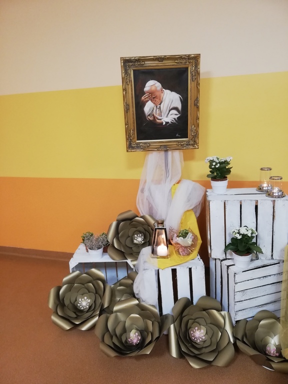 Jak co roku 15 października zebraliśmy się na uroczystym apelu z okazji Dnia Papieskiego, by uczcić naszego Rodaka, wielkiego Apostoła Narodów - Św. Jana Pawła II. W całej Polsce XIX Dzień Papieski obchodzony jest pod hasłem: "Wstańcie, chodźmy"! To zaproszenie do tego, by pójść za Jezusem i naśladować Go w codziennym życiu. Papież Polak zrozumiał i wypełnił swoje powołanie. Był mistrzem dialogu. Jego pouczające słowa zyskiwały niezwykłą siłę w kontakcie z drugim człowiekiem. Szanował godność każdego człowieka. Nie zwracał uwagi na to kim jest, czy jest bogaty czy biedny; zdrowy czy chory, duży czy mały. Był człowiekiem czynu, całe swoje serce wypełnił miłością do Boga i bliźniego. Cały czas naśladował Jezusa i wypełniał jego słowa "pójdź za mną”. Miał ogromny wpływ na losy naszego kraju i odmienił serca wielu ludzi na całym świecie. Cieszymy się, że był z nami przez tyle lat i tak wiele nas nauczył. Nasza wspaniała młodzież z klasy V; VII i VIII podczas apelu zaprezentowała nam sylwetkę Św. Jana Pawła II i przybliżyła najważniejsze aspekty Jego nauczania. Dopełnieniem tej podniosłej chwili był śpiew i poezja.