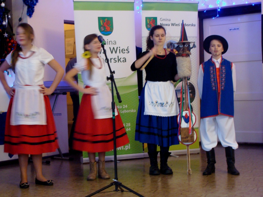 Dnia 25 stycznia w Gminnym Ośrodku Kultury w Nowej Wsi Lęborskiej odbył się cykliczny X Powiatowy Turniej Kół Gospodyń Wiejskich w trakcie którego rywalizowały ze sobą w różnorodnych konkurencjach panie z kół działających na terenie naszego powiatu. Ze względu na jubileuszowy charakter tego turnieju na wstępnie nasi uczniowie przgotowwani przez pana Jarosława Gresztę z klas V,VI i I gimnazjum przedstawili swój świąteczny program artystyczny , który został entuzjastycznie przyjęty przez licznie zgromadzoną widownię. Następnie nasi podopieczni uczęszczający na lekcję języka kaszubskiego przgotowwani przez panie Marzenę Maszotę i Anetę Treder zaprezentowali krótki program wokalny w języku kaszubskim. Ogromne brawa po wstępach świadczyły o wysokim poziomie prezentacji. Po licznych konkursach mogliśmy wspólnie z organizatorami i widzami skonsumować przygotowane na turniej potrawy regionalne. Było smacznie i wesoło.