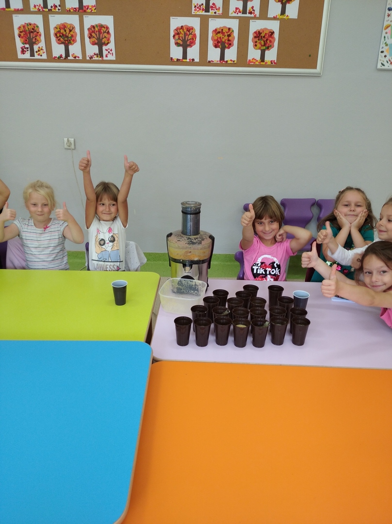 Z myślą o tych pysznych witaminkach, przedszkolaki w pierwszej kolejności postanowiły sprawdzić czy z owoców da się wyczarować pyszny sok i to bez dodatku cukru. Od razu przystąpiły do wyciskania soku. Po skończonej pracy przedszkolaki delektowały się samodzielnie wyciśniętym sokiem.