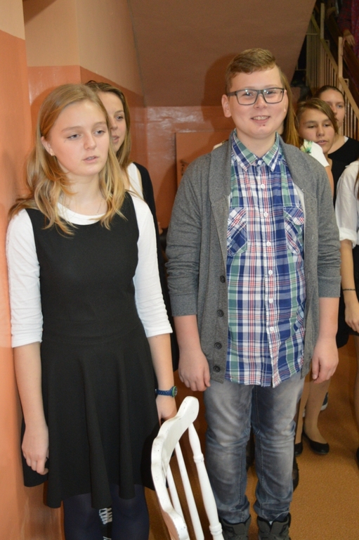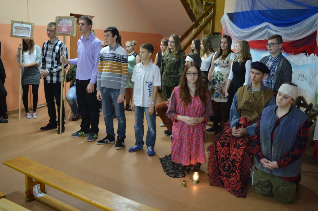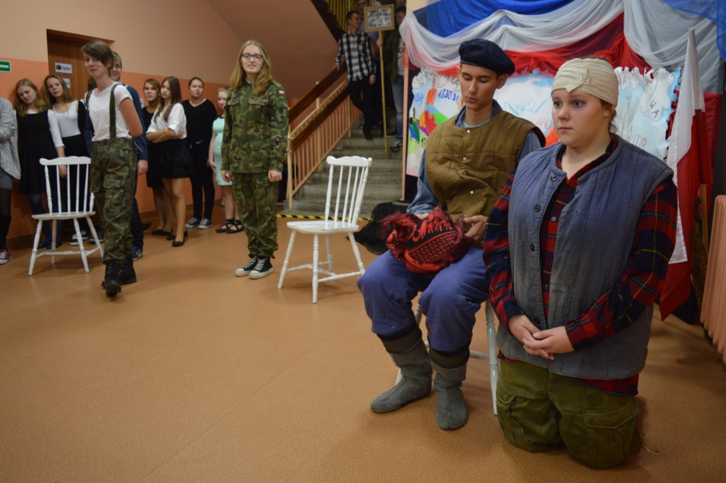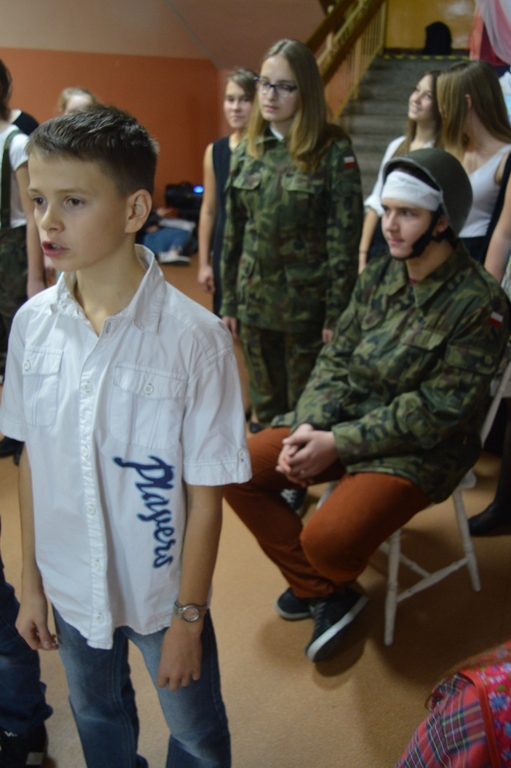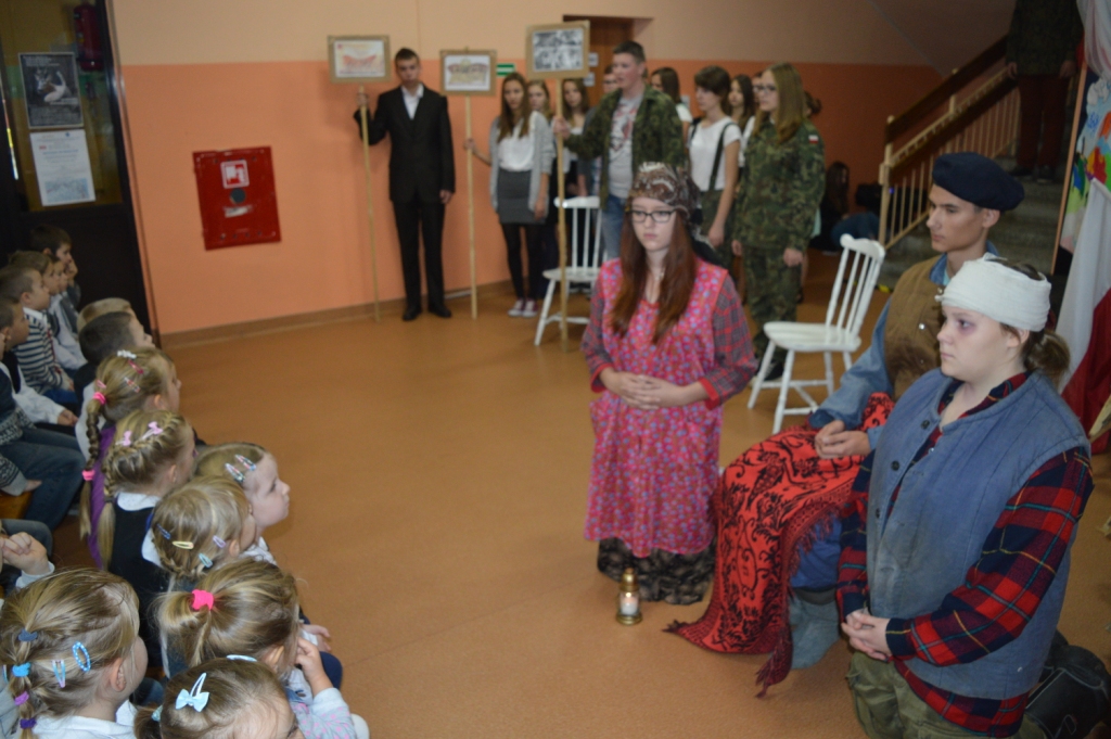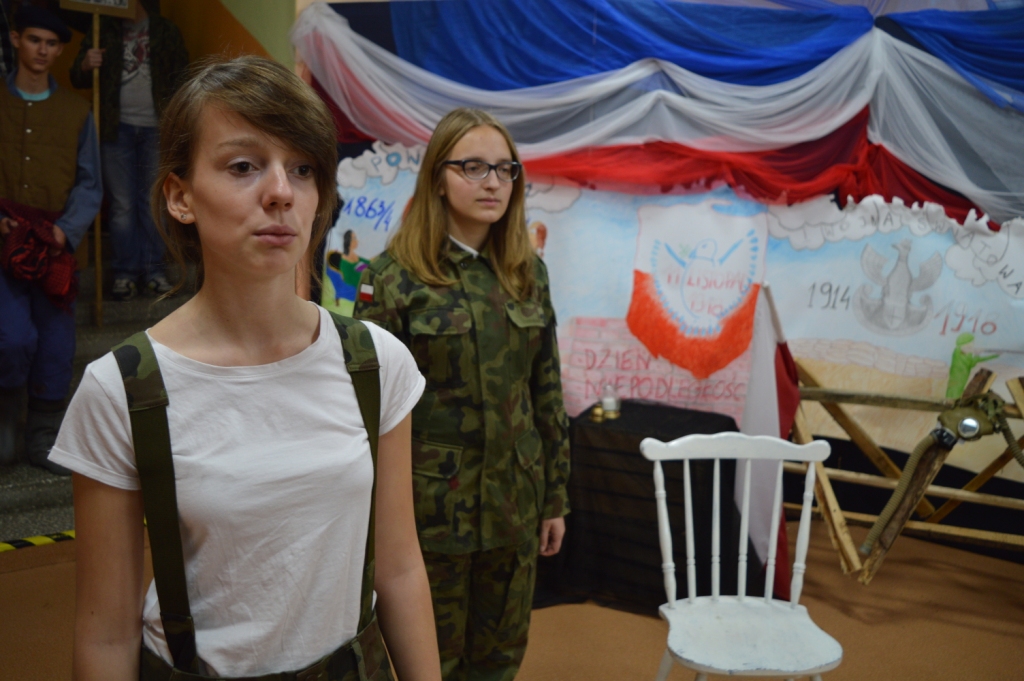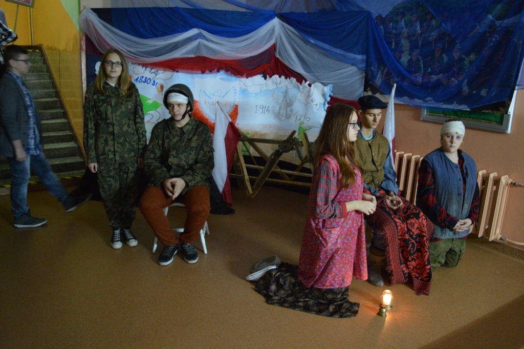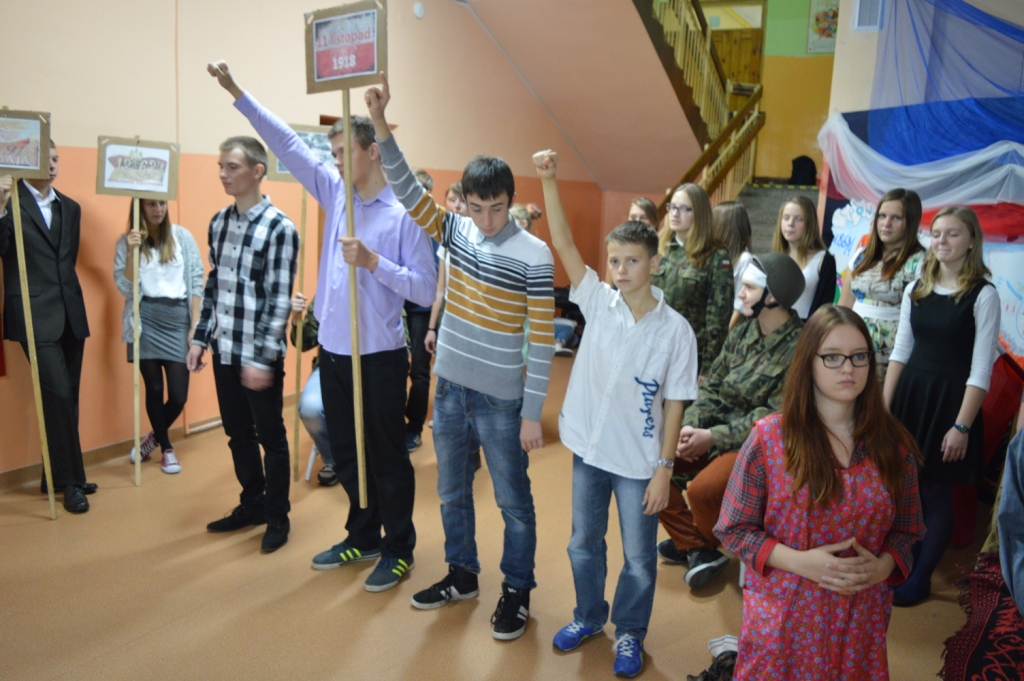 roku po 123 latach niewoli Polska odzyskała niepodległość. Głównym mottem inscenizacji były fragmenty listów napisanych przez świadków ówczesnych wydarzeń. Wielkie emocje wzbudziły wspaniałe recytacje Karoliny Wrońskiej i Krystiana Płotki, relacjonujące burzliwe dzieje tysięcy polaków zesłanych na Syberii . Gromkie brawa po zakończeniu spektaklu oraz pozytywne recenzje świadczyły o bardzo wysokim poziomie wykonawczym zaprezentowanej inscenizacji. Wielkie słowa uznania należą się także uczniom klasy II gimnazjum za przygotowanie bardzo oryginalnej scenografii . O wspaniałą oprawę muzyczną jak zwykle na wysokim poziomie, zadbał chórek złożony z uczniów klasy I gimnazjum. "Żeby Polska była Polską...." musiało zginąć setki tysięcy bohaterów, zesłańców, żołnierzy . "My mamy szczęście, że w tym momencie żyć nam przyszło w kraju nad Wisłą, My mamy szczęście". PAMIĘTAJMY O TYCH CO ODDALI ŻYCIE ...za to ,że dzisiaj możemy spokojnie żyć w bezpiecznym kraju .
