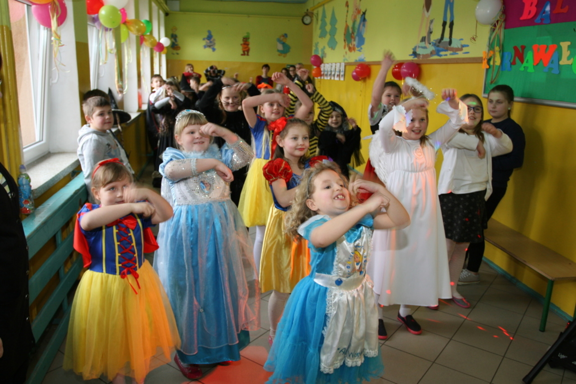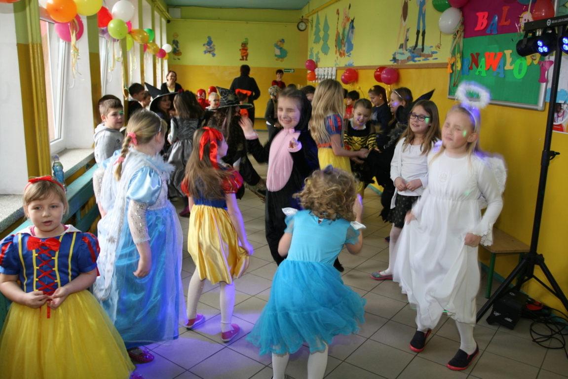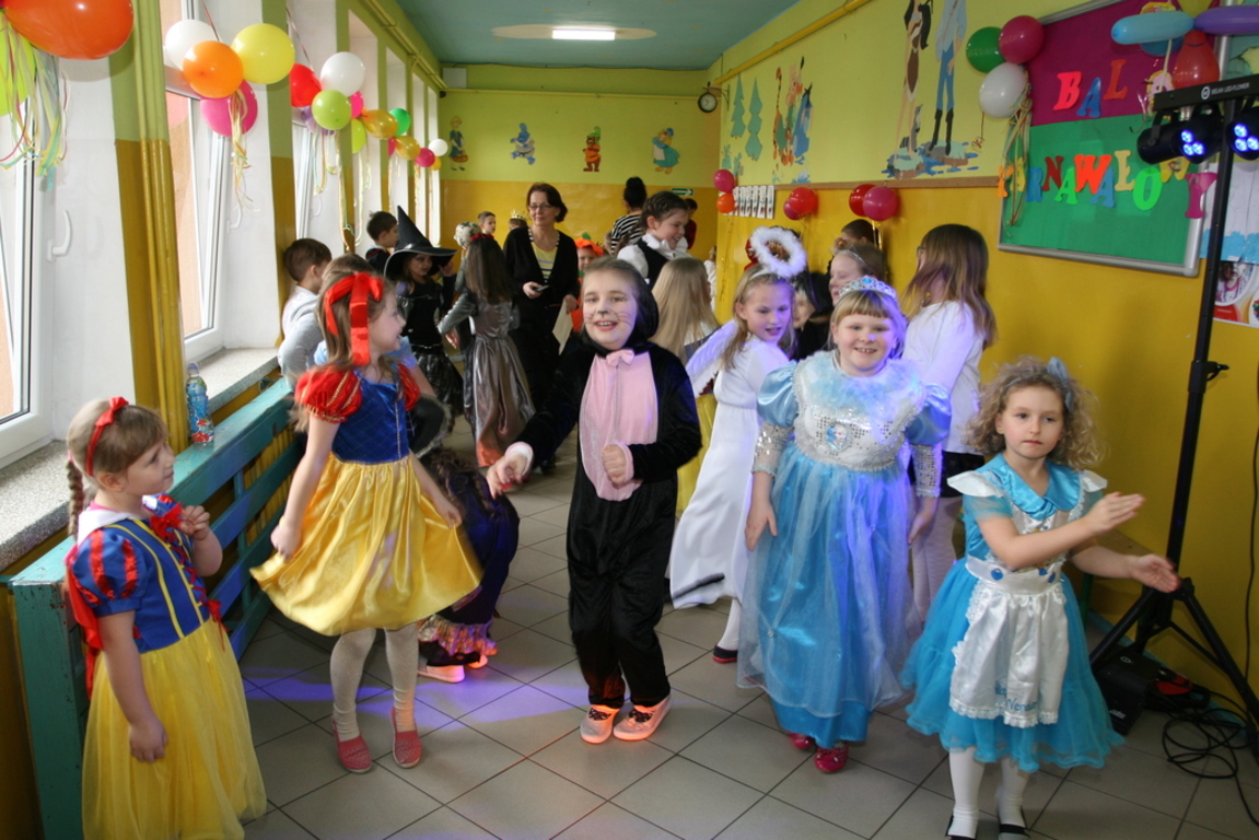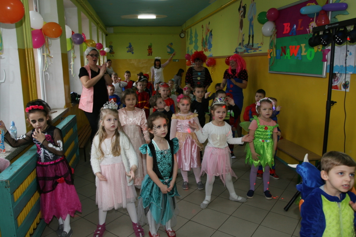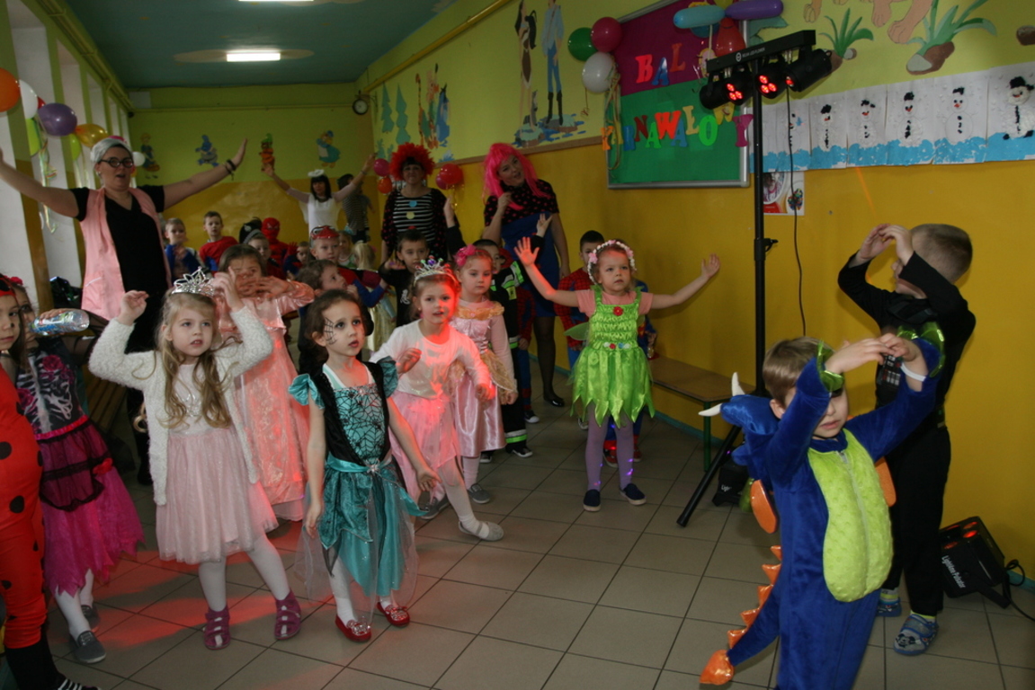 Na pięknie udekorowanej sali pojawiły się kolorowe postaci. Dzieci przebrane były za bohaterów znanych bajek, można było zobaczyć: wróżki, królewny,biedronki, księżniczki, rycerzy, piratów, policjantów,żołnierzy,Żówie Ninja, Batmany, …nie sposób zliczyć i wymienić tych wszystkich postaci. Na sali podczas pląsów było bardzo kolorowo, wszyscy bawili się wesoło, uśmiech nie znikał z twarzy mimo chwilowego zmęczenia. Kiedy czas zabawy dobiegł końca dzieci z żalem opuszczały aulę. Bal umożliwił dzieciom i wychowawcom spędzenie czasu w miłej atmosferze. Wspólna zabawa przyniosła wiele radości naszym wychowankom, a to było głównym celem tego balu.