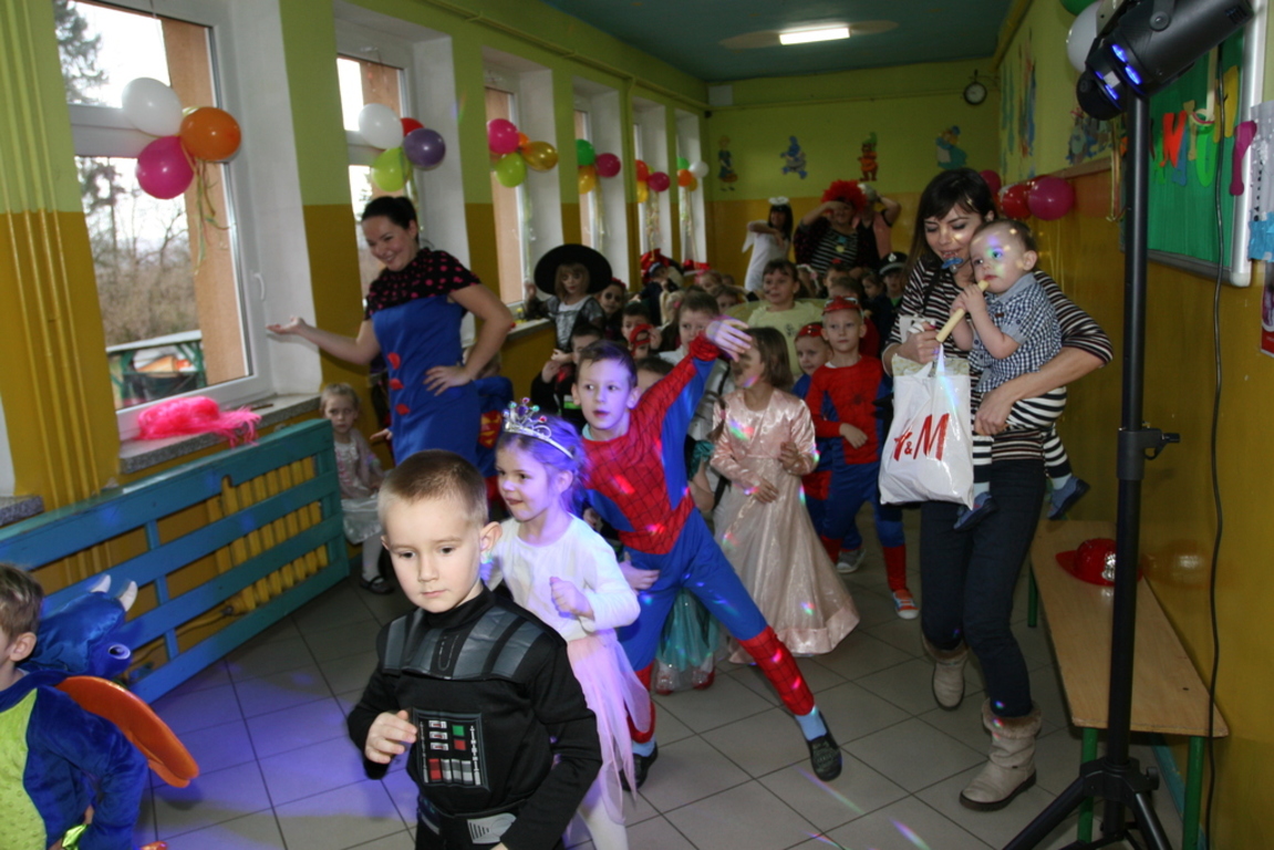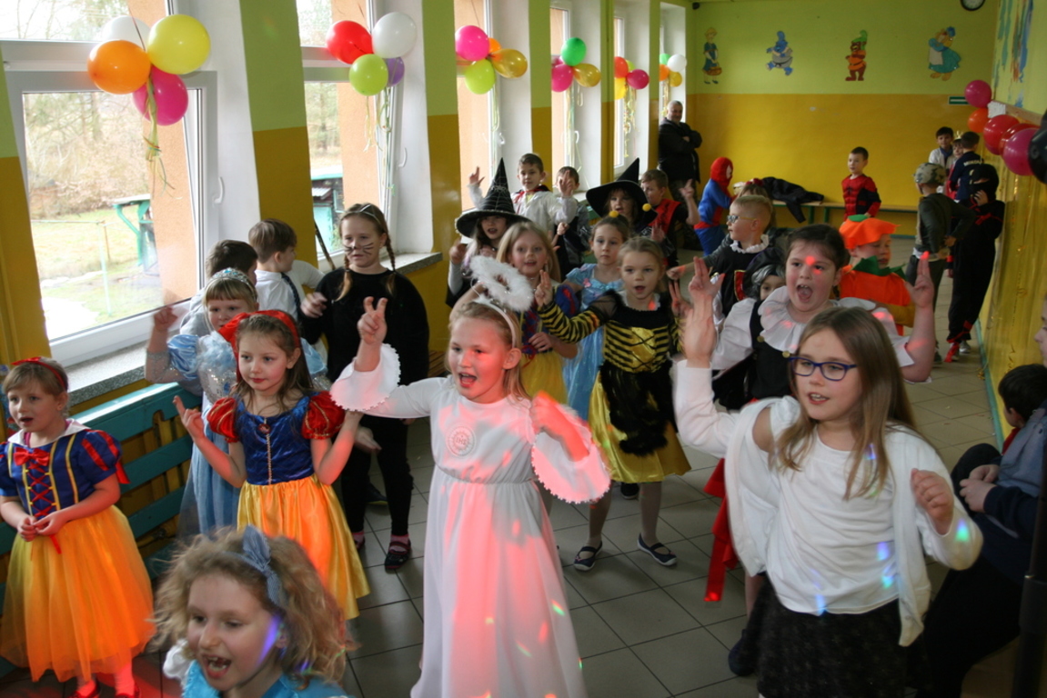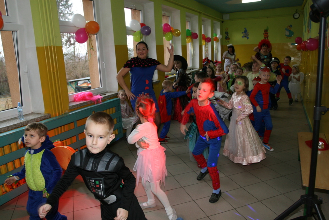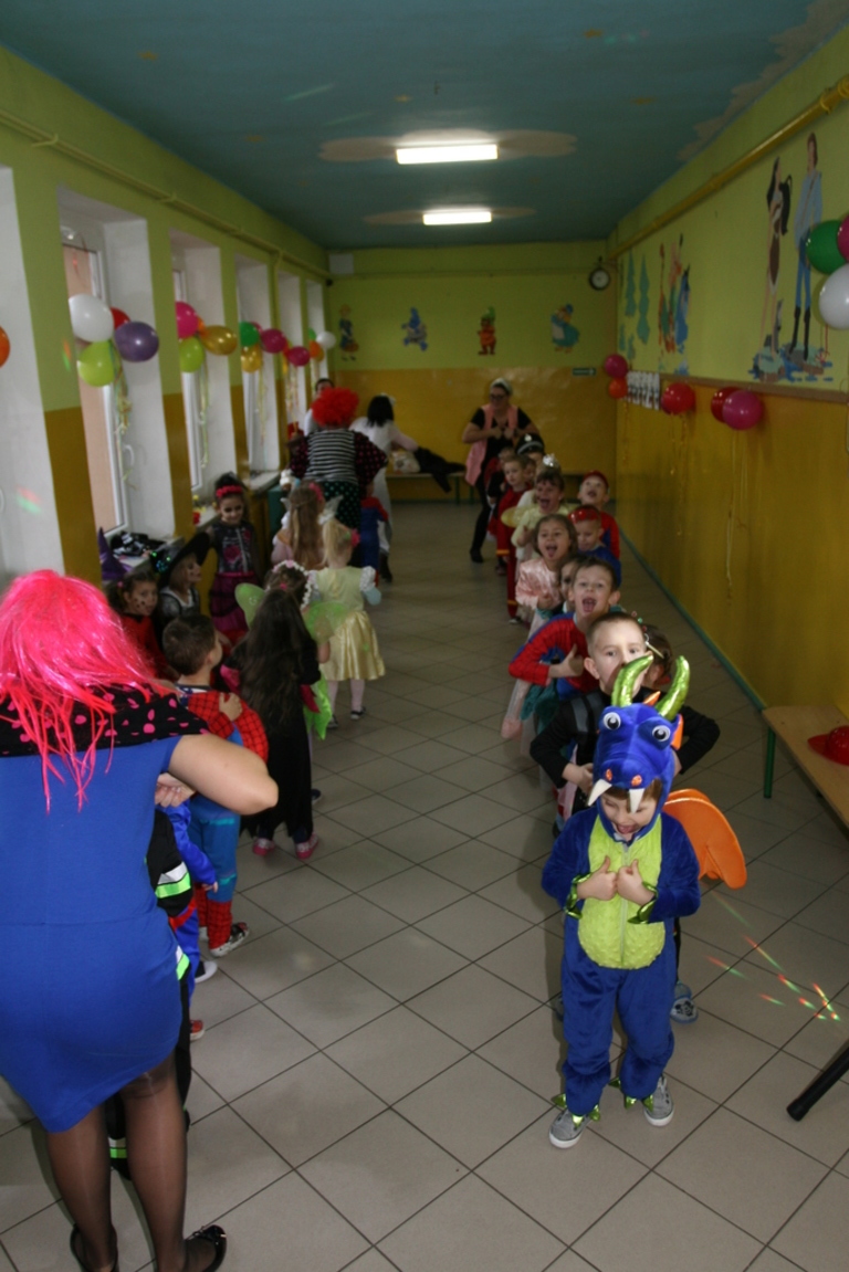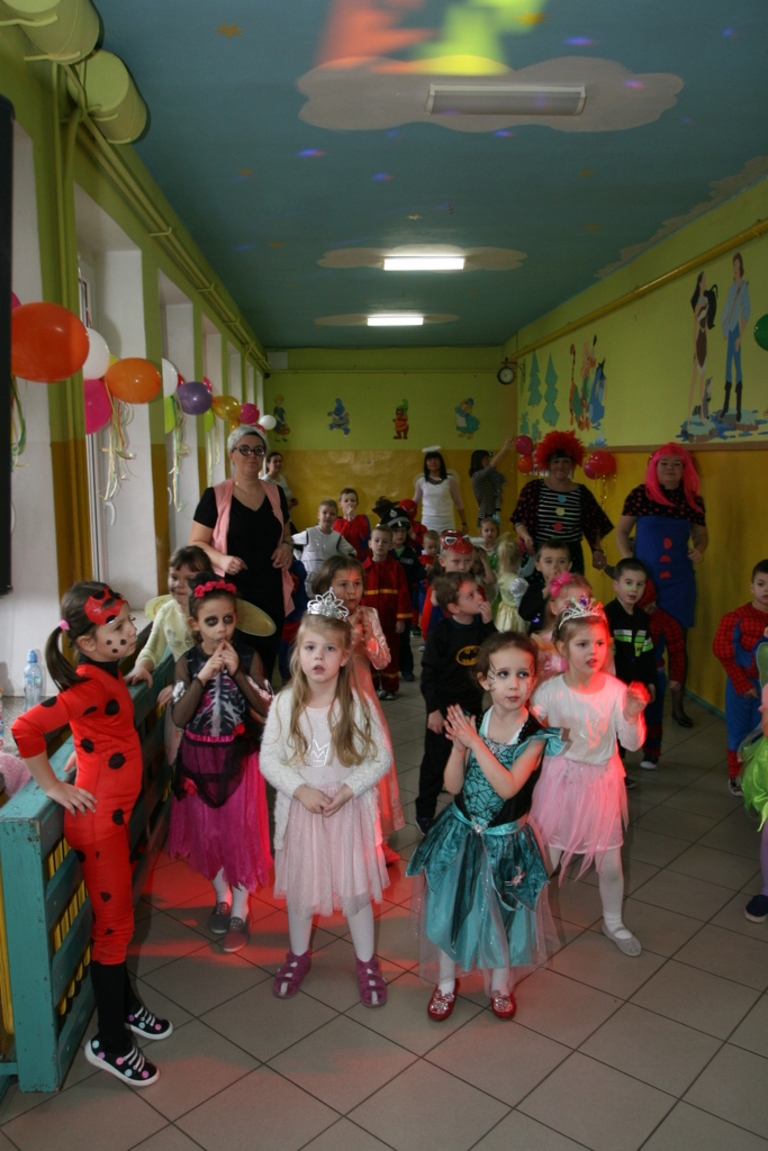 Na pięknie udekorowanej sali pojawiły się kolorowe postaci. Dzieci przebrane były za bohaterów znanych bajek, można było zobaczyć: wróżki, królewny,biedronki, księżniczki, rycerzy, piratów, policjantów,żołnierzy,Żówie Ninja, Batmany, …nie sposób zliczyć i wymienić tych wszystkich postaci. Na sali podczas pląsów było bardzo kolorowo, wszyscy bawili się wesoło, uśmiech nie znikał z twarzy mimo chwilowego zmęczenia. Kiedy czas zabawy dobiegł końca dzieci z żalem opuszczały aulę. Bal umożliwił dzieciom i wychowawcom spędzenie czasu w miłej atmosferze. Wspólna zabawa przyniosła wiele radości naszym wychowankom, a to było głównym celem tego balu.