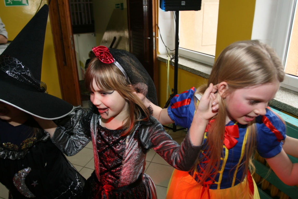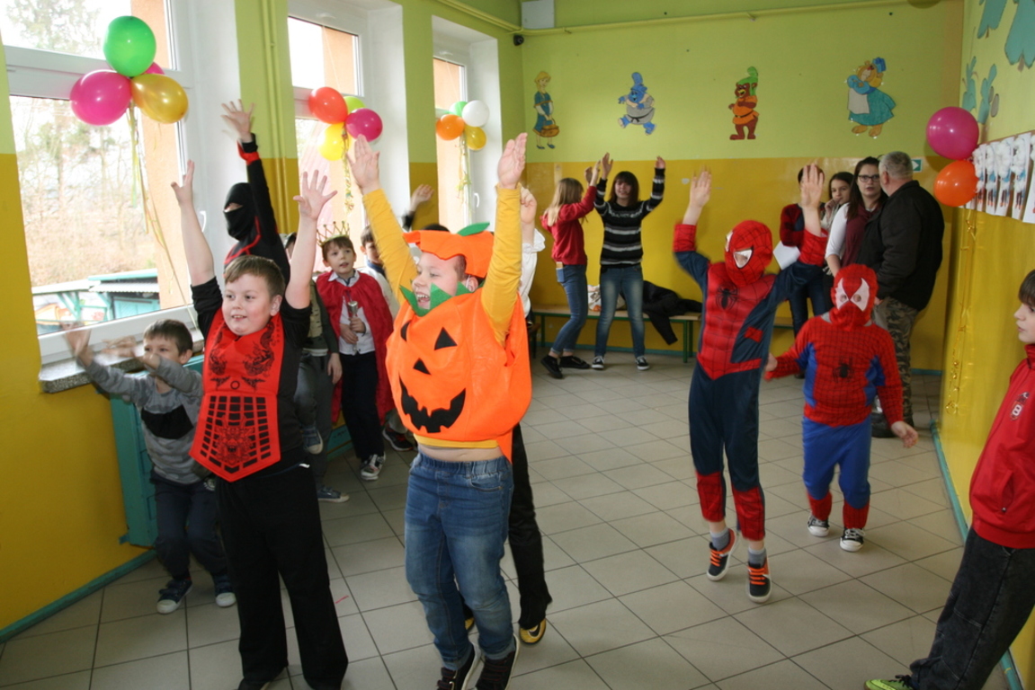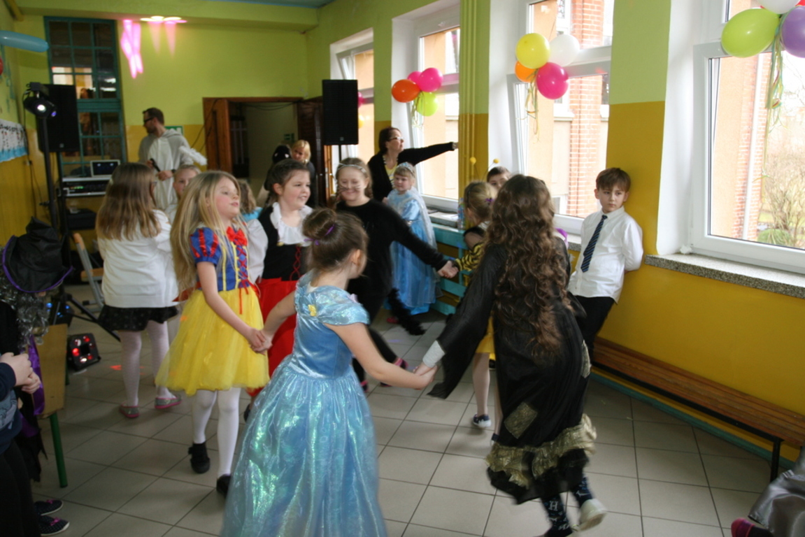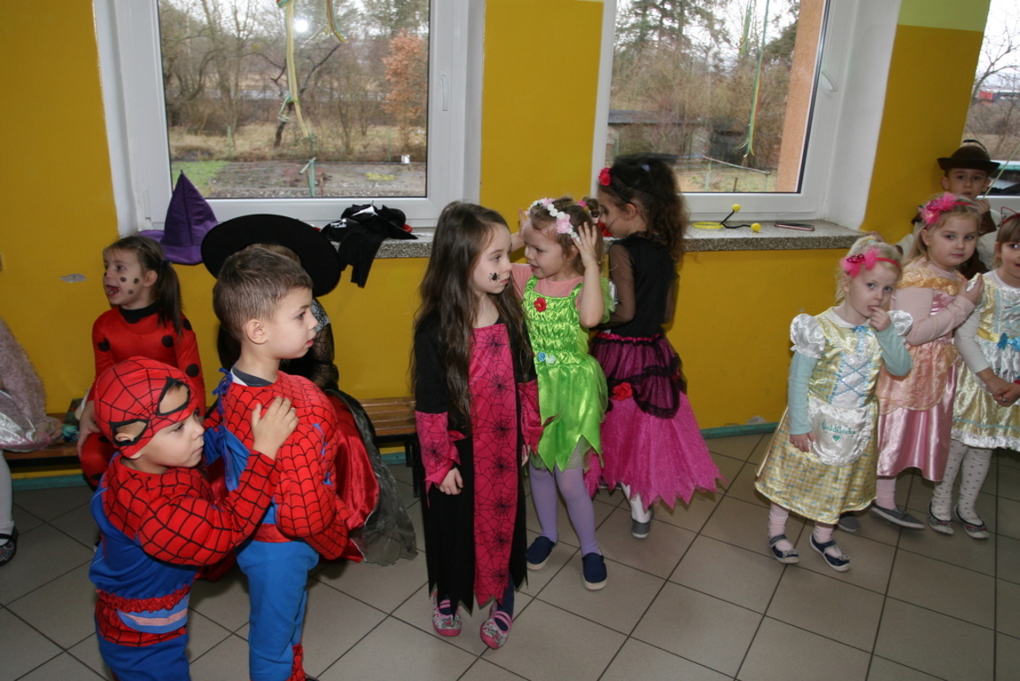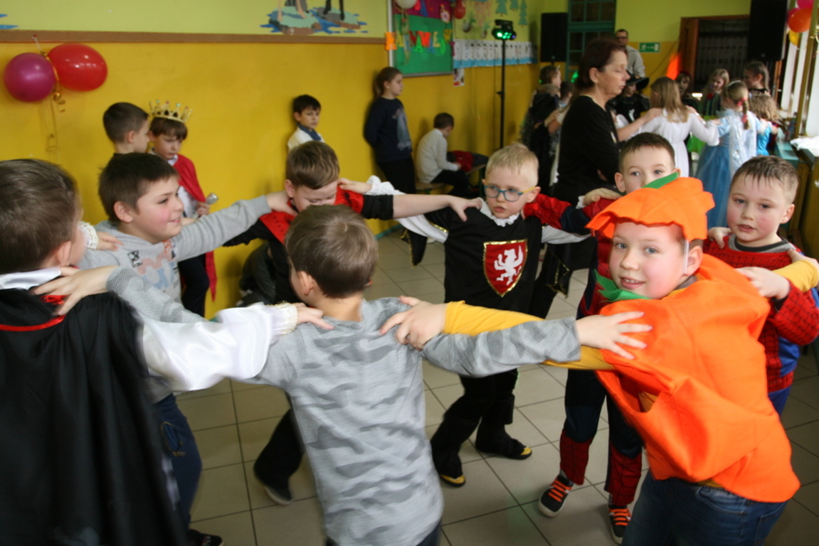 Na pięknie udekorowanej sali pojawiły się kolorowe postaci. Dzieci przebrane były za bohaterów znanych bajek, można było zobaczyć: wróżki, królewny,biedronki, księżniczki, rycerzy, piratów, policjantów,żołnierzy,Żówie Ninja, Batmany, …nie sposób zliczyć i wymienić tych wszystkich postaci. Na sali podczas pląsów było bardzo kolorowo, wszyscy bawili się wesoło, uśmiech nie znikał z twarzy mimo chwilowego zmęczenia. Kiedy czas zabawy dobiegł końca dzieci z żalem opuszczały aulę. Bal umożliwił dzieciom i wychowawcom spędzenie czasu w miłej atmosferze. Wspólna zabawa przyniosła wiele radości naszym wychowankom, a to było głównym celem tego balu.