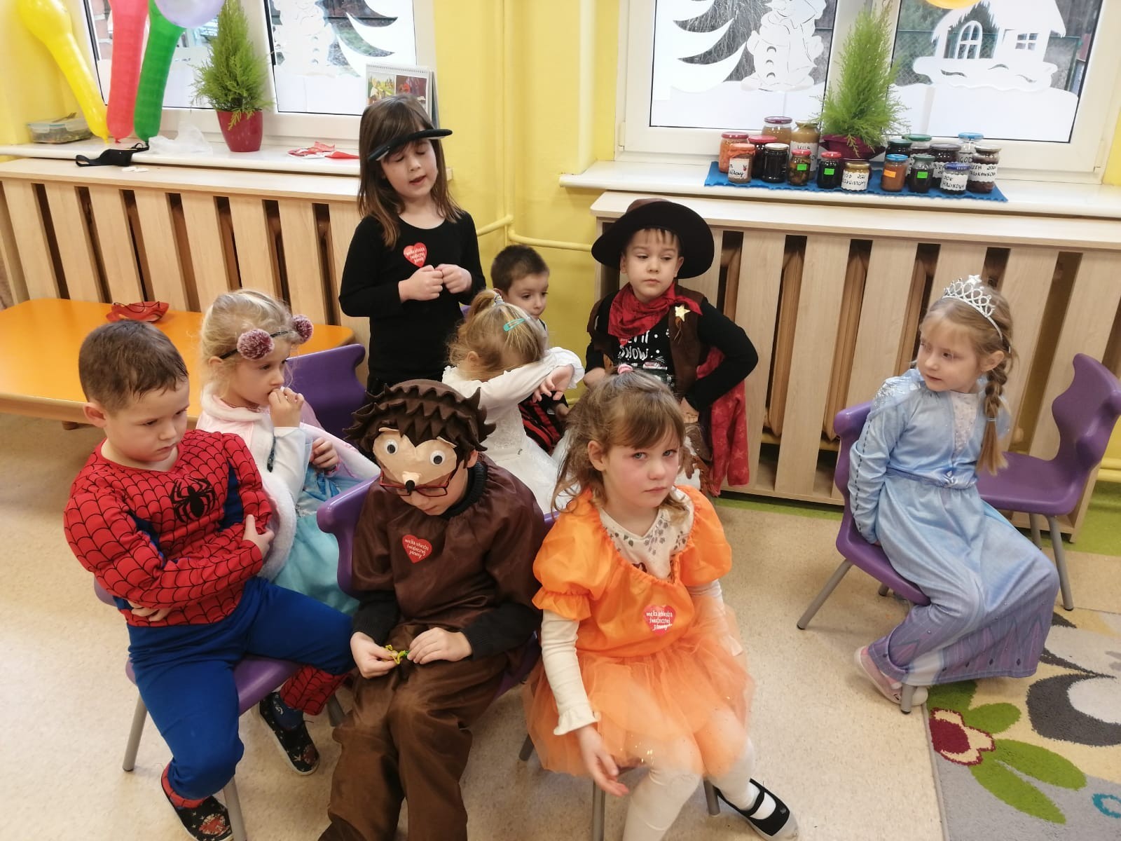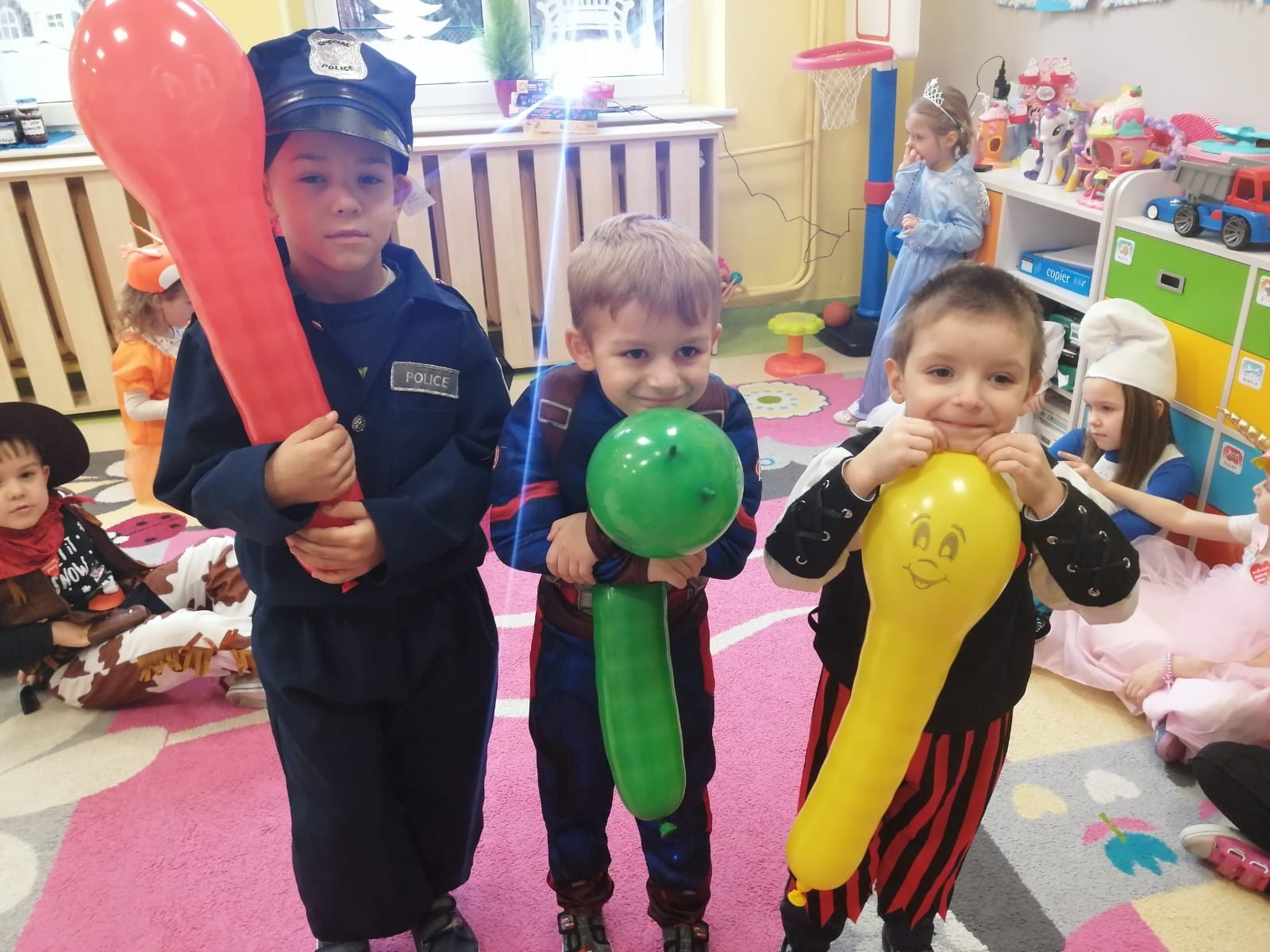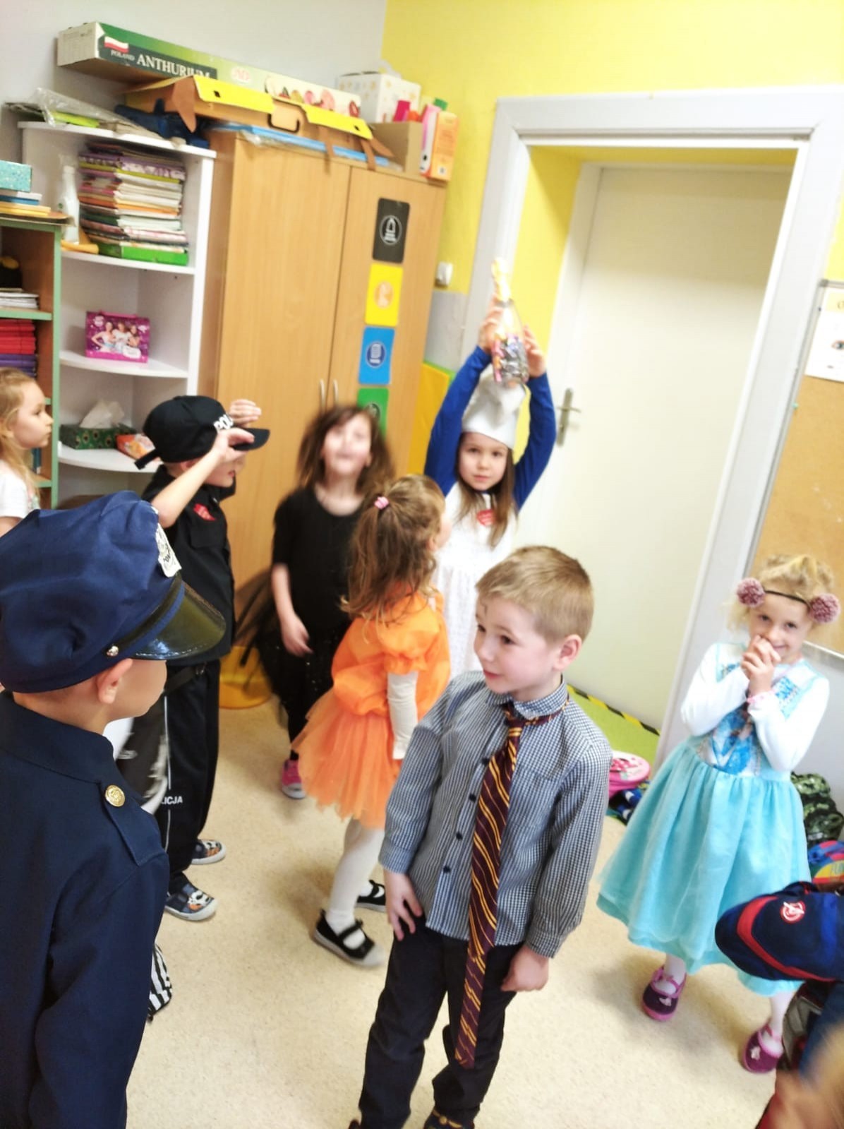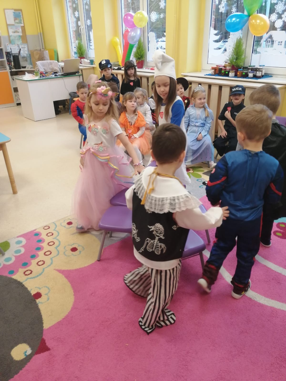 Tego dnia w przedszkolu było głośno i kolorowo ponieważ pojawiły się kolorowe postacie. Dzieci przebrane były za bohaterów znanych bajek, można było też spotkać wróżki, królewny, księżniczki, piratów, policjantów, Harrego Pottera i wiele wiele innych postaci. Wystrój sali wprowadził w radosny nastrój oraz zachęcał wszystkich do wesołej zabawy. Przebierańcy świetnie się bawili uczestnicząc we wspólnych zabawach. Podczas odpoczynku można było skosztować przygotowanych dla każdego przysmaków.