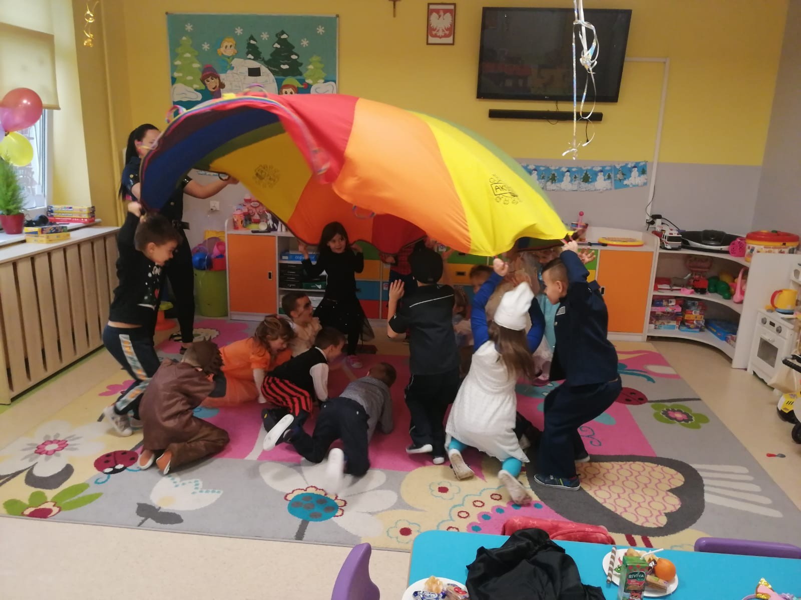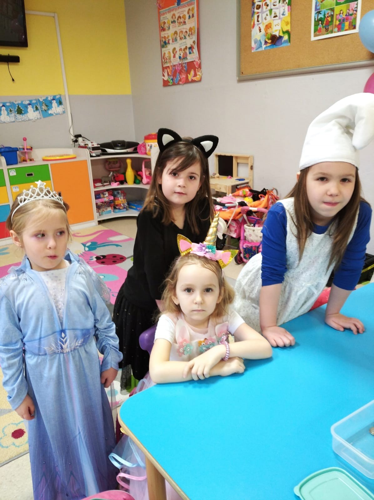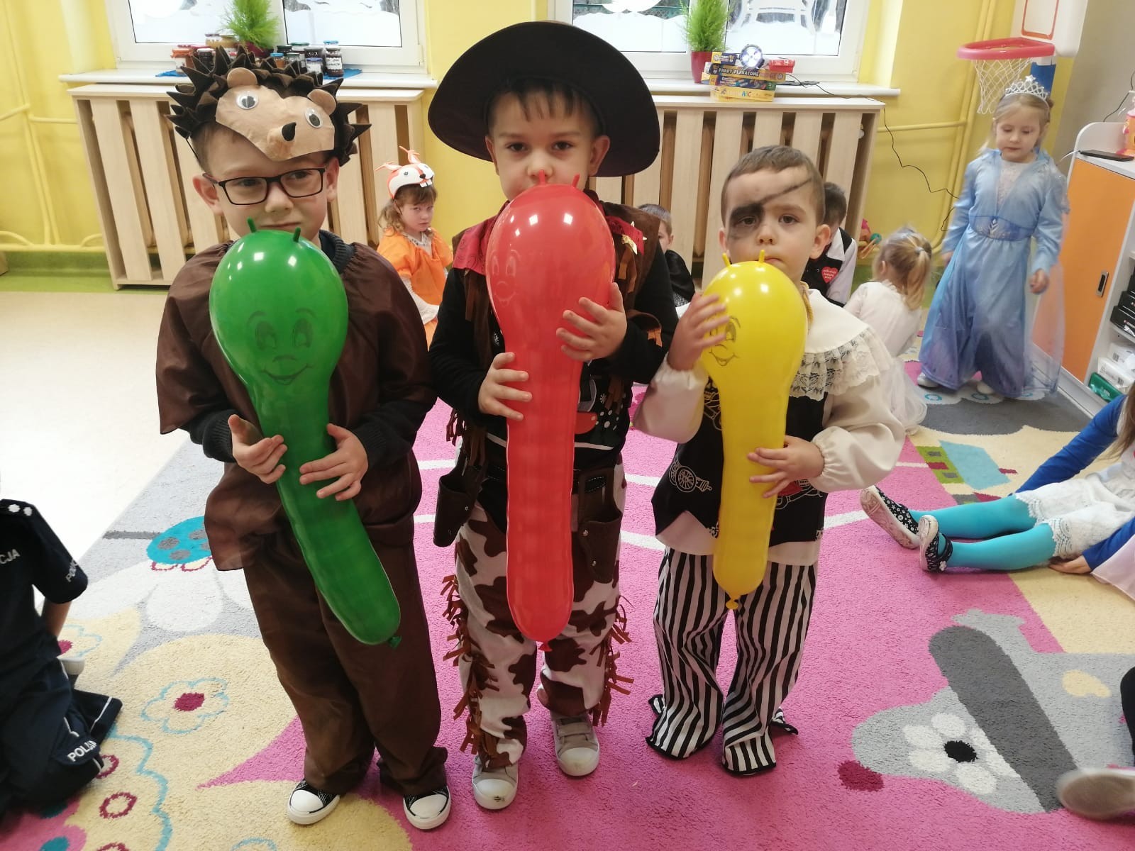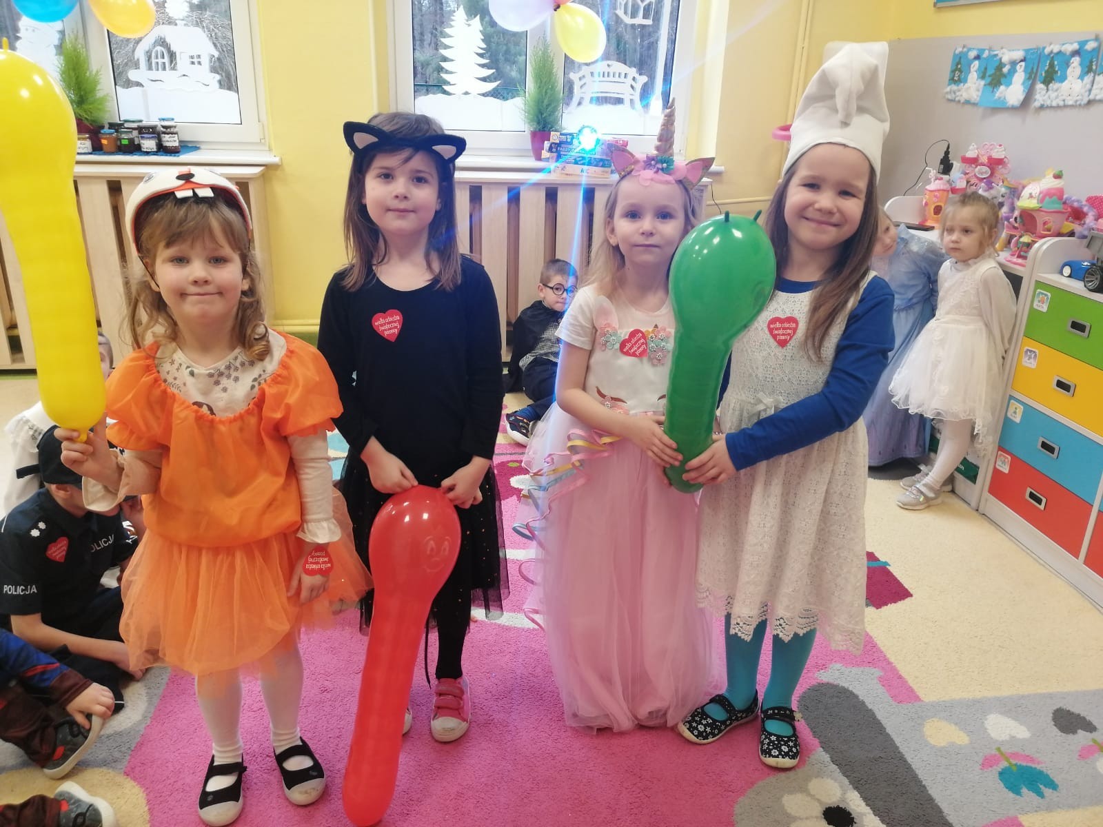 Tego dnia w przedszkolu było głośno i kolorowo ponieważ pojawiły się kolorowe postacie. Dzieci przebrane były za bohaterów znanych bajek, można było też spotkać wróżki, królewny, księżniczki, piratów, policjantów, Harrego Pottera i wiele wiele innych postaci. Wystrój sali wprowadził w radosny nastrój oraz zachęcał wszystkich do wesołej zabawy. Przebierańcy świetnie się bawili uczestnicząc we wspólnych zabawach. Podczas odpoczynku można było skosztować przygotowanych dla każdego przysmaków.