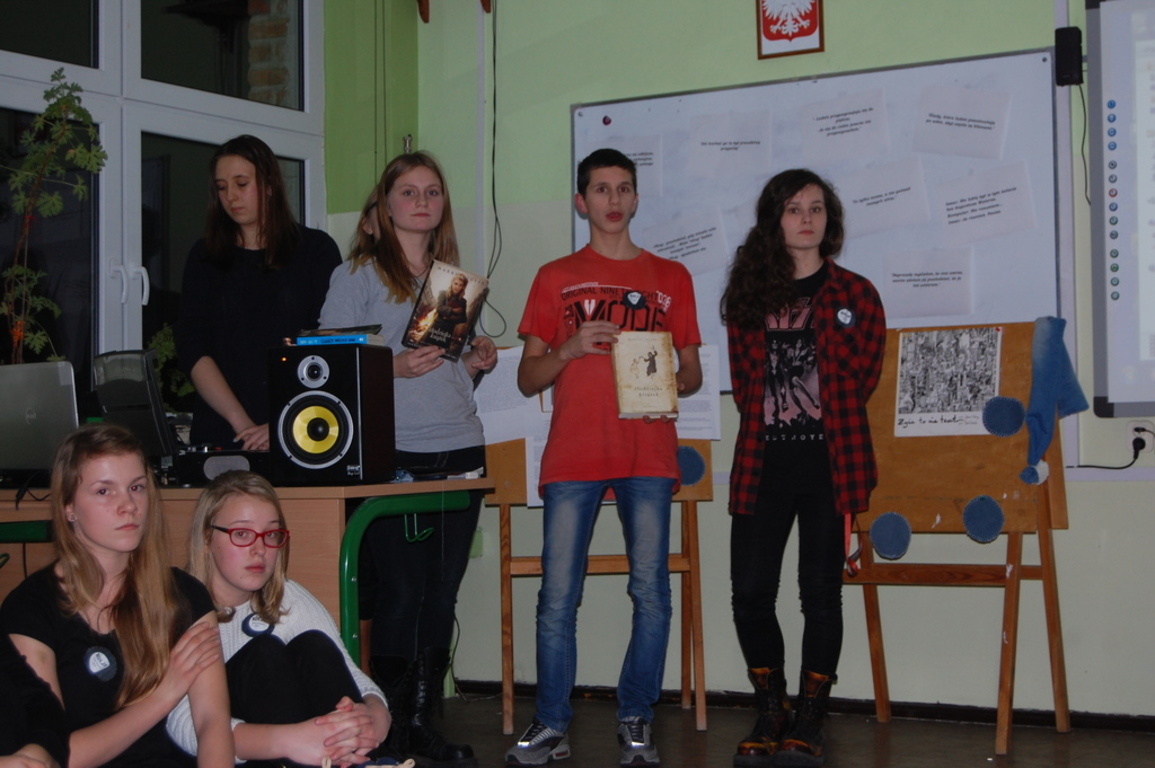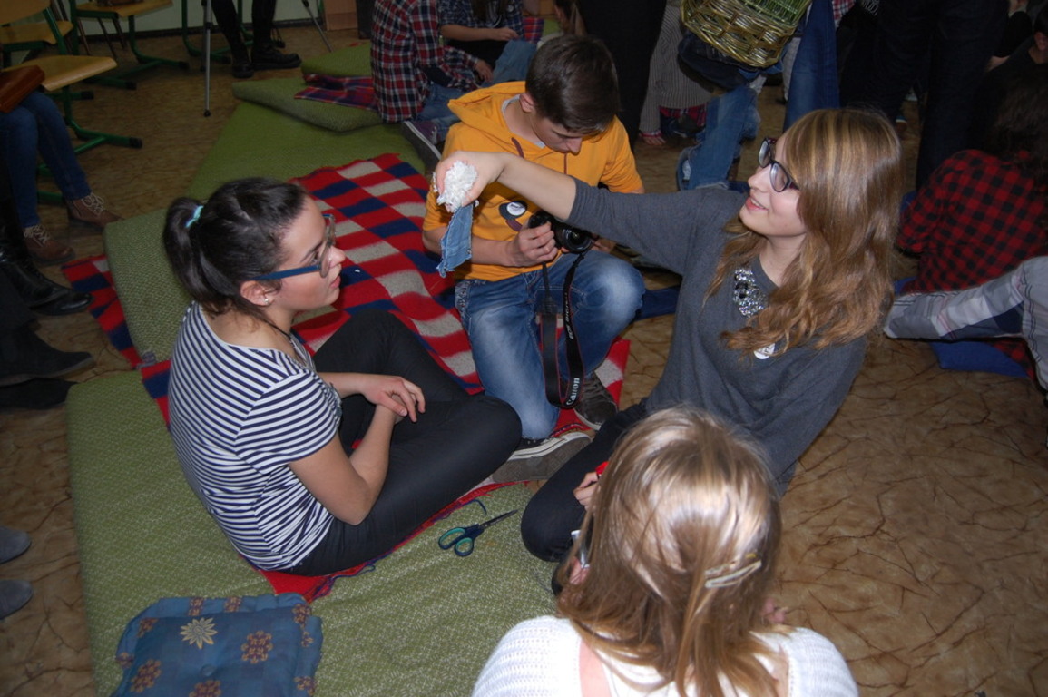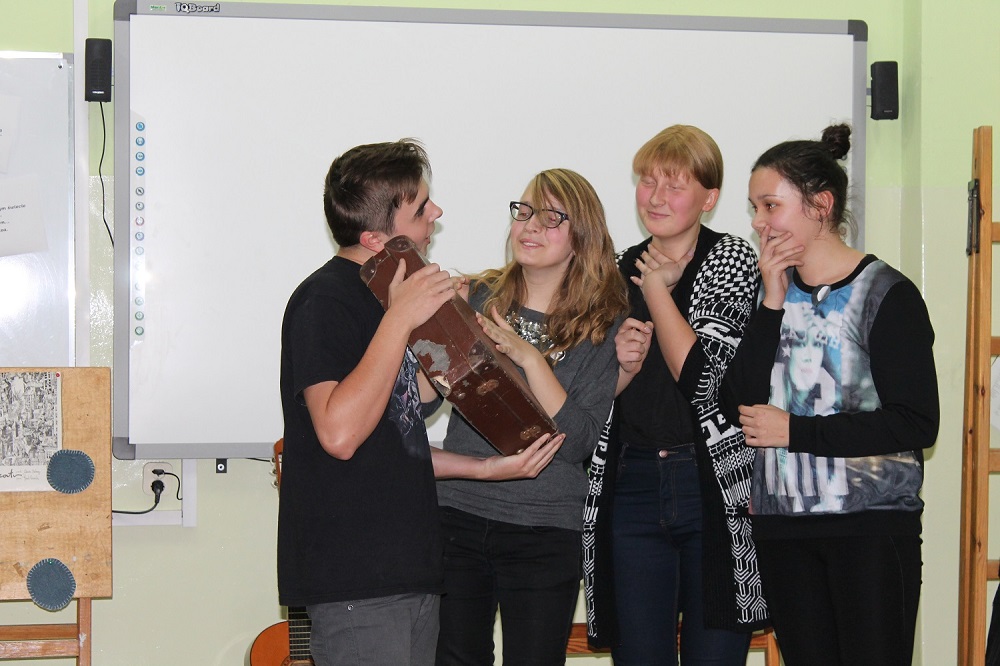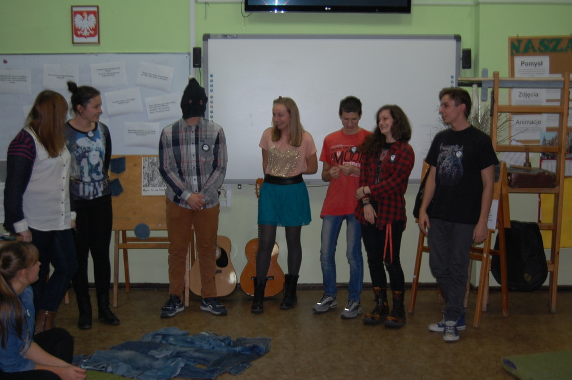 Czy lekcja języka polskiego może trwać kilka godzin? Może! Dnia 5 grudnia uczniowie klasy III gimnazjum pod kierunkiem nauczycielki języka polskiego, Grażyny Hinc-Kotyło, przeprowadzili drugą już edycję " Bardzodługiejlekcjijęzykapolskiego" ( Bardzo długiej lekcji języka polskiego). Lekcja trwała trzy godziny ( od 18.00 do 21.00), a wzięli w niej udział gimnazjaliści z Łebienia, Nowej Wsi Lęborskiej i reprezentacja Szkoły Podstawowej nr 8 w Lęborku. Ideą projektu było zachęcenie młodych ludzi do ciekawego i twórczego spędzania czasu wolnego. Nasi gimnazjaliści przygotowali dla gości tzw. stacje: Stacja Muzyka, Stacja Książka , Stacja Stachura, Stacja Teatr i Stacja Jadłodajnia. Zadaniem na Stacji Muzyka było ułożenie podkładu muzycznego do tekstów Edwarda Stachury i odśpiewanie utworu- gitary poszły w ruch i koncert gotowy. Stacja Książka- członkowie fanklubu "Złodziejki książek" zachęcali do lektury powieści, która w naszej szkole znalazła wielu wielbicieli. Zaprezentowali również kolejną książkę, która wg nich zasługuje na uznanie- " Gwiazd naszych wina"- jeden egzemplarz przekazany został na ręce Pani Dyrektor do biblioteki szkolnej. Stacja Stachura- to czas poświęcony artyście, którego poezja naszym gimnazjalistom bardzo przypadła do gustu. Oprócz czytania jego tekstów, prezentacji multimedialnej i wygłoszenia "Confiteoru" przez wszystkich uczniów, na gimnazjalistów czekało zadanie nietypowe- uszycie z dżinsu czapki dla Mikołaja. Śmiechu było co nie miara. Stacja Teatr to gratka dla aktorów . Zagranie scenek z oryginalnymi rekwizytami ( miotła z chrustu, walizka z dziurą wygryzioną przez myszy, miecz Excalibur i gumowa rękawica na tyczce udająca... wymiona- to nie lada wyzwanie. Podczas krótkich przerw można było degustować wspaniałe potrawy, słodycze i owoce. Wspólnie spędzony czas na pewno nie był czasem straconym. Goście wystawili nam bardzo dobrą ocenę, może dojdzie do trzeciej edycji tej lekcji, może w szerszym gronie.