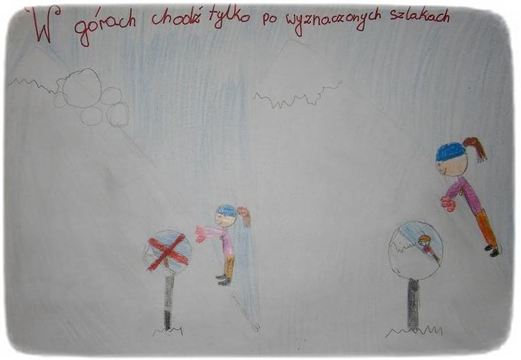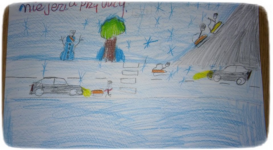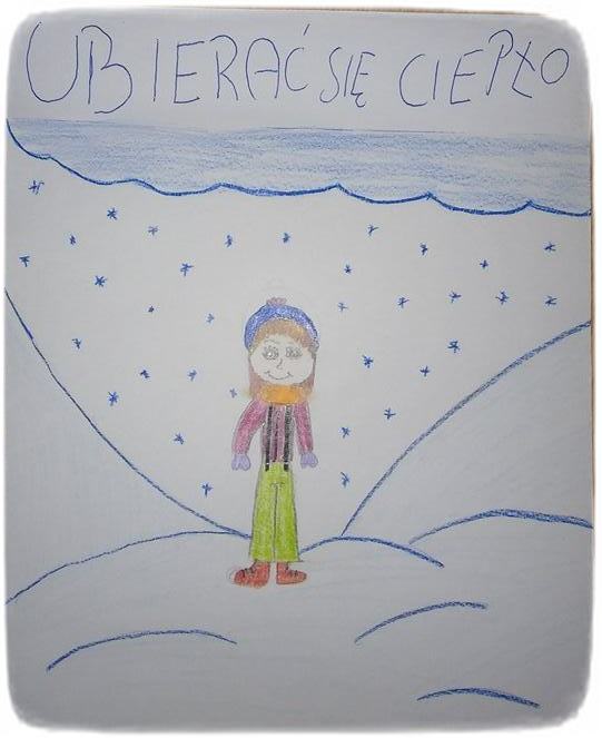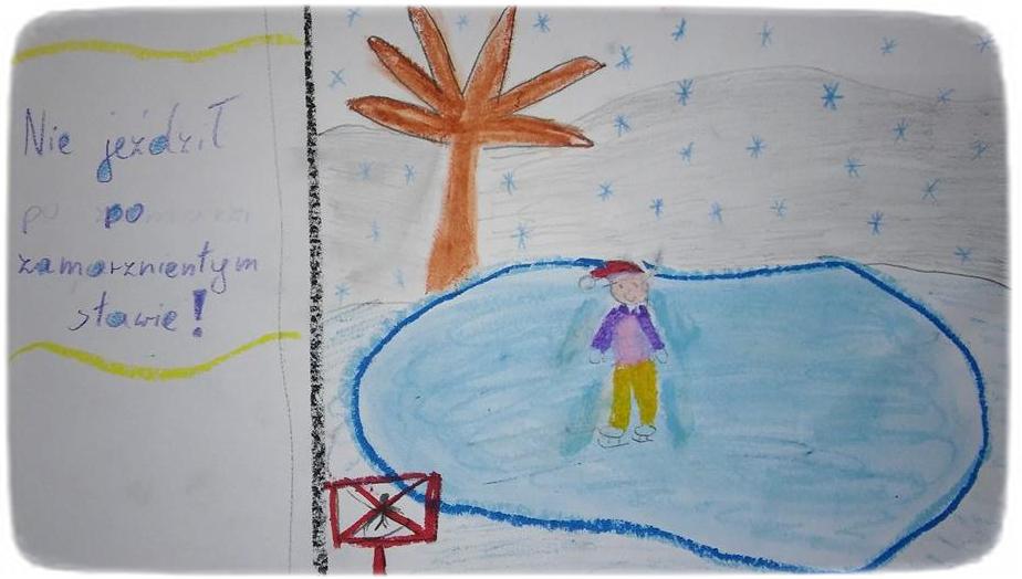Klasa 5 wraz z wychowawcą stworzyła małą galerię prac plastycznych przedstawiających zasady bezpieczeństwa podczas ferii zimowych.