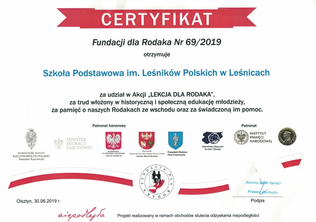 W roku szkolnym 2018/2019 odbywała się druga edycja akcji "Lekcja dla Rodaka", polegającej na zorganizowaniu przez szkoły zajęć edukacyjnych na temat historii Polaków w Kazachstanie, na Syberii i na Kresach.