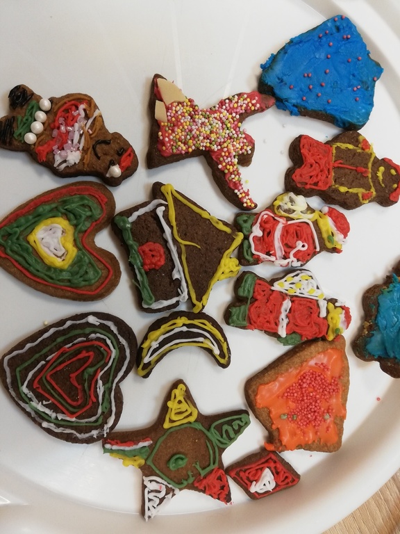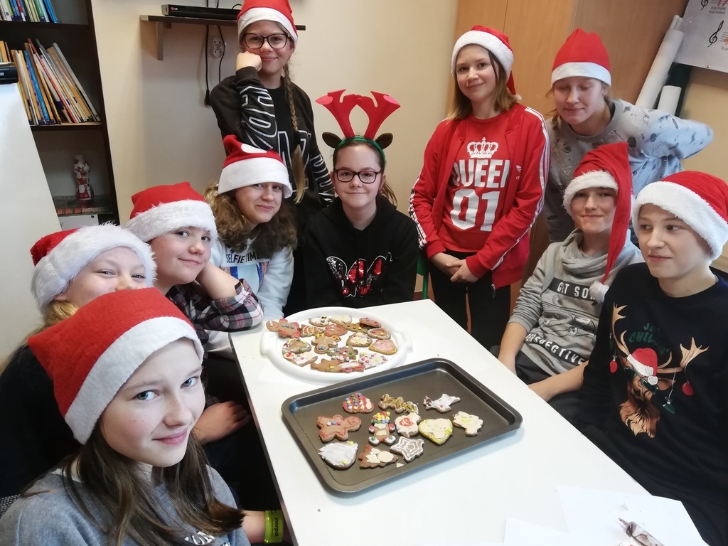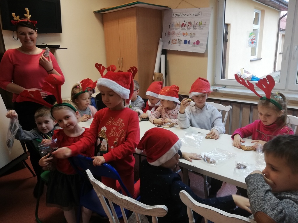 Pachnące i pięknie udekorowane pierniczki wprowadziły nas w świąteczną atmosferę. Wspaniałe maluszki z grupy 5-cio latków i oddziału przedszkolnego, wykrawały ciastka nadając im świąteczne kształty. Uczniowie z klasy III, IV, VI i VII uczęszczjący na lekcje języka kaszubskiego z ogromną pieczołowitością wypiekali je i ozdabiali. A dopełnieniem całego wydarzenia były mikołajkowe stroje, które dodały uroku i przyniosły mnóstwo radości.