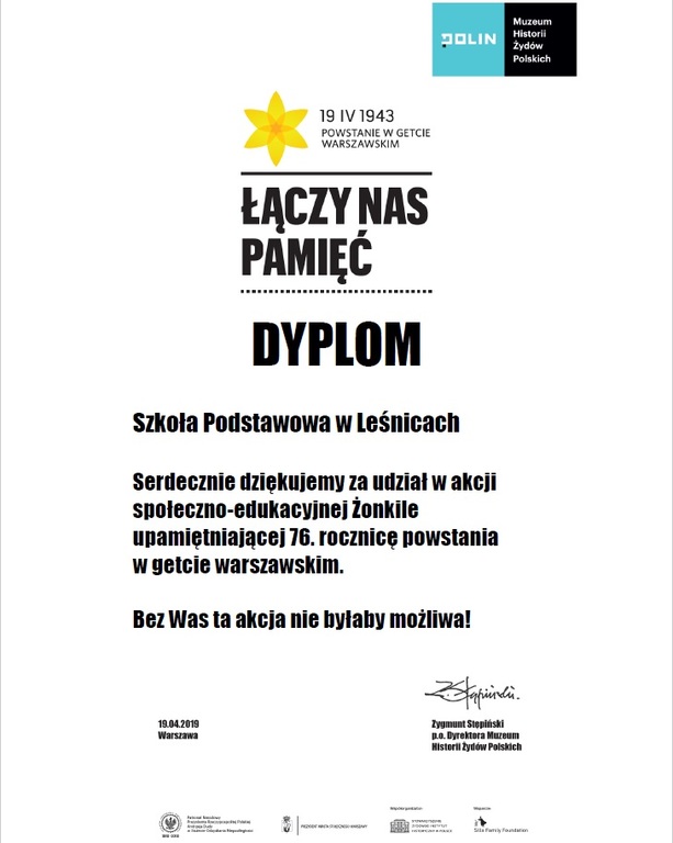 Muzeum Historii Żydów Polskich POLIN w Warszawie podsumowało coroczną akcję społeczno - edukacyjną "Żonkile" - uczniowie naszej szkoły otrzymali dyplom za udział w tej kampanii. Jesteśmy dumni, że "łączyła nas pamięć".