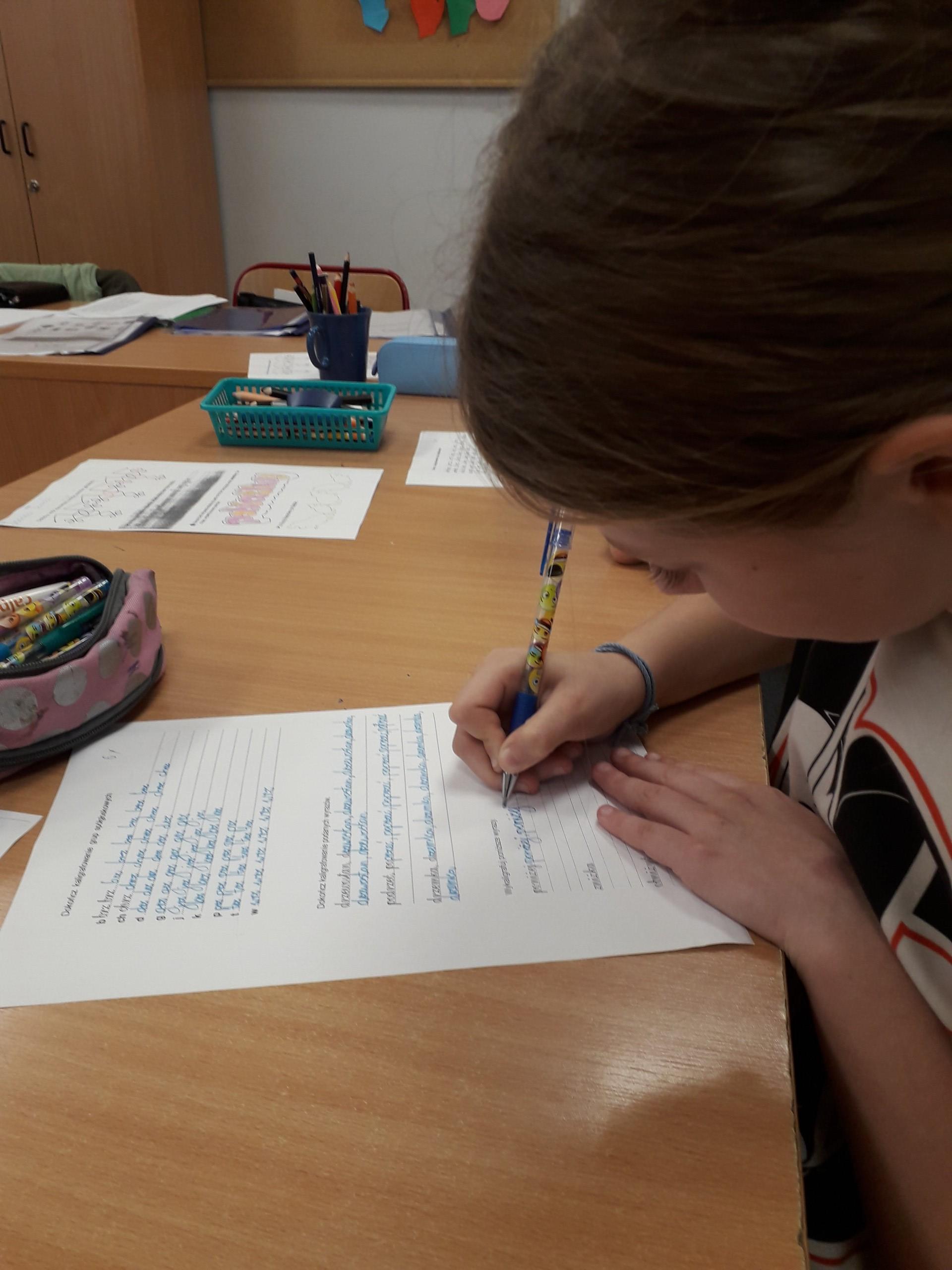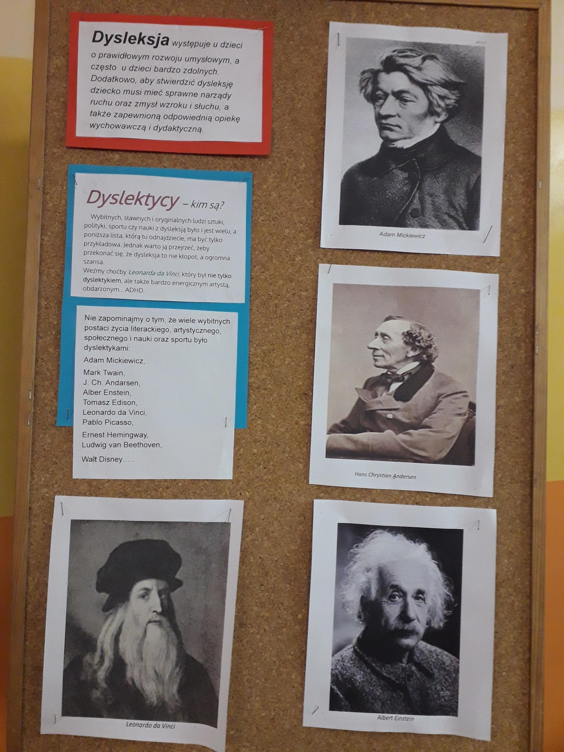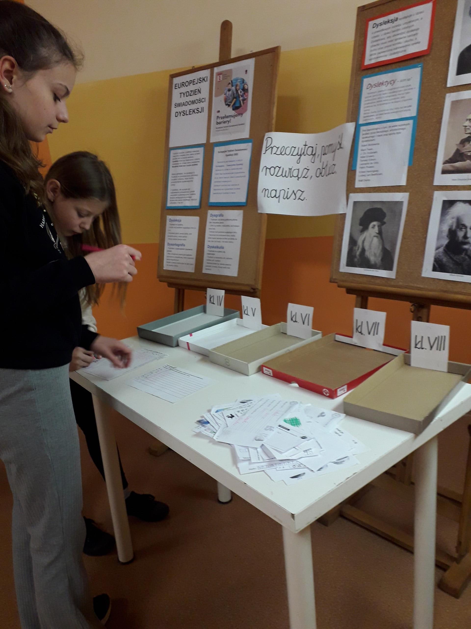 Październik jest miesiącem, w którym Europejskie oraz Polskie Towarzystwo Dysleksji zaprasza do udziału w akcji społecznej, której celem jest przypomnienie, że wśród nas – naszych kolegów, są uczniowie o specyficznych potrzebach edukacyjnych. W naszej szkole na holu pojawiła się gazetka związana z tematyką specyficznych trudności w uczeniu się. Wszyscy mogli dowiedzieć się co to jest dysleksja, jakie są jej objawy, jak można pomóc. Wspomniane również były słynne osoby z dysleksją. Uczniowie naszej szkoły byli zaangażowani w różne formy aktywności edukacyjnych. „Starsi czytają młodszym”-Uczniowie z kl.IV-VIII uczestniczący w zajęciach korekcyjno – kompensacyjnych, w oddziale przedszkolnym czytali bajki dla najmłodszych, a w klasach I-III lektury: Pięciopsiaczki oraz Plastusiowy pamiętnik. Do poznanego fragmentu rysowały lustracje. W następnym dniu zaobserwować można było wielkie poruszenie wszystkich, którzy brali udział w szkolnej zabawie TROPICIELE ORTOGRAII. Celem zabawy było odszukiwanie wyrazów z trudnością ortograficzną umieszczonych w pojemniczkach. Doskonalili też zdolność logicznego myślenia poprzez gry krzyżówki matematyczne. Kolejnego dnia, uczestnicy zajęć terapii pedagogicznej zmierzyli się treningiem grafomotorycznym - zabawy i ćwiczenia sprzyjające poprawie poziomu graficznego pisma.
