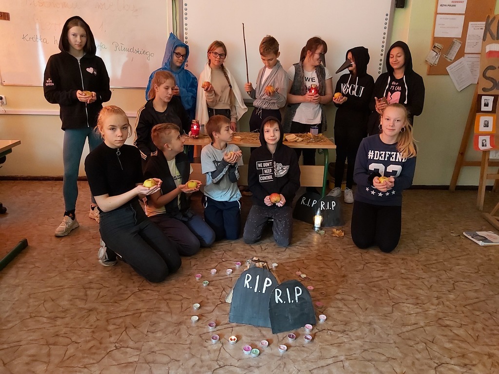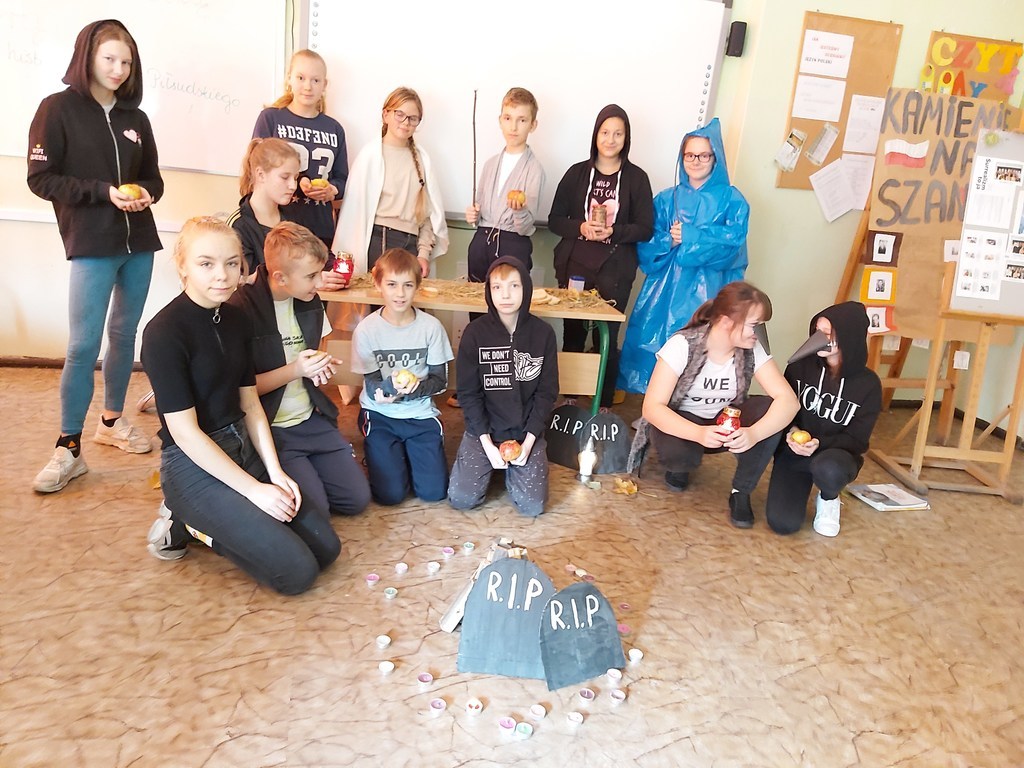 ŻYCIE TO TEATR, TEATR TO ŻYCIE. REKWIZYTY, SCENOGRAFIA, KOSTIUMY... KLASA VII NA JĘZYKU POLSKIM PRZYGOTOWAŁA INSCENIZACJĘ "DZIADÓW" ADAMA MICKIEWICZA. NIE ZABRAKŁO GUŚLARZA, WIDMA, CHÓRU. AKTORZY STARANNIE WYPOWIADALI SWOJE KWESTIE, BO TEMATYKA DRAMATU JEST POWAŻNA I ISTOTNA. JEDNOGŁOŚNIE STWIERDZILI, ŻE NAJLEPIEJ UCZYĆ SIĘ, GRAJĄC ROLE I BAWIĄC SIĘ.