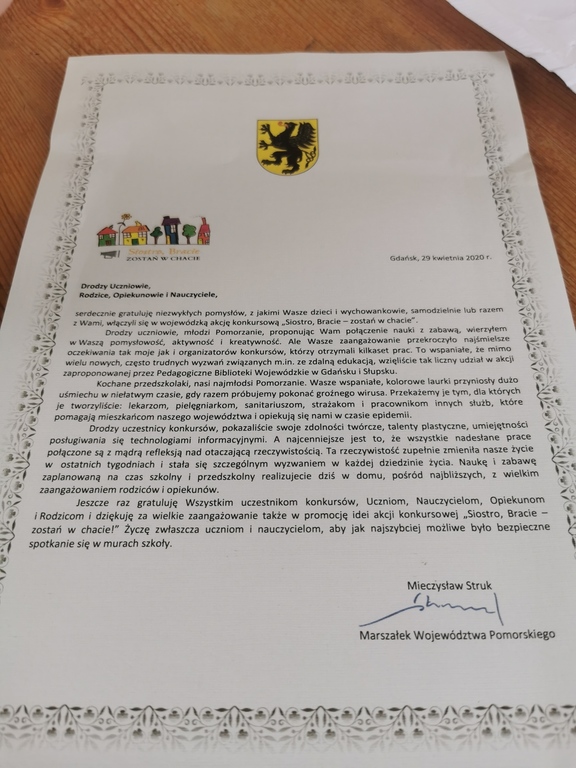W kwietniu odbyła się akcja - Siostro, Bracie zostań w chacie - organizowana przez Pedagogiczne Biblioteki Wojewódzkie w Gdańsku i Słupsku. Akcja polegała na stworzeniu laurek , które poźniej zostaną przekazane lekarzom. pielęgniarkom, sanitariuszom, strażakom i pracownikom innych służb, które pomagają mieszkańcom naszego województwa i opiekują się nami w czasie epidemii.