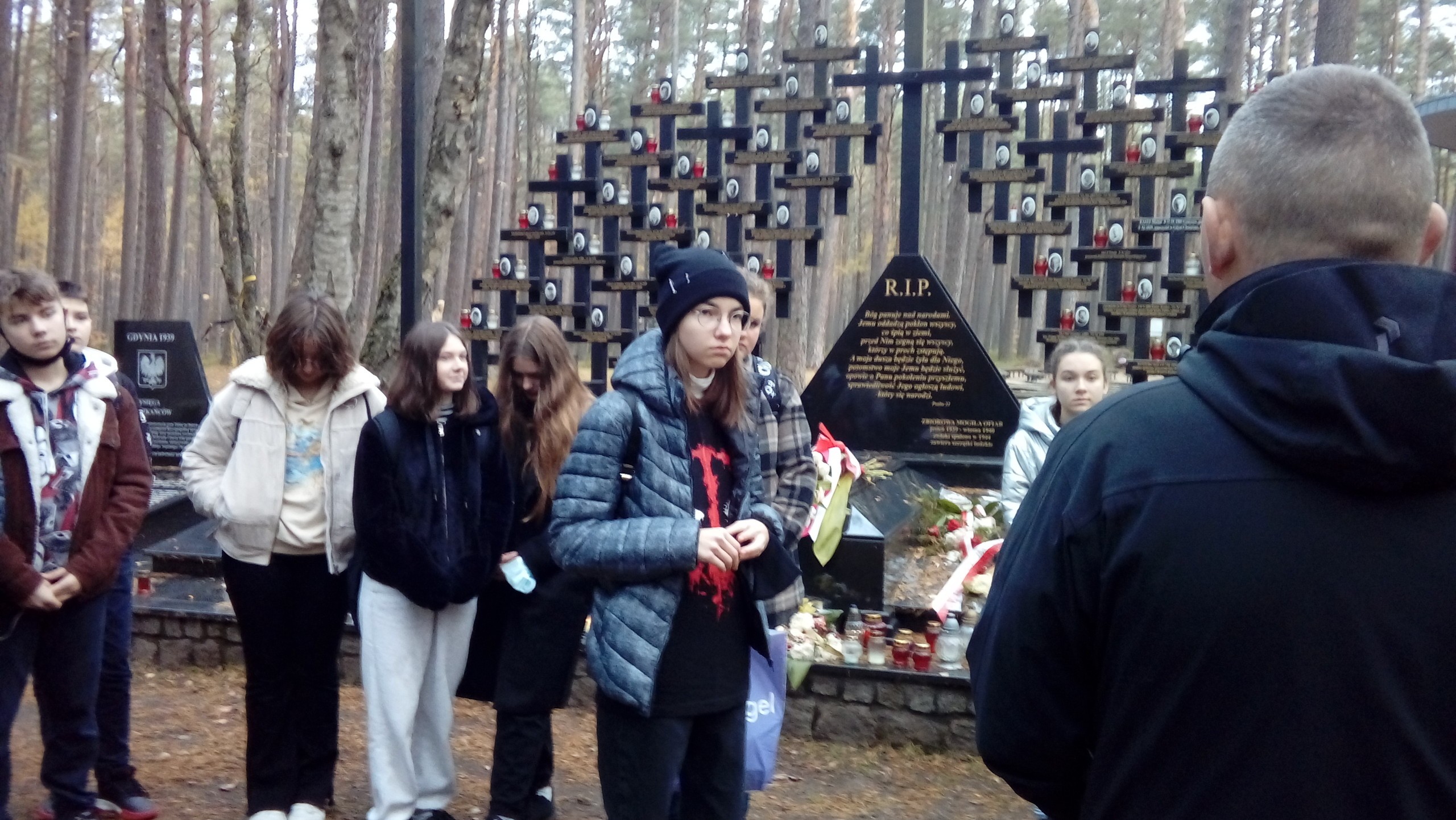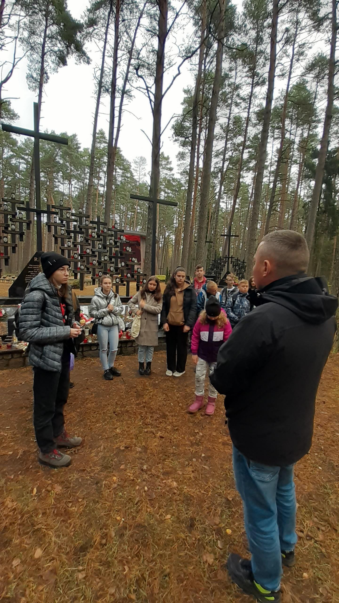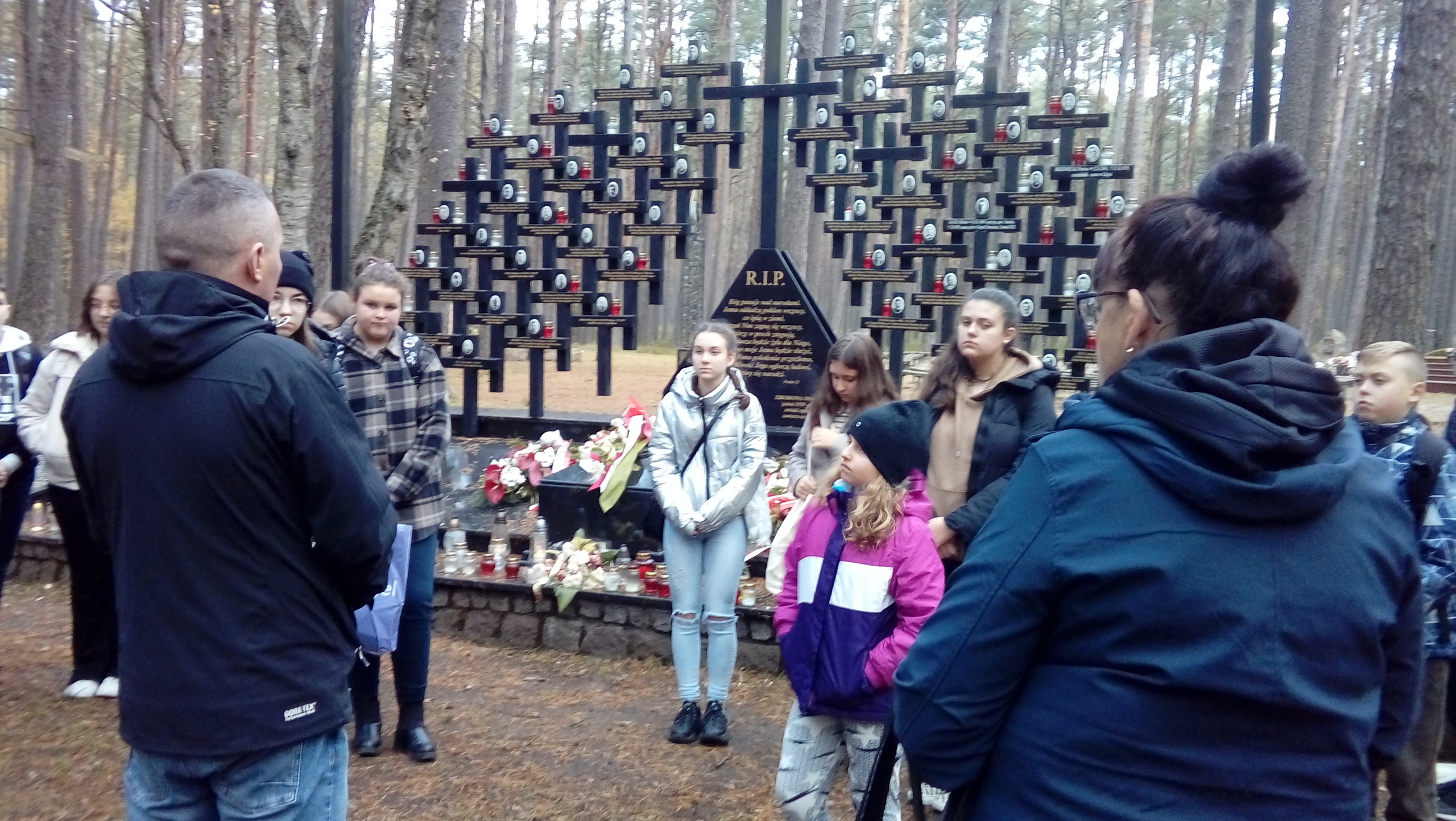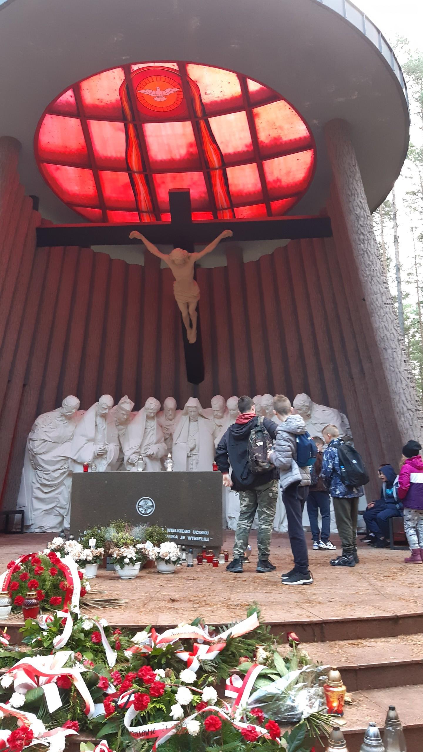 Dnia 26 października 2021r. uczniowie klasy VIII, uczący się języka kaszubskiego pojechali na wycieczkę do Piaśnicy. Celem podróży było odwiedzenie miejsca największej zbrodni ludobójstwa w województwie pomorskim w czasie II wojny światowej. Przy pomniku zamordowanych dzieci wspólnie modliliśmy się a potem udaliśmy się przed ołtarz główny. Tam Ksiądz Tadeusz Drobinski przybliżył nam historię tego miejsca. Słowa księdza zrobiły na nas ogromne wrażenie. Następnie w lasach piaśnickich mogliśmy z bliska przyjrzeć się mogiłom pomordowanych Kaszubów. Na pamiątkę naszych odwiedzin złożyliśmy kwiaty oraz zapaliliśmy znicze. To była bardzo potrzebna i pouczająca lekcja historii.