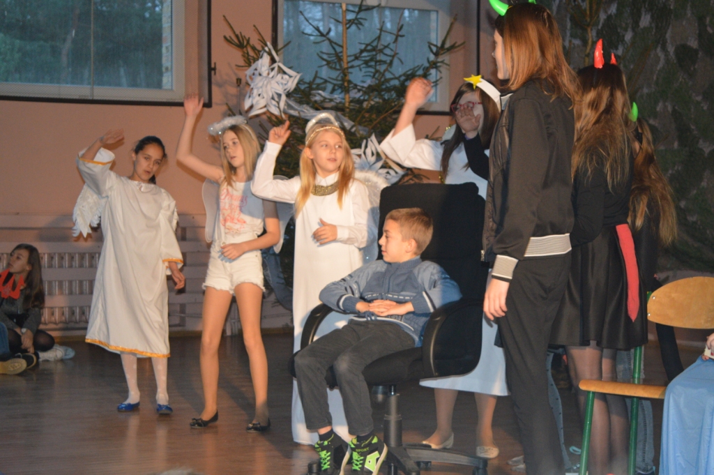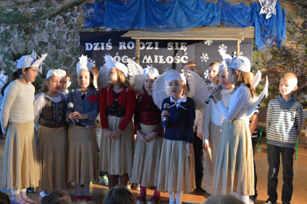 Jak nakazuję tradycja pod koniec grudnia w naszej szkole odbywa się specjalny świąteczny apel bożonarodzeniowy. Tym razem uczniowie starszych klas przygotowali pod kierunkiem pani i. A. Treder i pan J. Greszty specjalny program świąteczny pt. "Jasełka". Tym razem główny bohater "Mały Książe" wędrując po świecie szukając przyjaciół , opowiadał o swoich przygodach i spotkanych dziwnych postaciach. Na koniec zadał bardzo ważne pytanie- Jak ludzie odwdzięczają się swojemu królowi za jego miłość. Uczniowie klas IV i V-tej zaprezentowali interesujące wersje znanych kolęd. Finałem spektaklu była wspólnie zaśpiewana pieśń- "Przekażmy sobie znak pokoju". Następnie uczniowie klas 0-III jak zwykle z wigorem zaśpiewali pięknie kolędy. Na koniec p. dyrektor podziękowała wszystkim za tak wspaniale przygotowany program artystyczny i złożyła świąteczne życzenia.