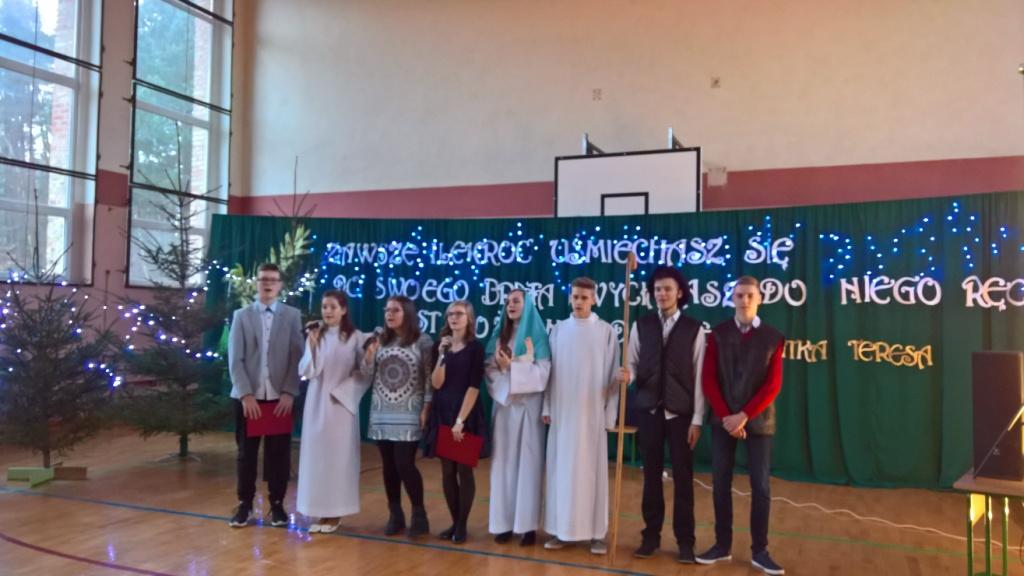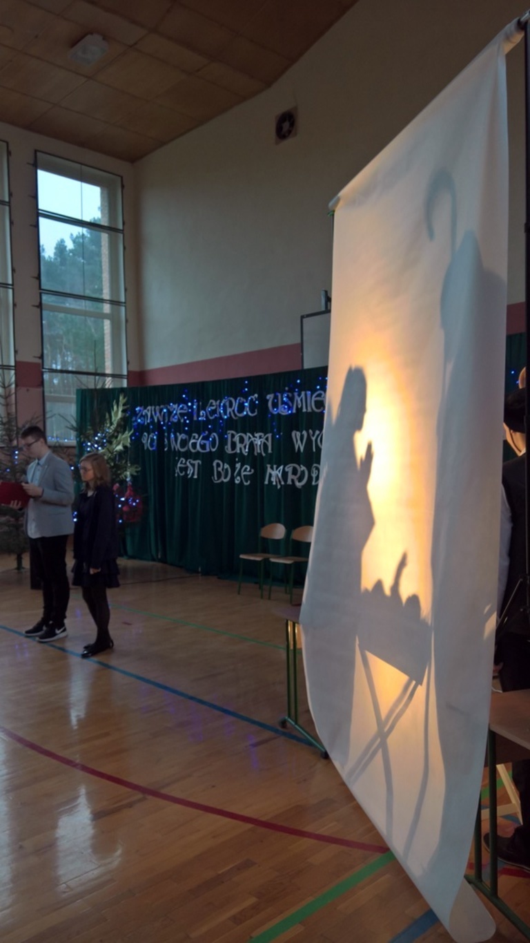 Jasełka przedstawione nietypowo tym razem, bo w formie teatru cieni spotkały się z bardzo pozytywnym odbiorem. Młodzież, grono pedagogiczne i rodzice obecni na uroczystym apelu z okazji Świąt Bożego Narodzenia z zaciekawieniem wpatrywali się w kolejne sceny mówiące o przyjściu na świat Syna Bożego. Poszczególnym scenom towarzyszył również śpiew kolęd i piosenek także rapowanych w wykonaniu naszych uzdolnionych uczniów, wśród których na szczególne uznanie zasługują; Natalia Muszyńska, Maciej Lela, Sara Daszkiewicz, Wiktoria Klawikowska, Amelia Klebba, Grzegorz Wiśniewski, Bartosz Czubaty i Arkadiusz Materka. Głównym przesłaniem jasełek było to, byśmy mimo rosnącego wciąż tempa życia zatrzymali się i znaleźli czas dla Boga, który cicho i pokornie przychodzi do nas i puka do naszych serc, by zmienić nasz smutek w radość a ciemność w światło. Czy otworzysz Mu drzwi....? Po części artystycznej Pani Dyrektor złożyła wszystkim zgromadzonym życzenia na Boże Narodzenie i Nowy Rok oraz zaapelowała o bezpieczne spędzanie przerwy świątecznej. Jasełka przygotowali: Pani Anetta Treder i ks. Robert Mikulski