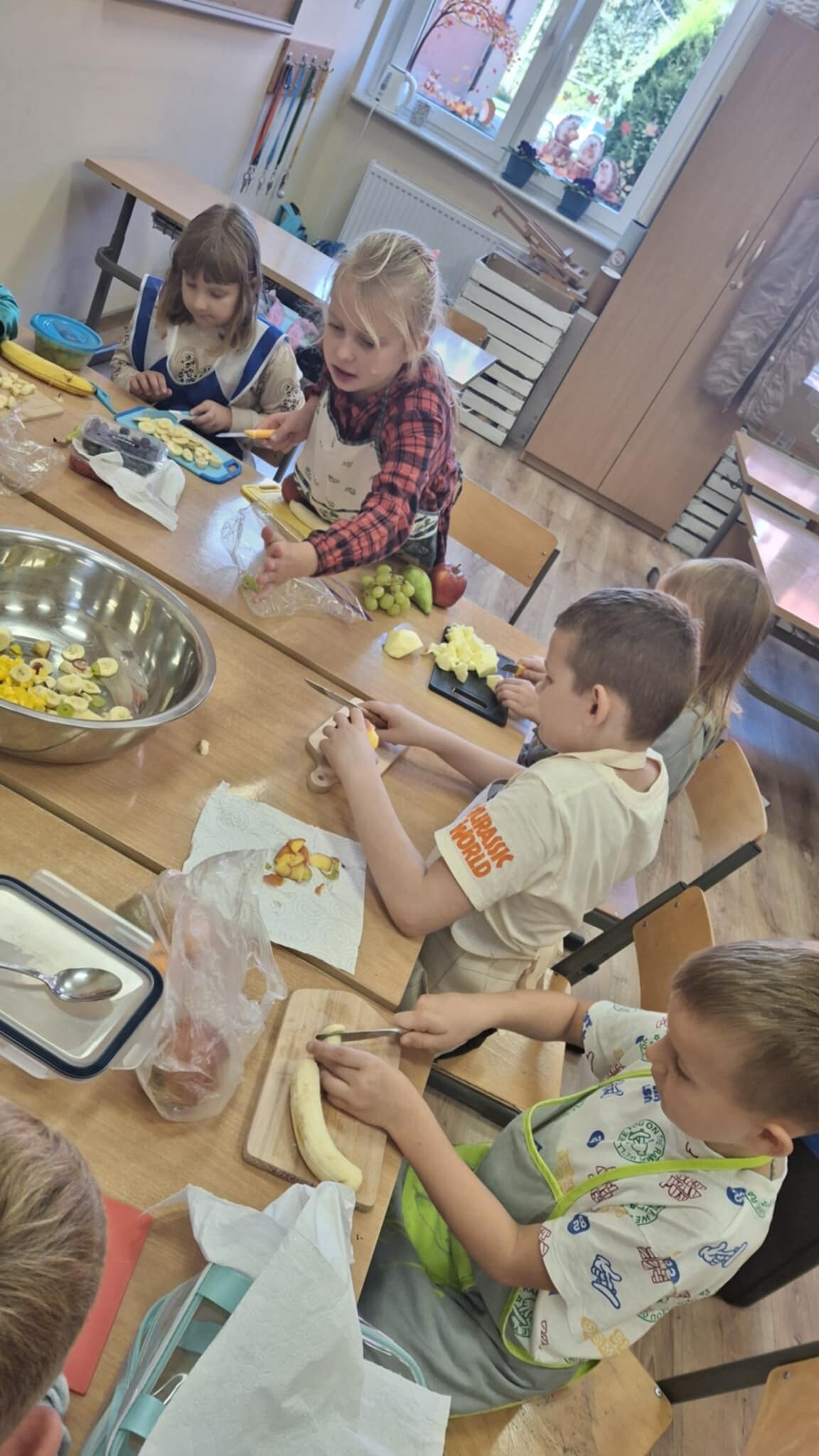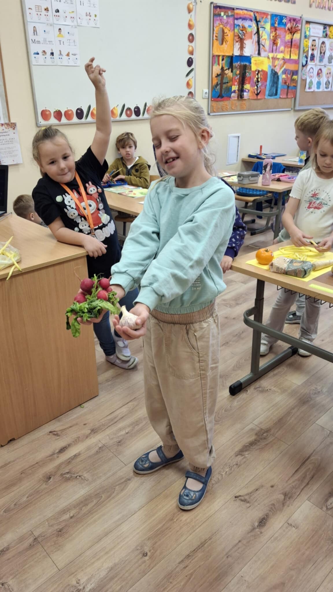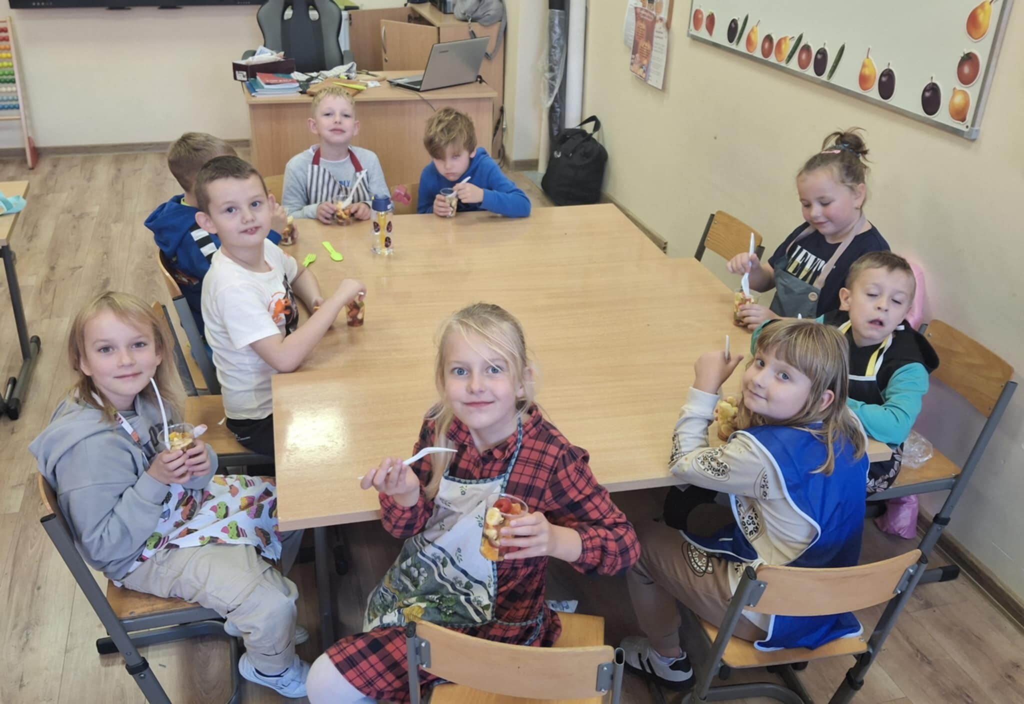 „Jesień w sadzie i w ogrodzie”- pod takim hasłem pierwszaki poznawały owoce i warzywa oraz ich znaczenie dla zdrowia. Dzieci poznawały owoce i warzywa poprzez zabawę i działania praktyczne. Poznawały smak owoców degustując je, segregowały je według koloru, kształtu i rodzaju. Rozpoznawały owoce i warzywa po dotyku. Tworzyły owocowe rytmy. Wykonywały również prace plastyczne związane z sadem i ogrodem. Na sam koniec wspólnie zrobiły owocową sałatkę.