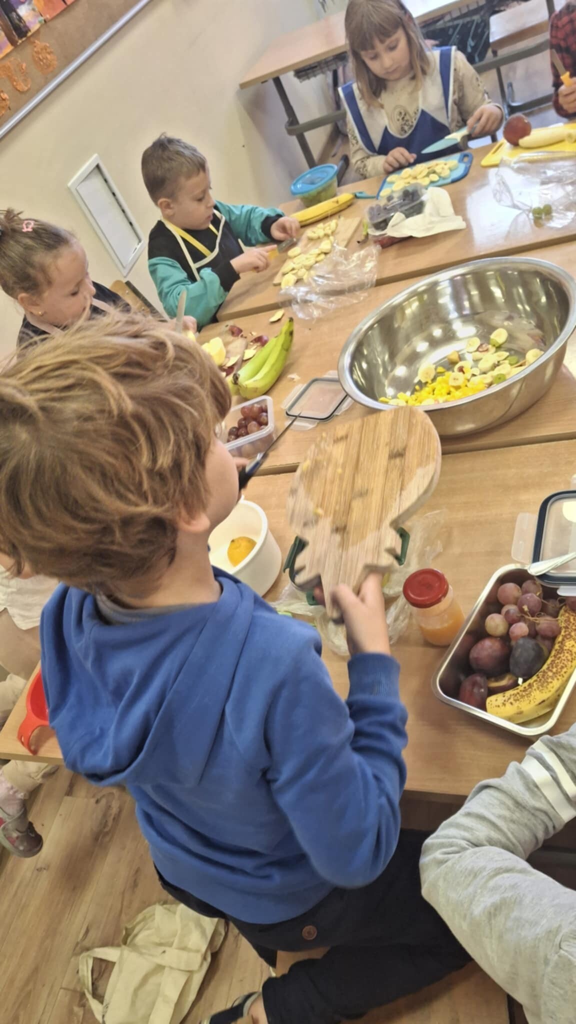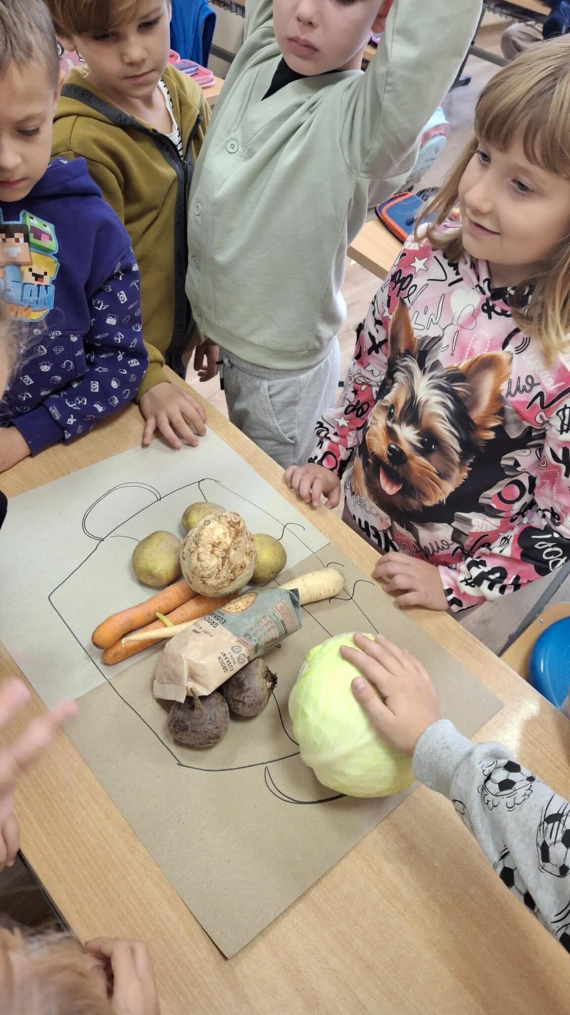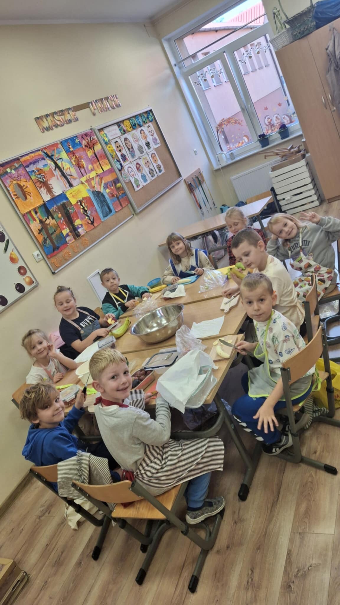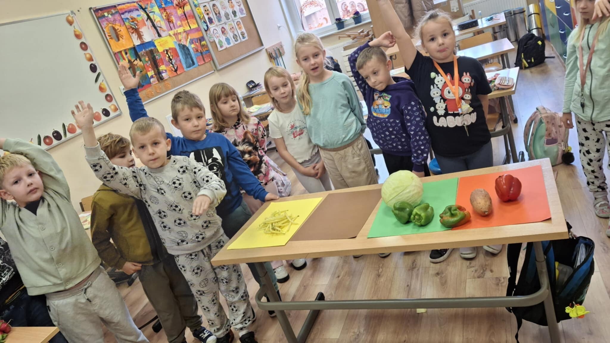 „Jesień w sadzie i w ogrodzie”- pod takim hasłem pierwszaki poznawały owoce i warzywa oraz ich znaczenie dla zdrowia. Dzieci poznawały owoce i warzywa poprzez zabawę i działania praktyczne. Poznawały smak owoców degustując je, segregowały je według koloru, kształtu i rodzaju. Rozpoznawały owoce i warzywa po dotyku. Tworzyły owocowe rytmy. Wykonywały również prace plastyczne związane z sadem i ogrodem. Na sam koniec wspólnie zrobiły owocową sałatkę.