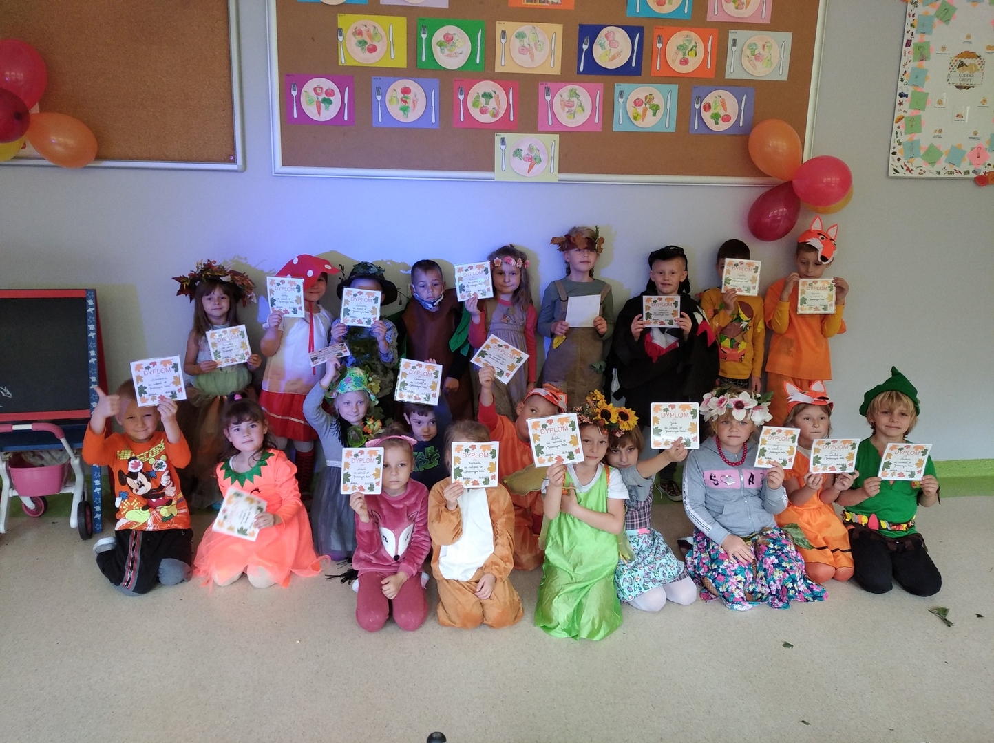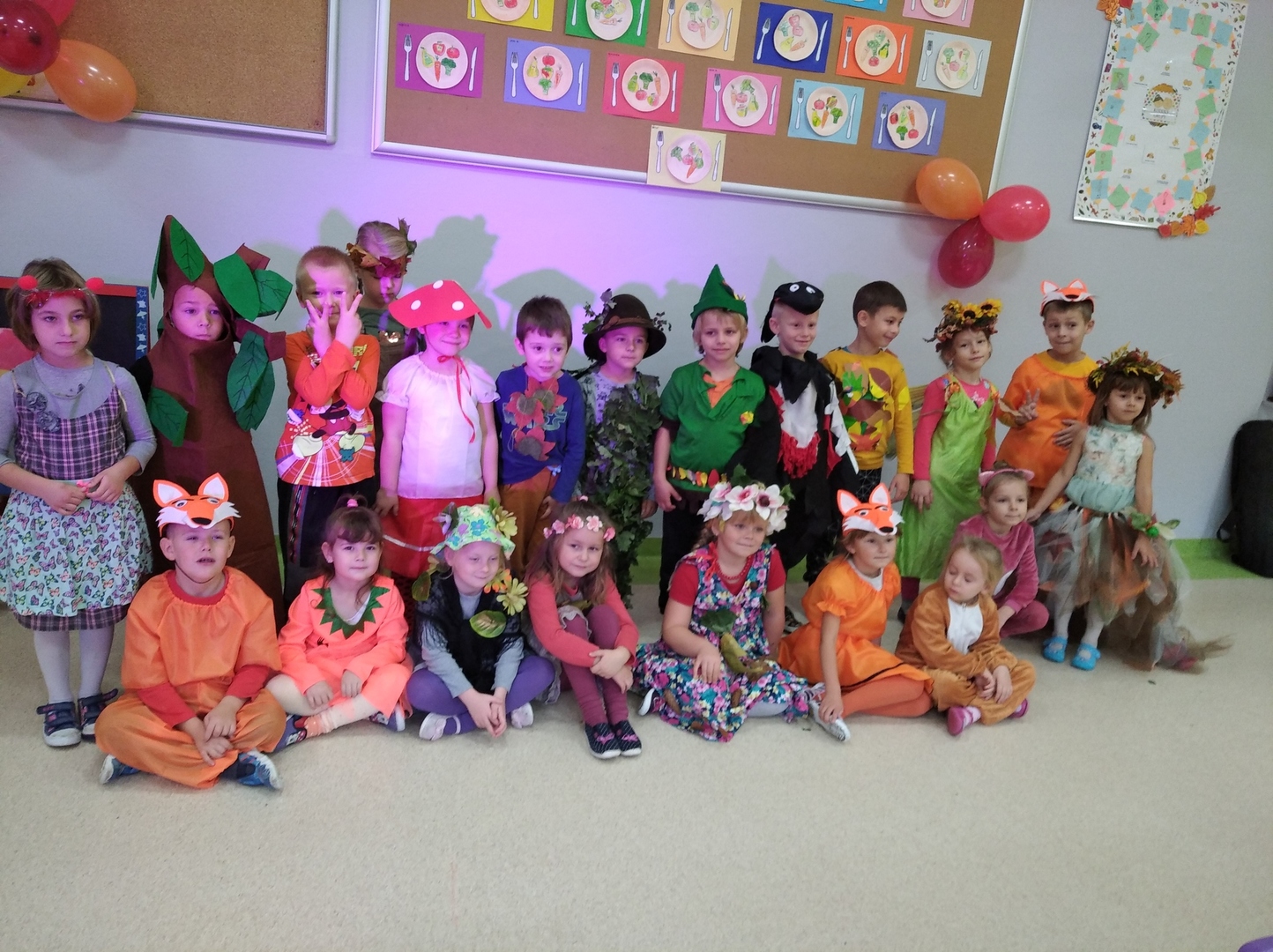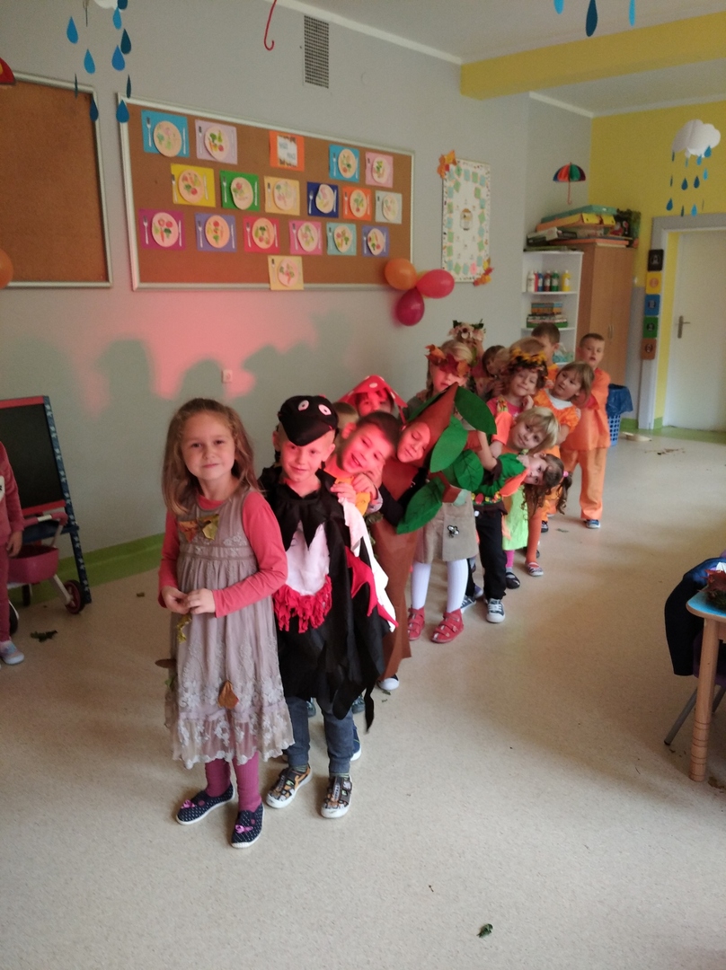 Wszyscy śpiewali jesienne piosenki, rozwiązywali jesienne zagadki, tańczyli taniec liści. Główną atrakcją balu był pokaz mody. Rodzice spisali się na medal, wyczarowując dla swoich pociech wspaniałe stroje. Było wiele zabaw i konkursów. Nie zabrakło tańców i pląsów. Na zakończenie balu dzieci zostały zaproszone do pożegnalnego tańca i wręczone zostały każdemu pamiątkowe dyplomy. Nie zabrakło też słodkiego poczęstunku.
