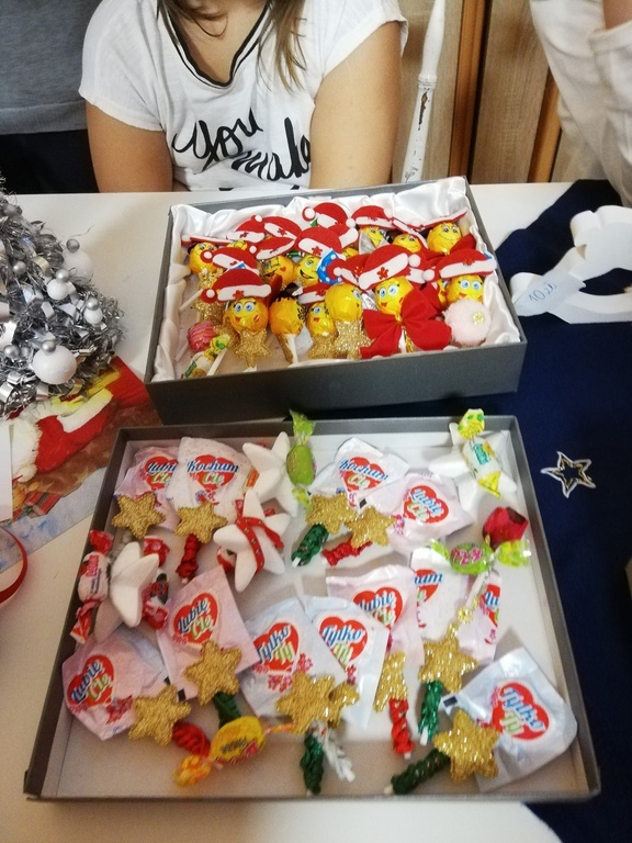 Uczniowie z nauczycielkami przygotowali też stroiki i ozdoby świąteczne, i zaangażowali się tym samym w pomoc dla chorującej na nowotwór Zuzi Kapczuk, biorąc udział w akcji charytatywnej organizowanej 14.12.2019r. w naszej szkole.