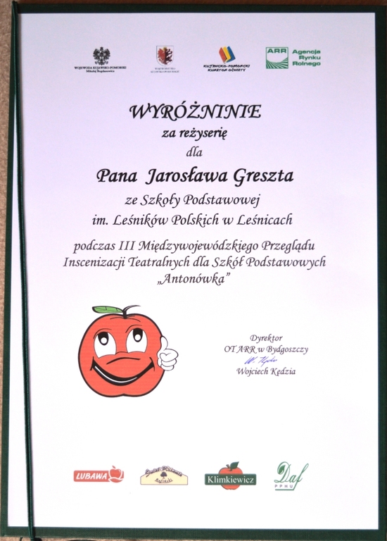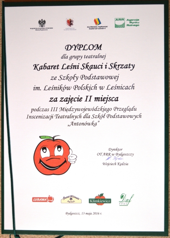 Dnia 13 maja i to w piątek Kabaret Leśni Skauci i nowo utworzona grupa teatralna Skrzaty, brali udział w III Międzywojewódzkim Przeglądzie Inscenizacji Teatralnych dla Szkół Podstawowych "Antonówka" w Bydgoszczy. Na scenie teatru "Adria" zaprezentowało się 12 zespołów teatralnych z północnej Polski ( z Torunia, Gdańska, Tucholi, Ostrołęki itp.), które zakwalifikowały się do finału międzywojewódzkiego z blisko 50 teatrów zgłoszonych do przeglądu. Nasi kabareciarze wspomagani przez nową trupę teatralną Skrzaty złożoną z uczniów klasy II i IV tym razem zaprezentowali nowy spektakl pt. "Leśne Głupki -z Jedzą warzywa". Scenariusz , reżyserię i scenografię przygotował opiekun zespołów p.Jarosław Greszta. Spektakl wywoływał co chwila kolejne "salwy śmiechu" na widowni. Bajeczna balonowa scenografia i przede wszystkim wspaniała gra aktorska oraz fantastycznie wykonane piosenki nagradzane były raz po raz gromkimi brawami. Profesjonalne Jury postanowiło przyznać nam zaszczytne II miejsce!!!! Na dodatek opiekun zespołu otrzymał specjalną nagrodę i wyróżnienie za reżyserię. I jak by tego było mało z pośród ponad 200 aktorów , którzy zaprezentowali się na scenie , Jury przyznało tylko 2 nagrody aktorskie - między innymi dla naszej uczennicy klasy VI Wiktorii Klawikowskiej! Ogromne gratulacje !!!!