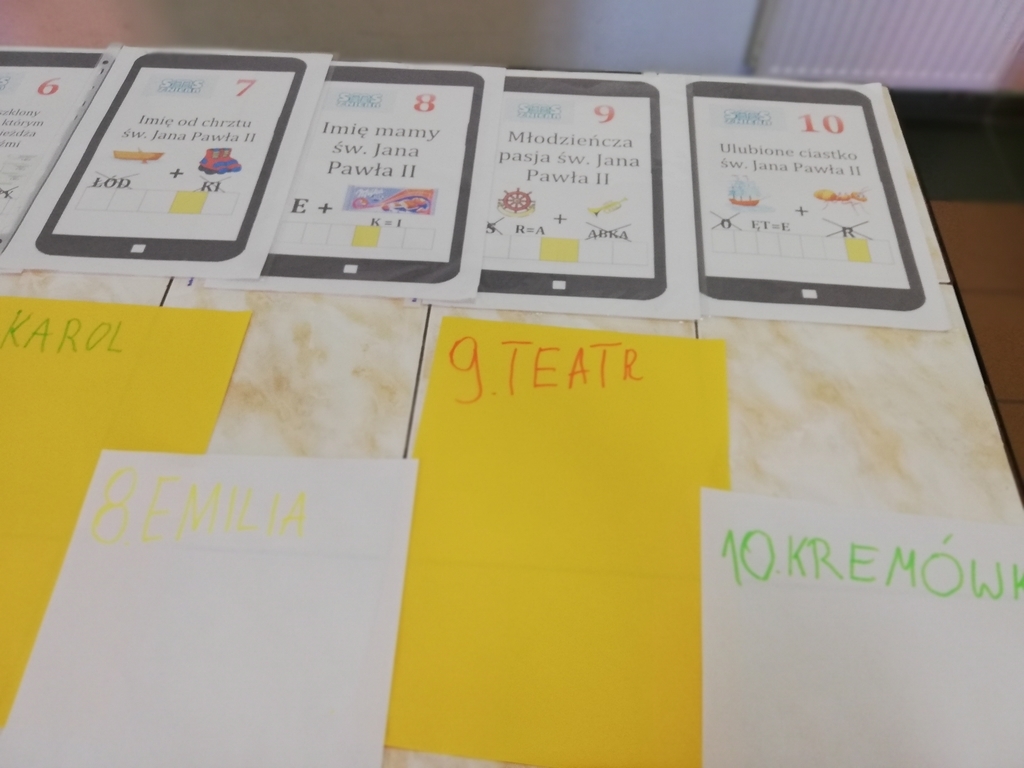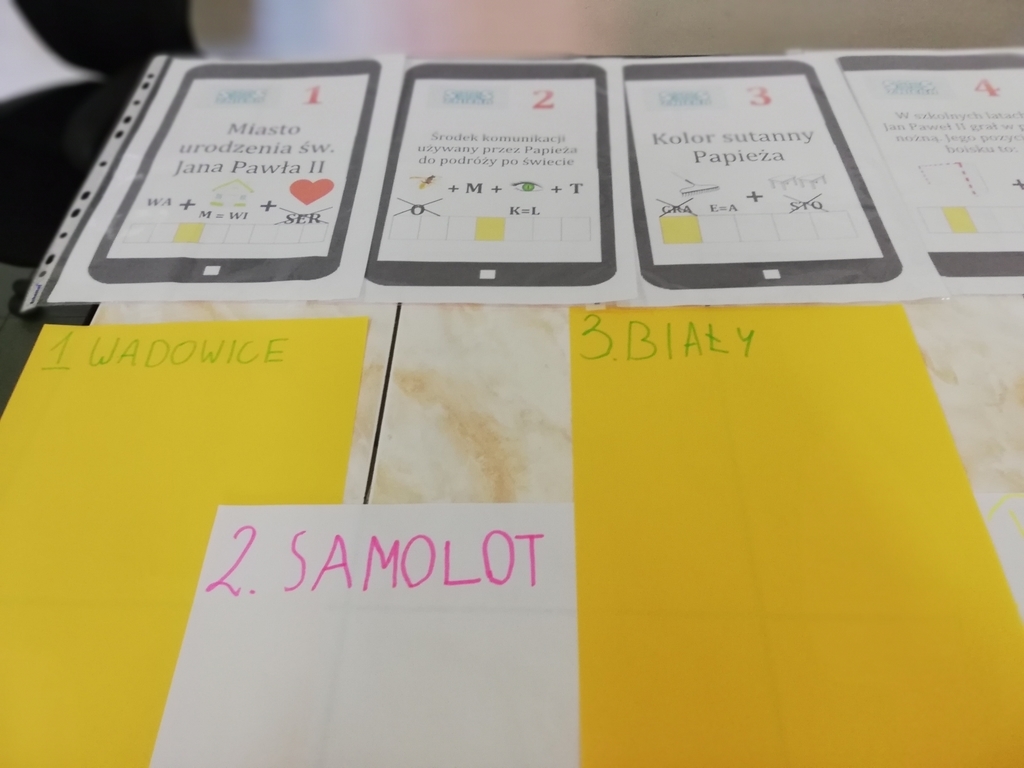 Nietypowo – bo w formie rebusów, uczniowie naszej szkoły uczestniczyli w szkolnym konkursie wiedzy o Janie Pawle II. Konkurs miał na celu poszerzenie wiedzy o Ojcu Świętym, Jego dzieciństwie, młodości, kapłaństwie, pontyfikacie oraz ropowszechnienie zainteresowania osobą Papieża Polaka. Duże zaangażowanie i dobre odpowiedzi świadczą o tym, że ten sposób sprawdzenia wiedzy przypadł uczniom do gustu i przyniósł sporo satysfakcji.