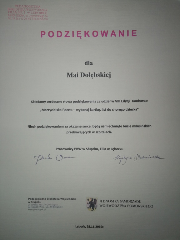Kiedy jest nam źle, kiedy pokona nas choroba i musimy spędzić w szpitalu wiele dni, czekamy, by nas ktoś pocieszył. Od wielu lat istnieje "Marzycielska Poczta", a w listopadzie Pedagogiczna Biblioteka Wojewódzka w Słupsku zorganizowała TYDZIEŃ PISANIA LISTÓW "Marzycielskiej Poczty". Nasi uczniowie z klasy V - Maja Dołębska i Piotr Gralec - wzięli udział w tym przedsięwzięciu. Napisali odręcznie piękne listy do dzieci, które długi czas przebywają w szpitalu. Opowiedzieli o swoich przeżyciach związanych z chorobą, o tym, jak czeka się na miłe słowo i gest. Złożyli serdeczne życzenia z okazji Bożego Narodzenia. Listy na pewno dotrą do dzieci z "Marzycielskiej Poczty".