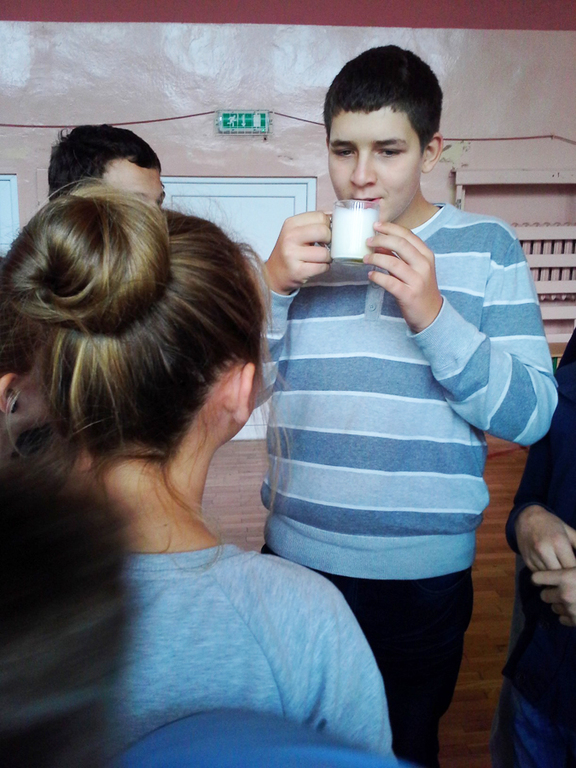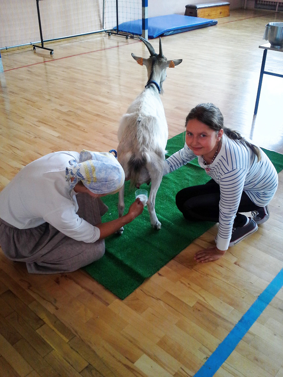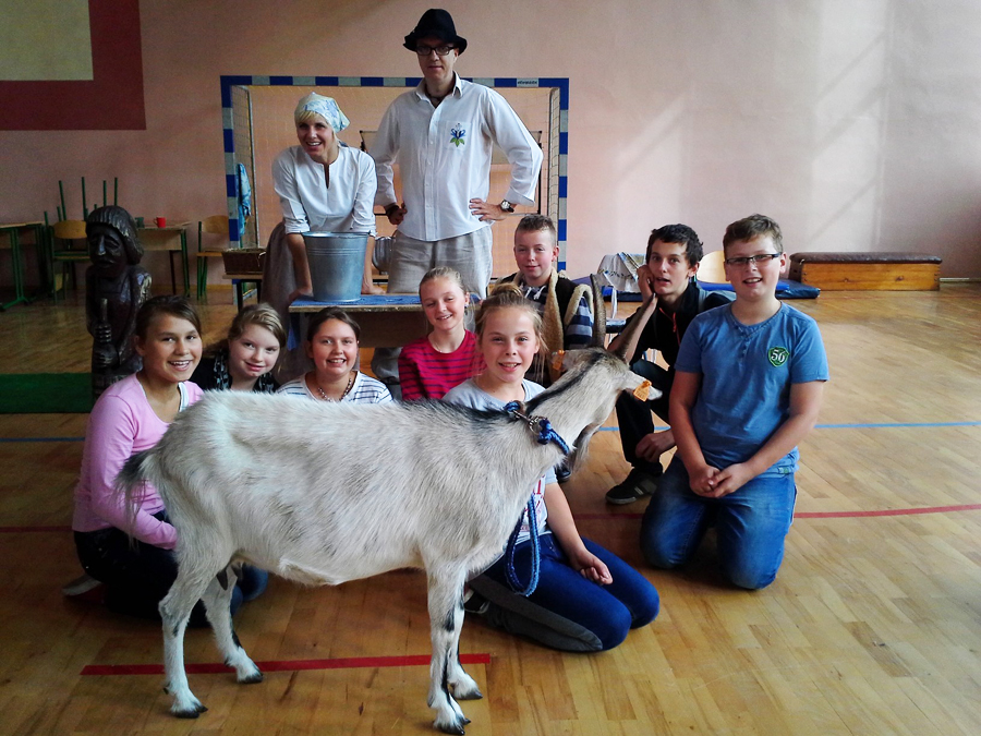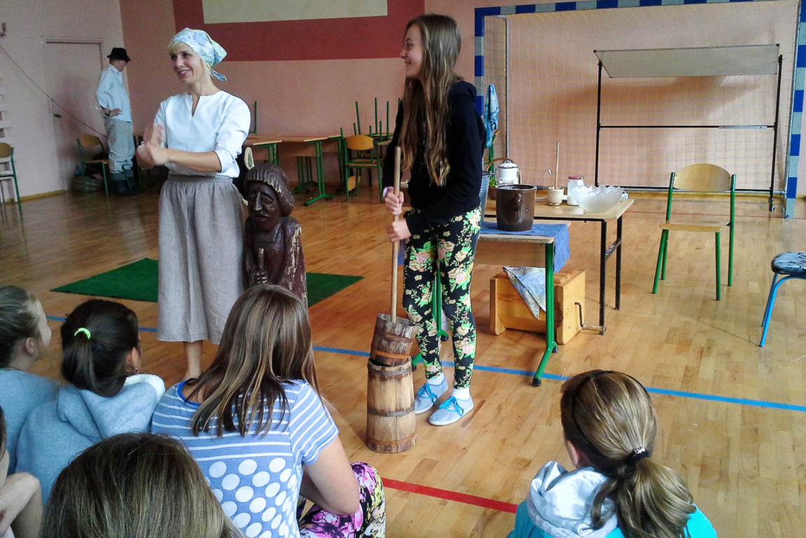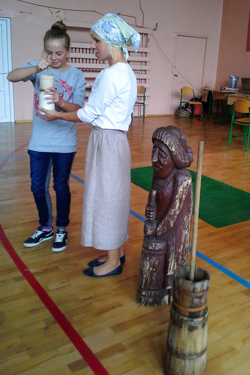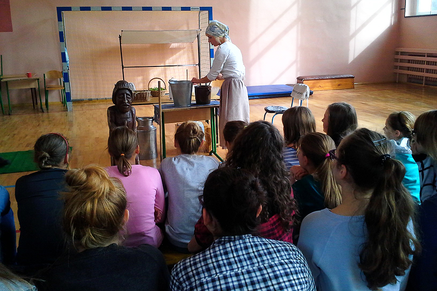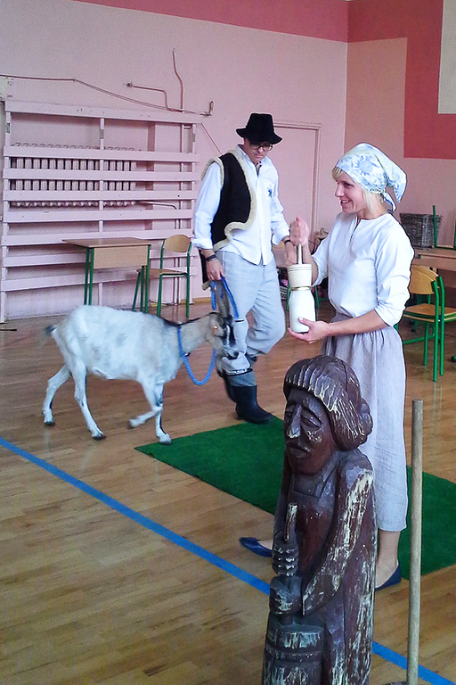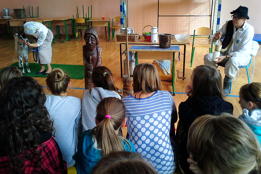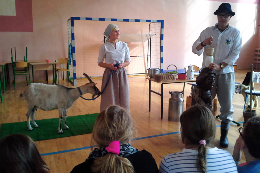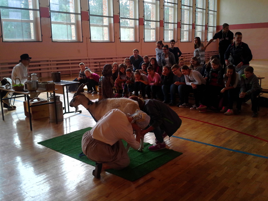 Dnia 1 października uczniowie z klasy V i VI szkoły podstawowej oraz II i III gimnazjum wzięli udział w niezwykle ciekawym programie edukacyjnym „Mleczna Droga”. Podczas godzinnego spotkania młodzież uczęszczająca na lekcje języka kaszubskiego wraz z nauczycielkami: p. A. Treder i p. M. Maszota - miała okazję poznać proces produkcyjny masła i twarogu. Całe spotkanie rozpoczęło się od powitania z gospodarzami z Zagrody Powroty. Zgromadzeni uczniowie usłyszeli ciekawą bajkę o maśle i dowiedzieli się do czego służą starodawne urządzenia takie jak: center fugi, masielnice, cedzidła, drewniane łyżki, czy kanki. Najbardziej jednak spodobała się wszystkim wizyta kozy, którą każdy miał możliwość wydoić a następnie skosztować pysznego, świeżego mleka. Młodzież przy pomocy gospodarzy wytworzyła również twarożek i masełko, które po spotkaniu z przyjemnością poddane zostało degustacji i spotkało się z uznaniem smakoszy. Opracowała: mgr Anetta Treder