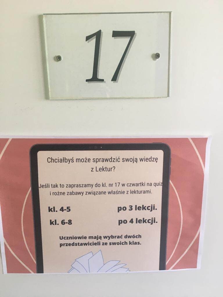 Ze wspaniałą inicjatywą wystąpił uczeń klasy VIII Piotr Janneck. Przygotował projekt czytelniczy dla klas IV-VIII sprawdzający wiedzę uczniów z lektur obowiązkowych. W czwartki w gabinecie polonistycznym uczniowie (udział dobrowolny) mogą skonfrontować swoją wiedzę zdobytą podczas czytania lektur. Nad przebiegiem poszczególnych części projektu czuwają: Maja Dołębska i Andrzej Pepliński, zaś pytania (bardzo oryginalne) opracował Piotr Janneck.
