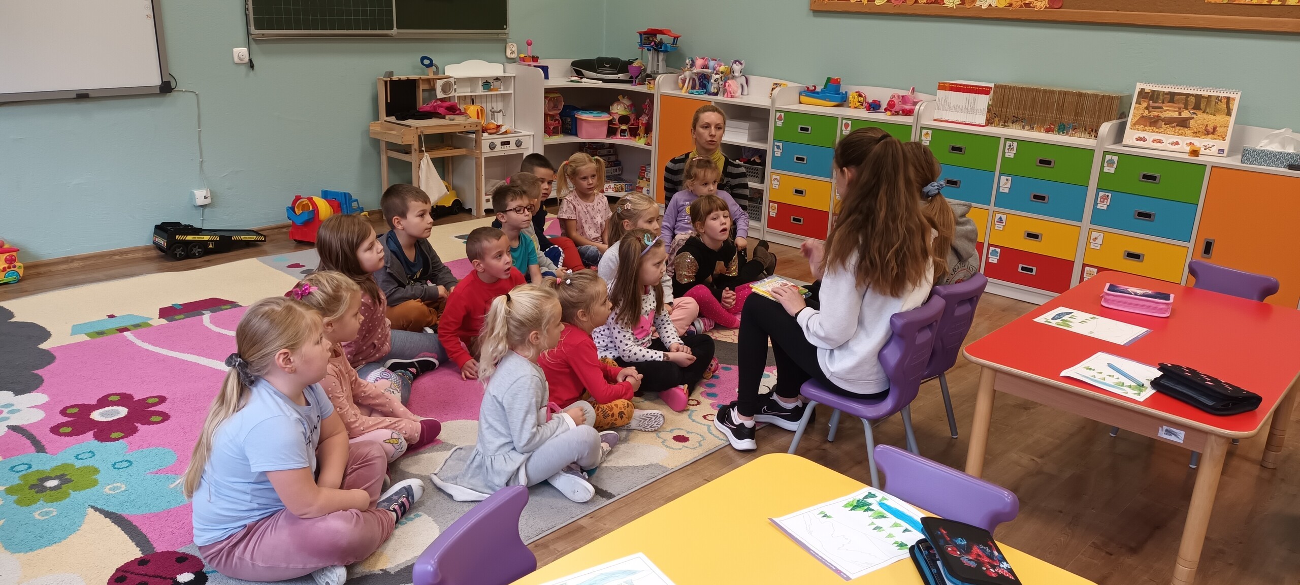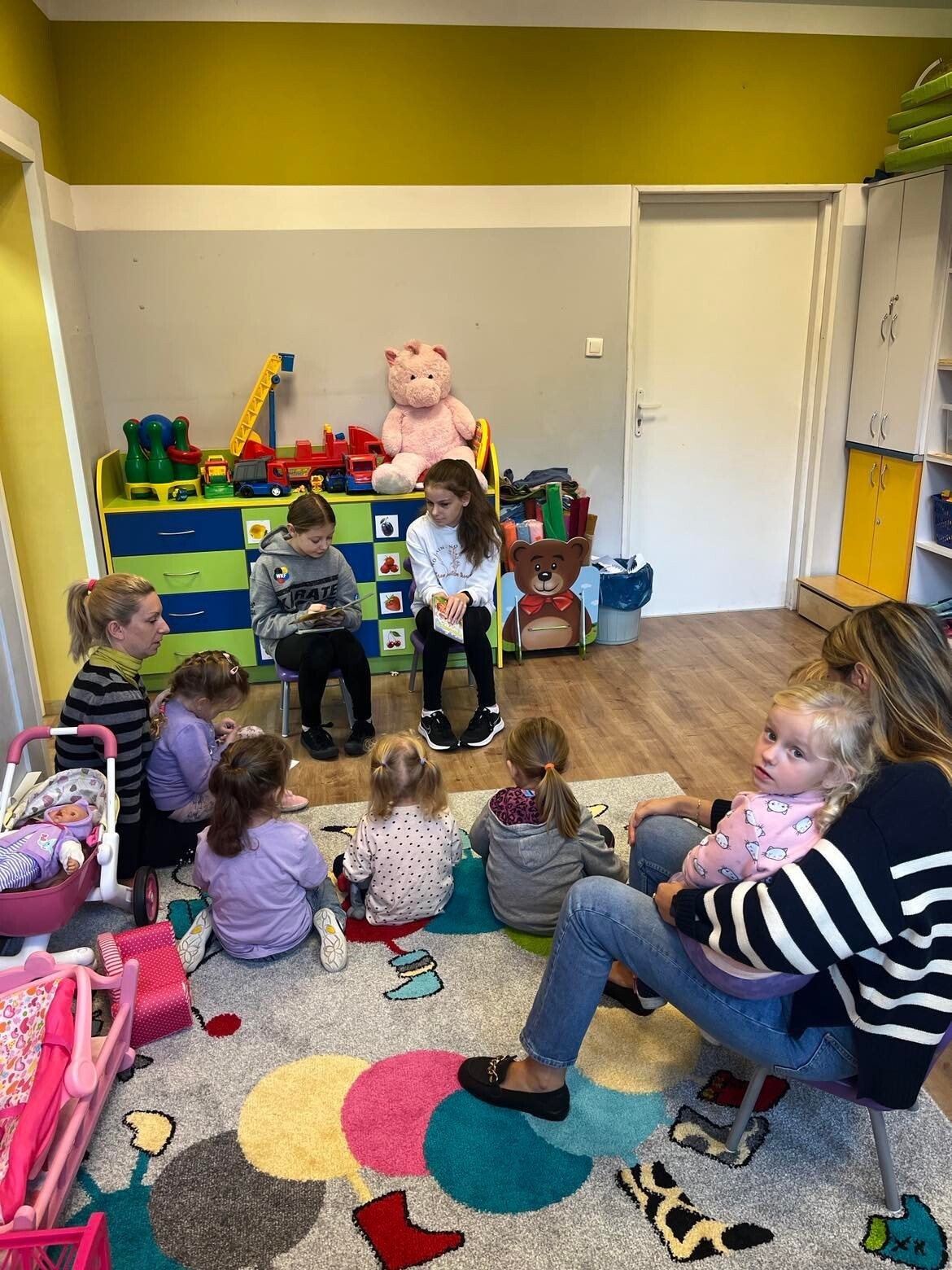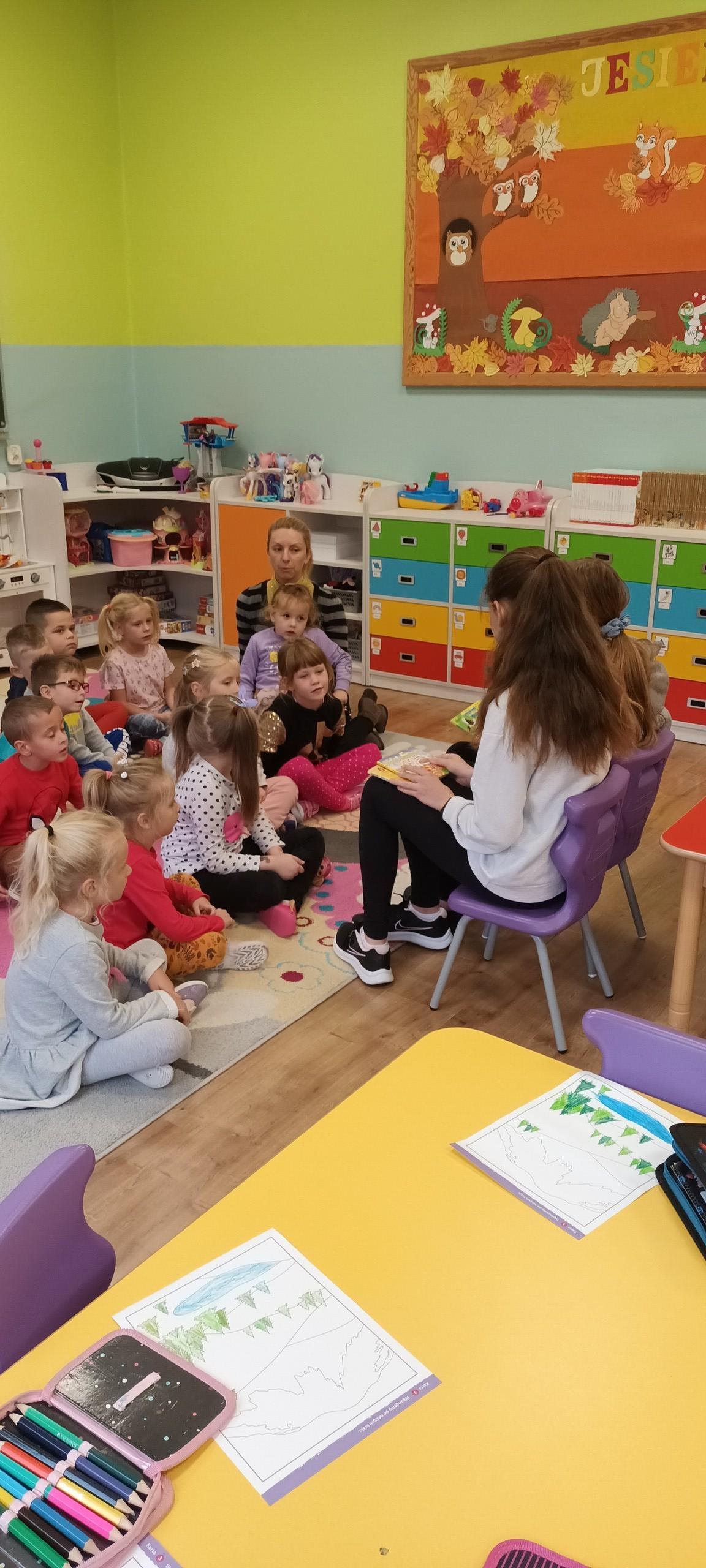 Dzięki uprzejmości Pani Eweliny oraz koleżanek ze starszych klas, przedszkolaki miały okazje wysłuchać kilku bajek.