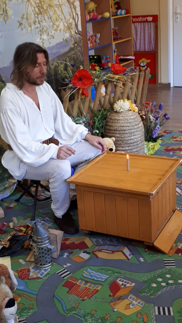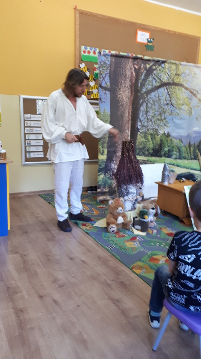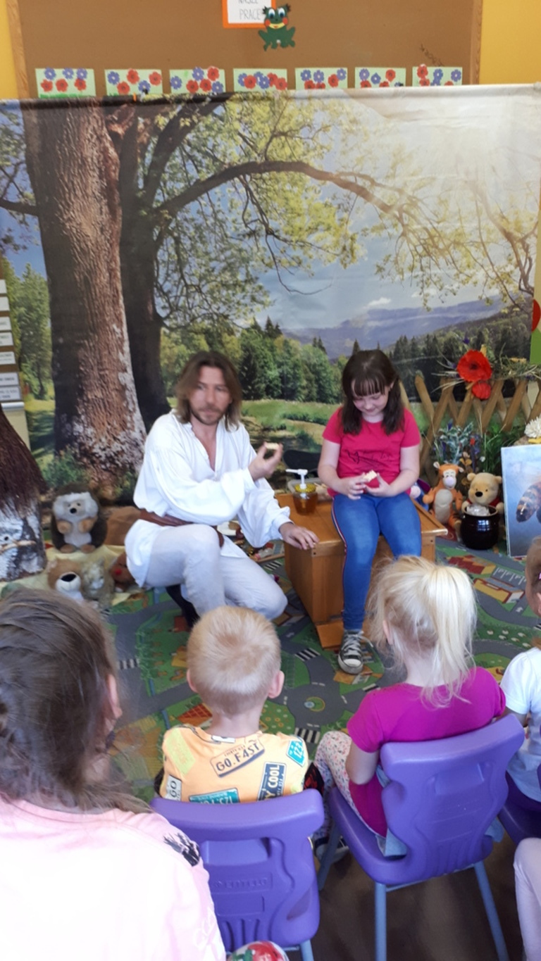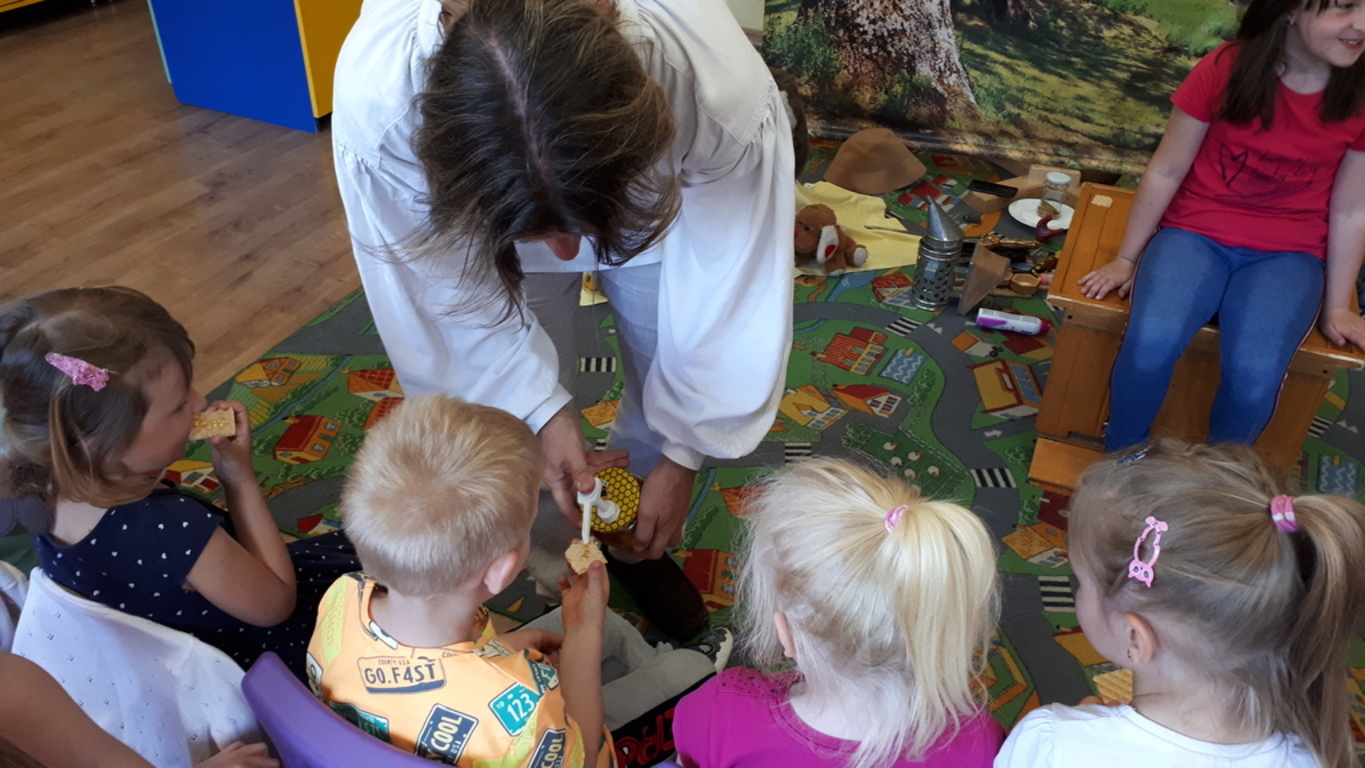22 maja 2019r. w teatralnym otoczeniu i za pomocą podstawowych narzędzi pszczelarskich, dzieci z oddziału przedszkolnego oraz uczniowie kl. I - III poznały fascynujący świat pszczół. W trakcie zajęć można było dotknąć plastra pszczelego, zajrzeć do wnętrza prawdziwego ula a nawet spróbować pszczelich produktów. Zajęcia kończyły się rozdaniem dyplomów, książeczek i pałeczek do miodu.