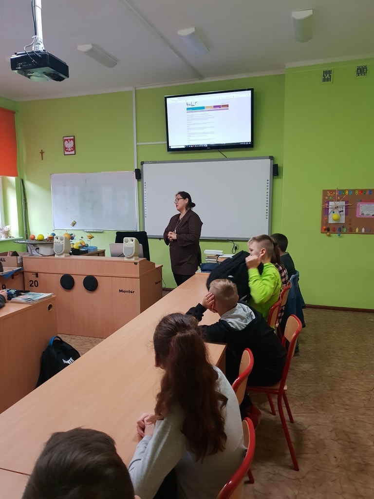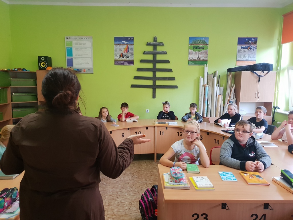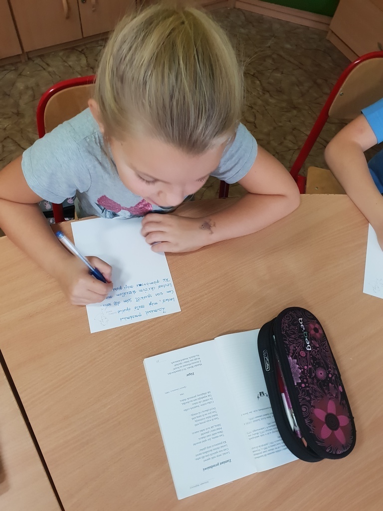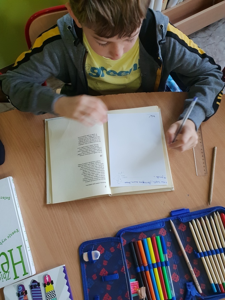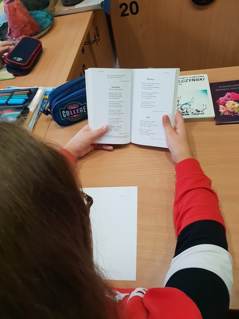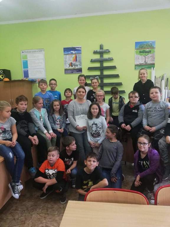 16 października pani Kamilla Knap-Wrześniewska, dyrektor biblioteki w Nowej Wsi Lęborskiej (a prywatnie mama Kajetana i Filipa - uczniów naszej szkoły) przeprowadziła akcję PODARUJ WIERSZ. Pani Kamilla w bardzo ciekawy sposób opowiedziała o poezji Herberta, pokazała uczniom kilkanaście tomików wierszy,kilka ciekawych stron internetowych oraz aplikacji związanych z tematem. Następnie uczniowie wybrali wiersz z tomiku poezji i własnoręcznie przepisali go na pięknym papierze sygnowanym logo akcji. Kilku uczniów oraz pani Sylwia Janicka napisali własne wiersze. Wszystkie wiersze przepisane przez uczniów zostały podarowane rodzicom, nauczycielom i kolegom ze szkoły.