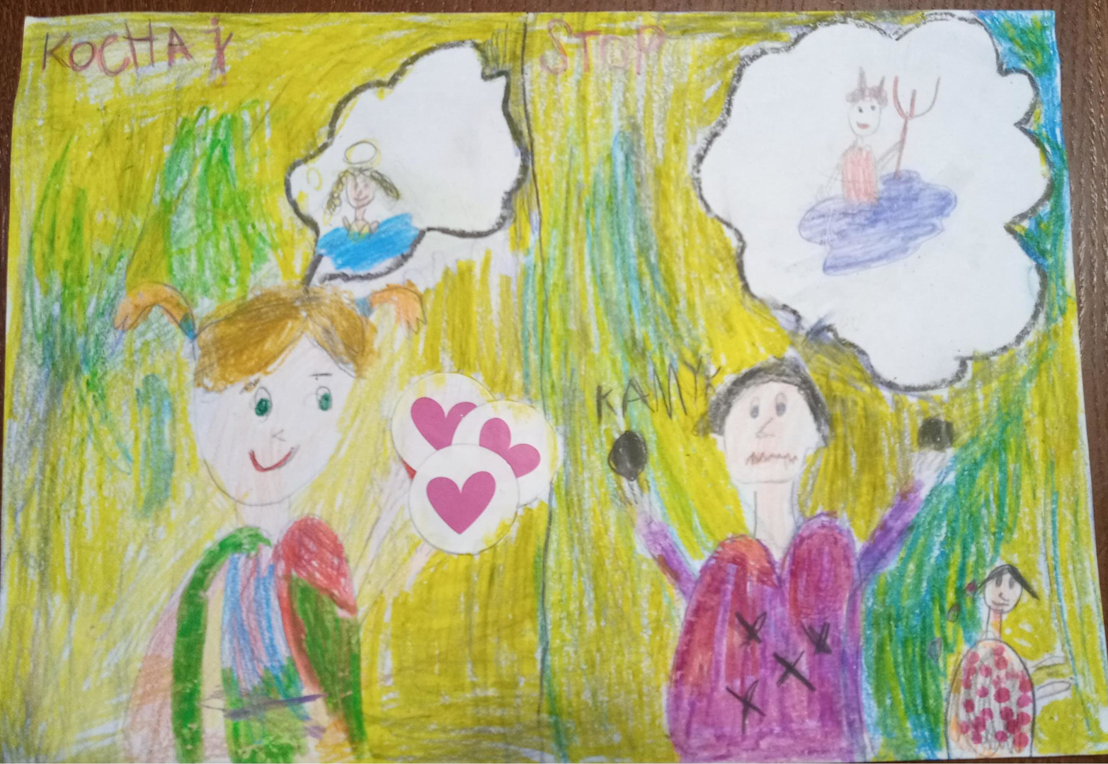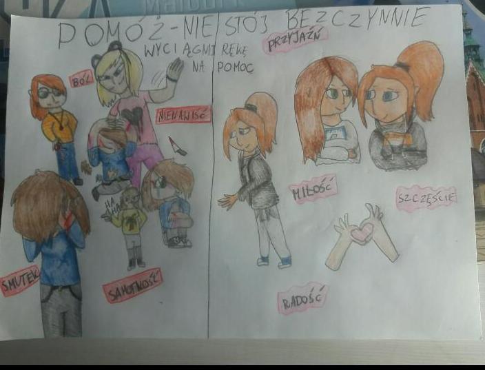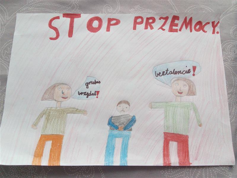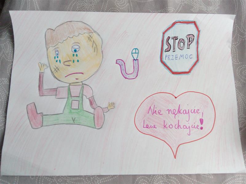 Uczniowie klas I – VI za pomocą rysunków dali obraz jak czują się osoby krzywdzone, ukazali też własne wyobrażenia na temat sprawcy. Przedstawiali poprzez prace plastyczne sposoby radzenia sobie z w/w zjawiskiem oraz reagowanie kiedy są świadkami takich działań.