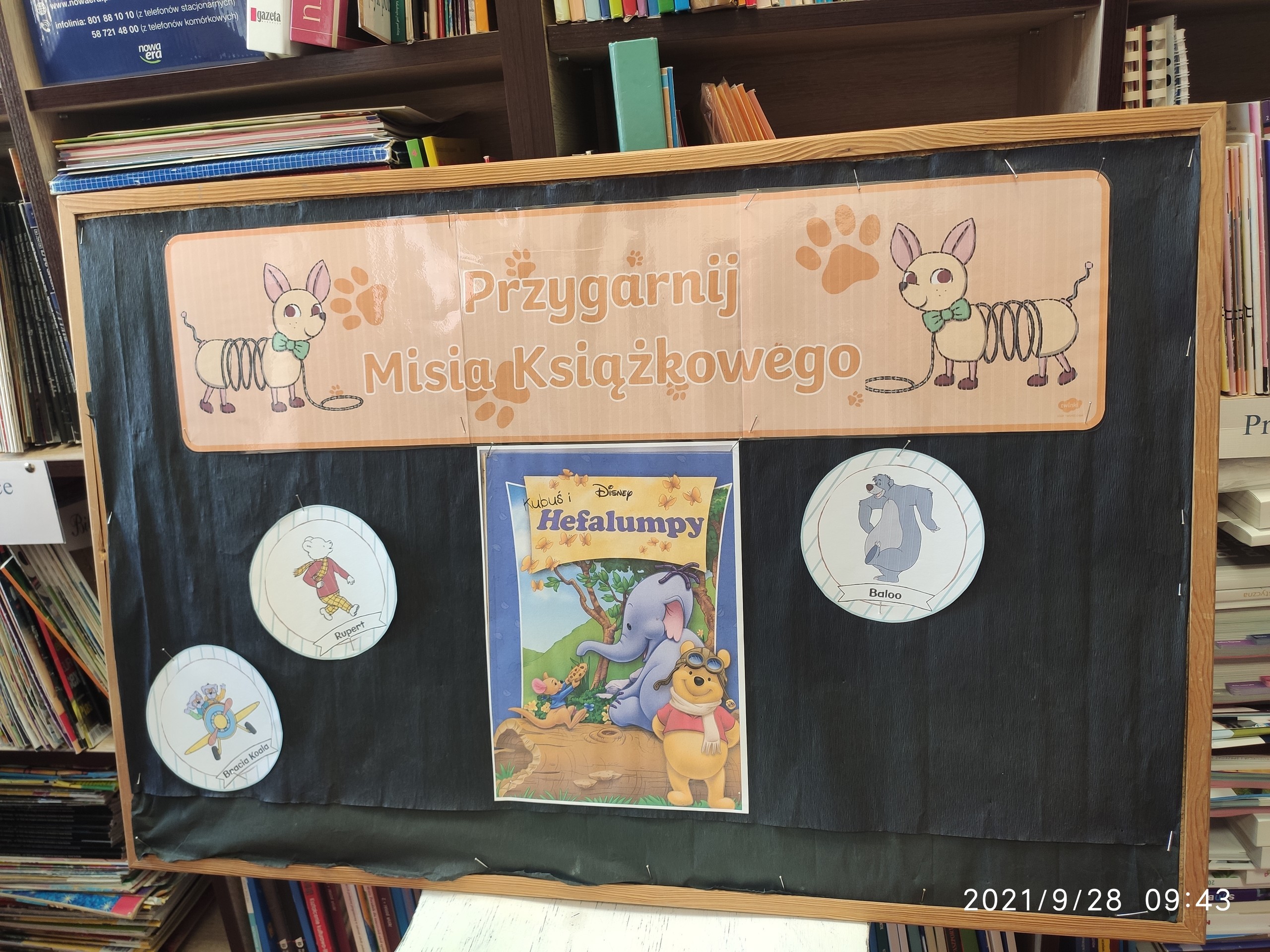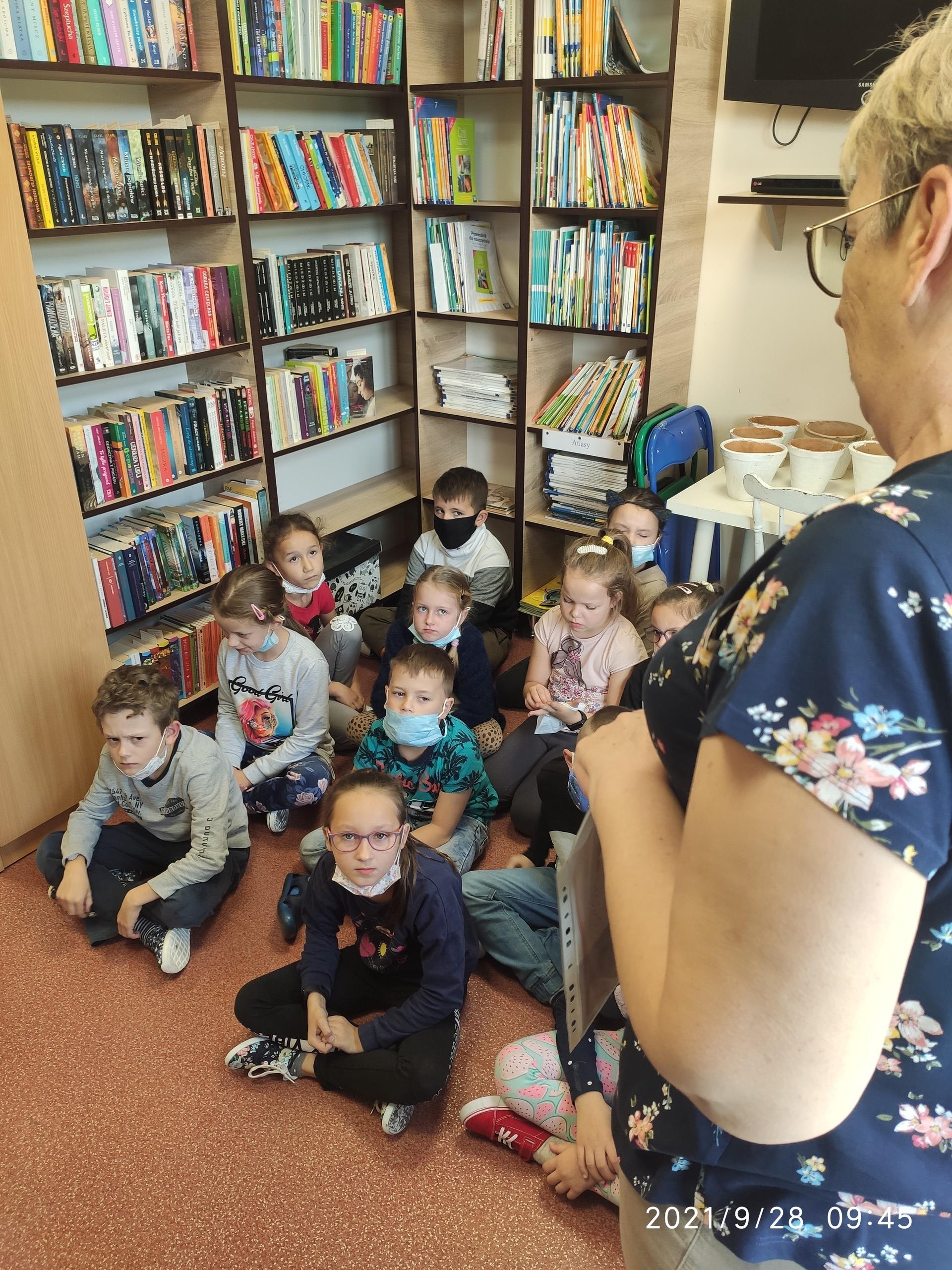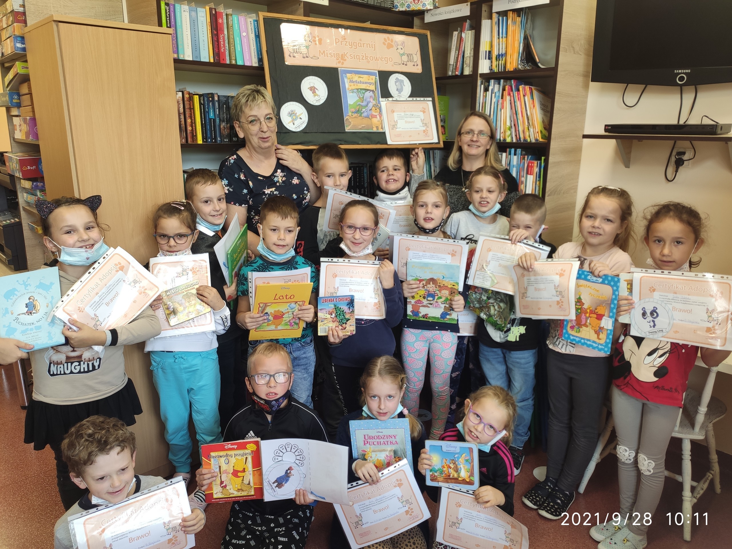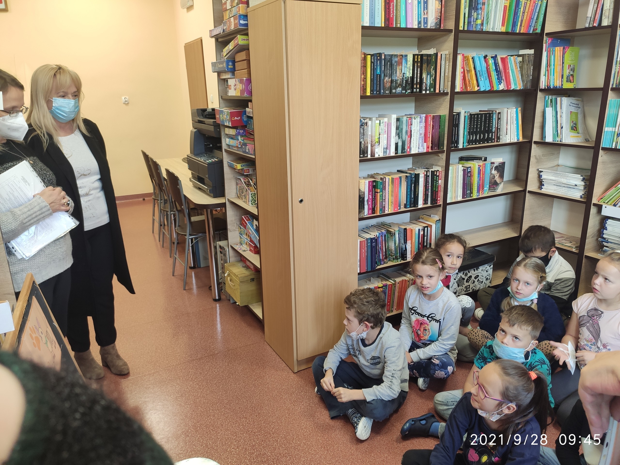 28.09.2021 klasa II podczas spotkania w bibliotece szkolnej przystąpiła do Projektu Edukacyjnego "Przygarnij Książkowego Misia". Uczniowie na początek zostali zapoznani z założeniami Projektu wedle których każde z dzieci "adoptuje" Książkowego Misia i obiecuje czytać mu 15 minut dziennie. Kolejnym etapem spotkania było przypomnienie uczniom zasad zachowania obowiązujących w bibliotece oraz próśb książki. Następnie dzieci otrzymały Certyfikat adopcji, wizerunek swojego adoptowanego misia, zakładkę oraz czytelniczego kwiatka na którym będą zaznaczać spełnianie obietnic. Na koniec spotkania uczniowie wypożyczyli książki o historiach Misiów.