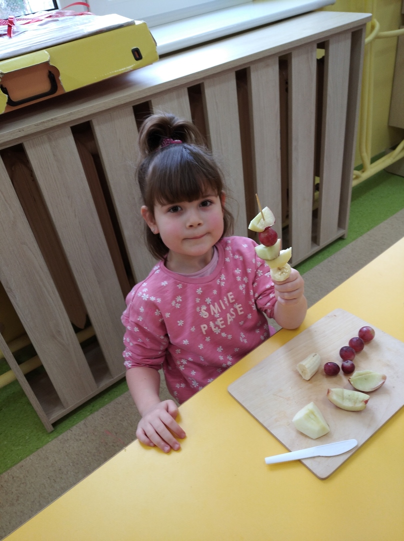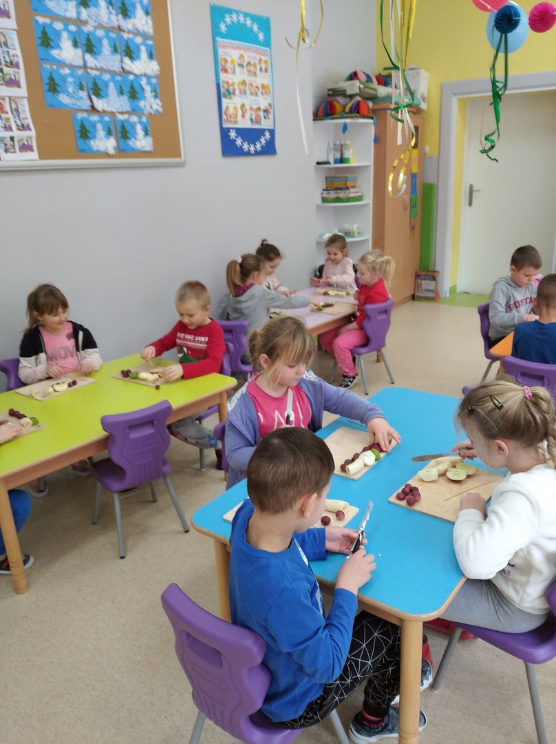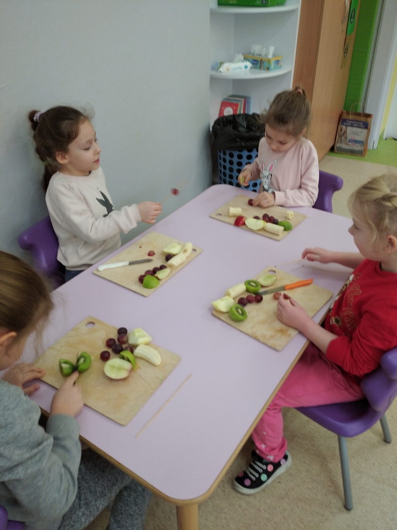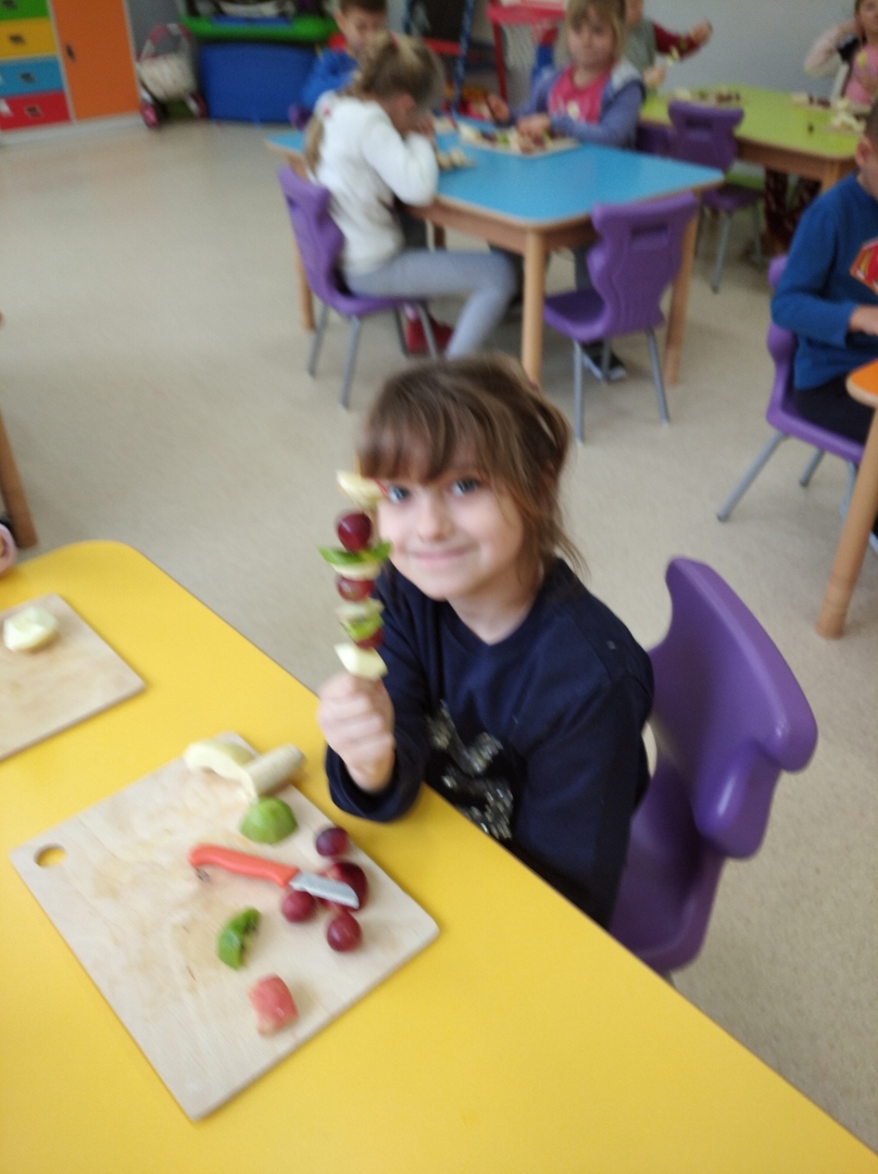 Dzieci tego dnia miały dużo pracy. Jako Przedszkole Promujące Zdrowie, przedszkolaki postanowiły na swoich zajęciach własnoręcznie przygotować owocowe szaszłyki. Najpierw przedszkolaki określały kształt, kolor, wielkość oraz zapamiętywały nazwy owoców. Potem kroiły owoce na kawałki i nadziewały na patyczki tworząc pyszne i zdrowe szaszłyki owocowe.Po skończonej pracy wszystkie dzieci ze smakiem zjadły szaszłyki.