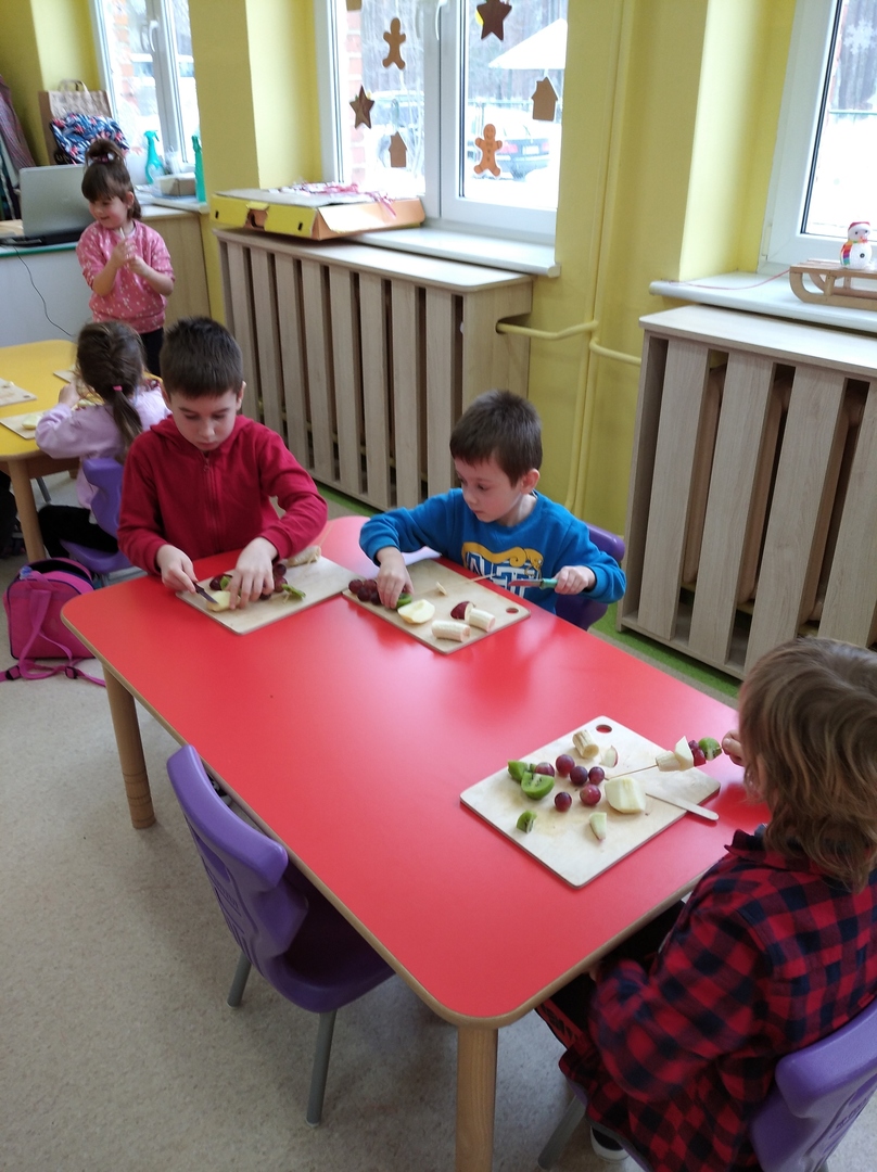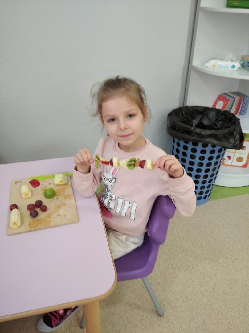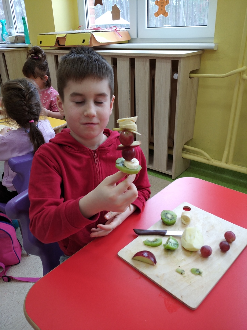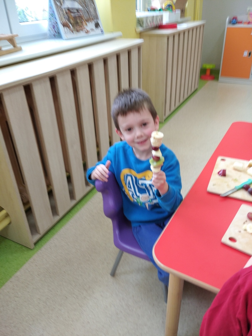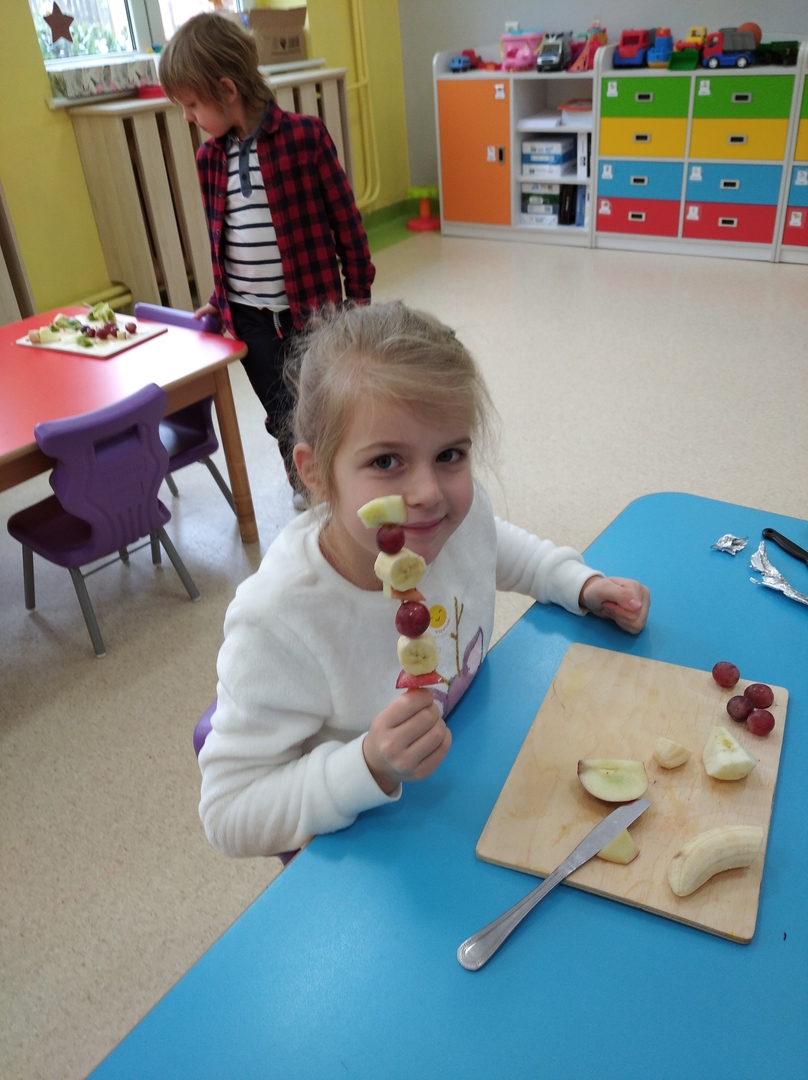 Dzieci tego dnia miały dużo pracy. Jako Przedszkole Promujące Zdrowie, przedszkolaki postanowiły na swoich zajęciach własnoręcznie przygotować owocowe szaszłyki. Najpierw przedszkolaki określały kształt, kolor, wielkość oraz zapamiętywały nazwy owoców. Potem kroiły owoce na kawałki i nadziewały na patyczki tworząc pyszne i zdrowe szaszłyki owocowe.Po skończonej pracy wszystkie dzieci ze smakiem zjadły szaszłyki.