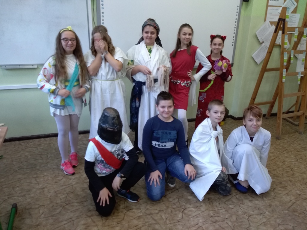 26 listopada uczniowie klasy V spotkali się na lekcji historii przebrani za rzymskich bogów i boginie. Były to aktywne zajęcia, podczas których uczniowie utrwalili swoją wiedzę dotyczącą starożytnego Rzymu. Wszyscy doskonale się bawili, udając Westę, Minerwę, Junonę czy Aresa. Zastosowanie dramy zwiększyło zainteresowanie uczniów omawianymi zagadnieniami, rozwijało wyobraźnię oraz kształtowało umiejętność współpracy w grupie.