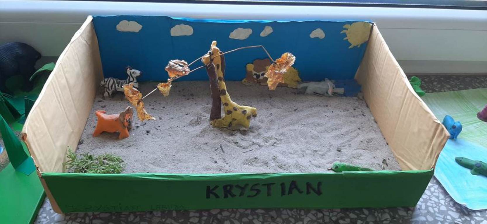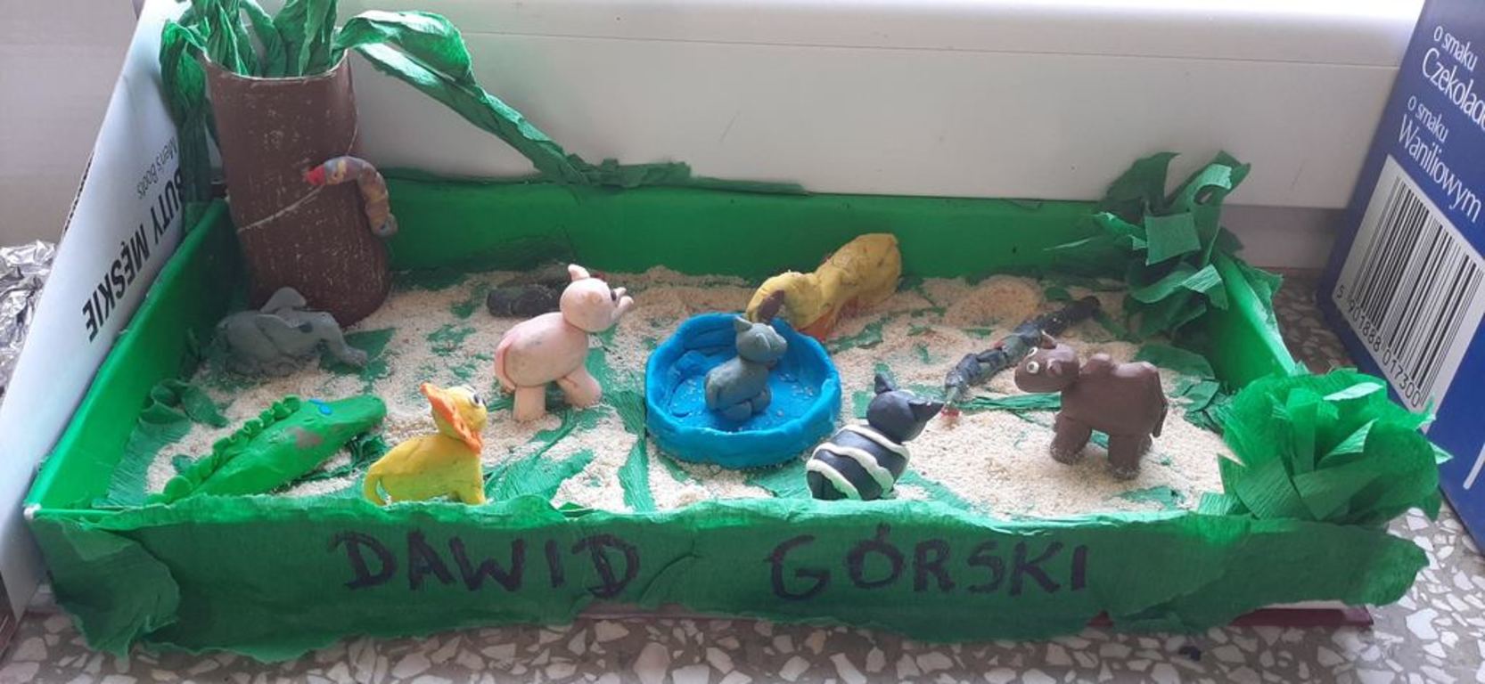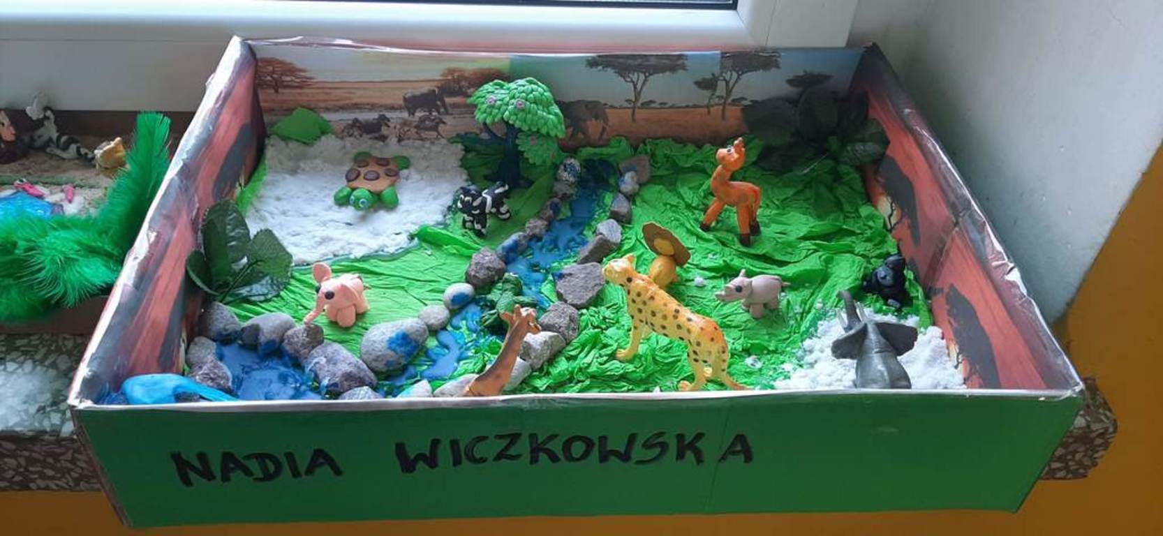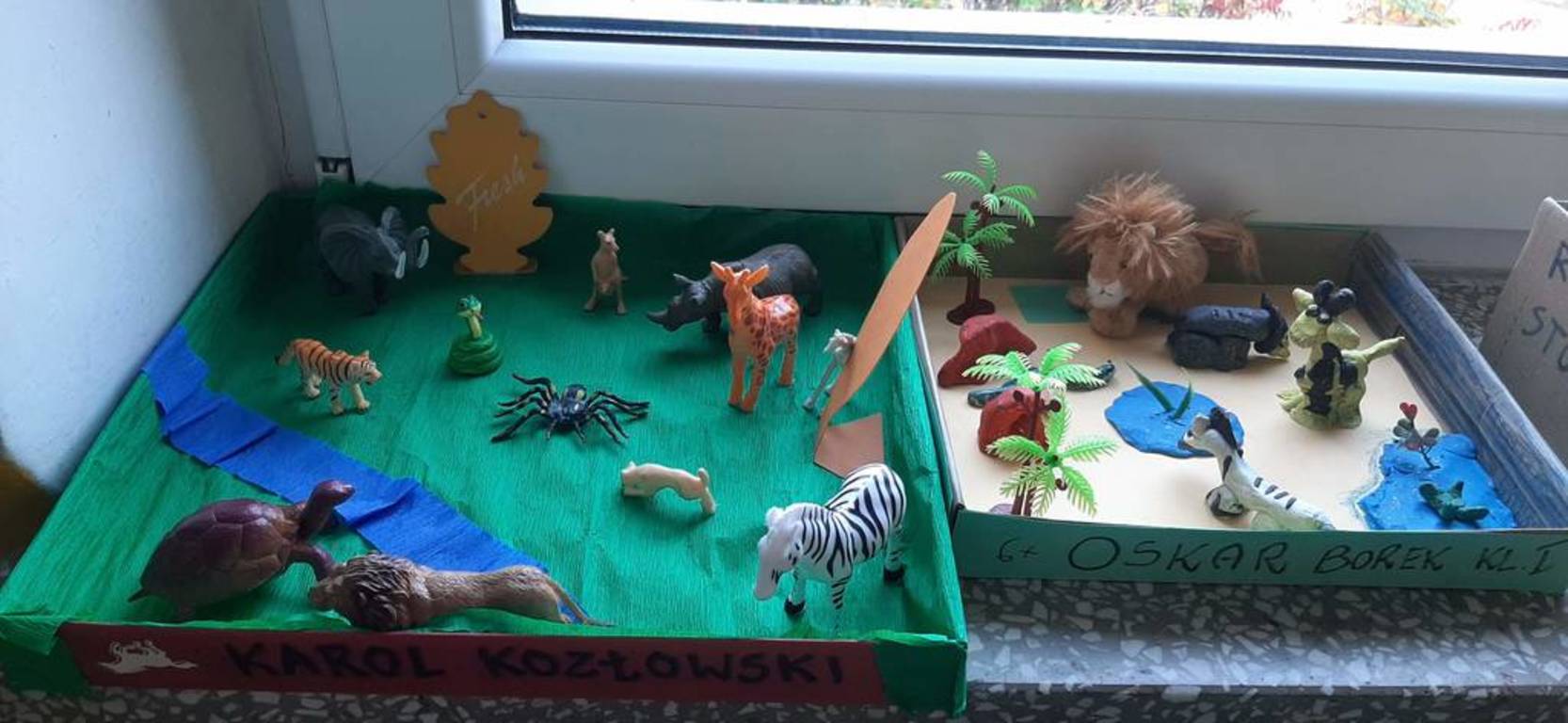 Uczniowie klasy pierwszej wykonali pracę projektową z języka angielskiego. Projekt polegał na stworzeniu makiety ze zwierzętami mieszkającymi na sawannie oraz umiejętności nazwania ich w języku angielskim.