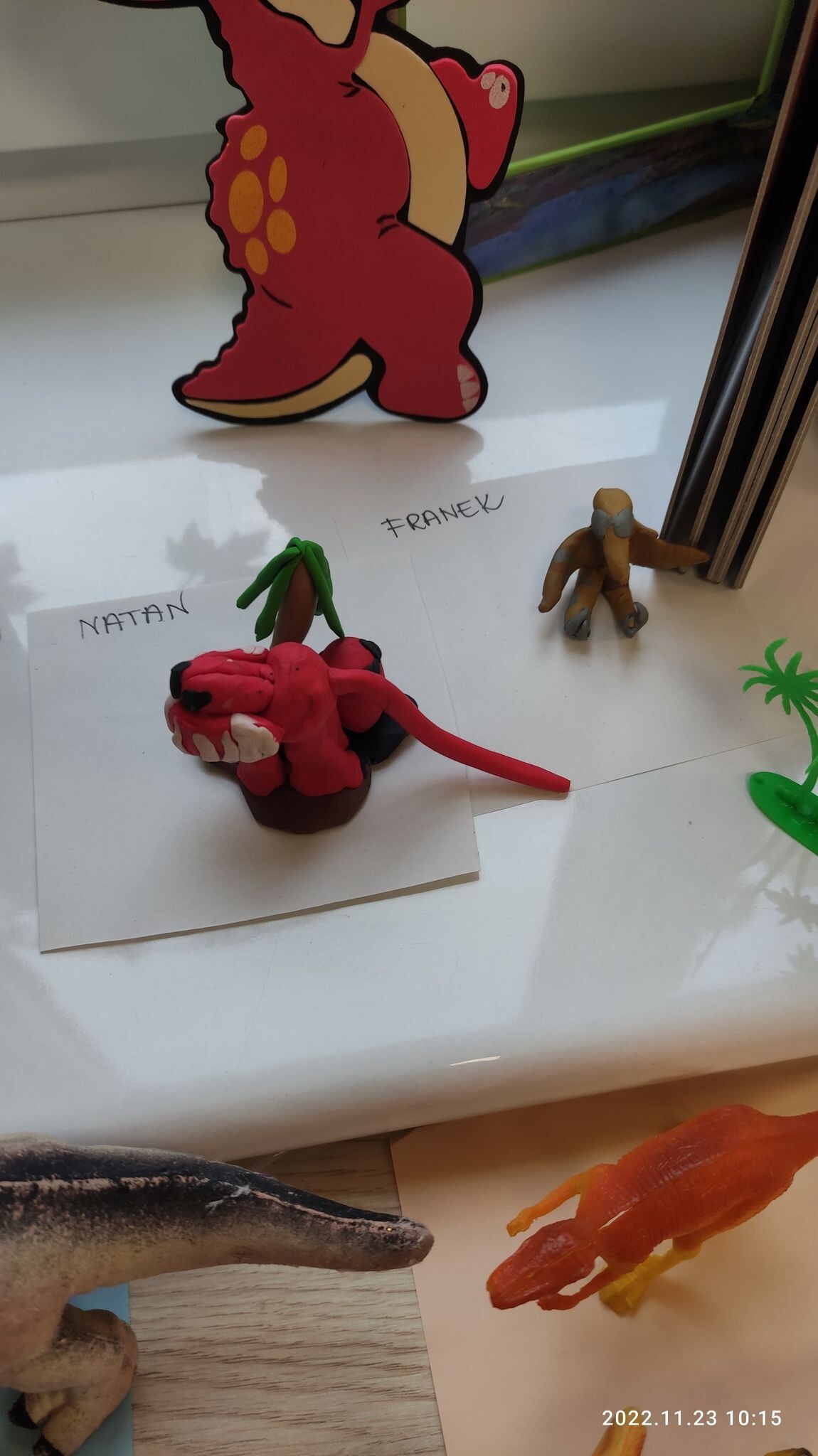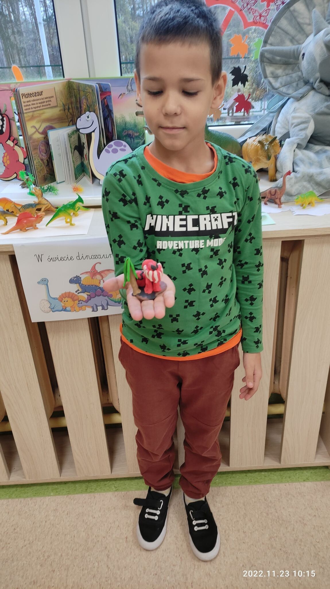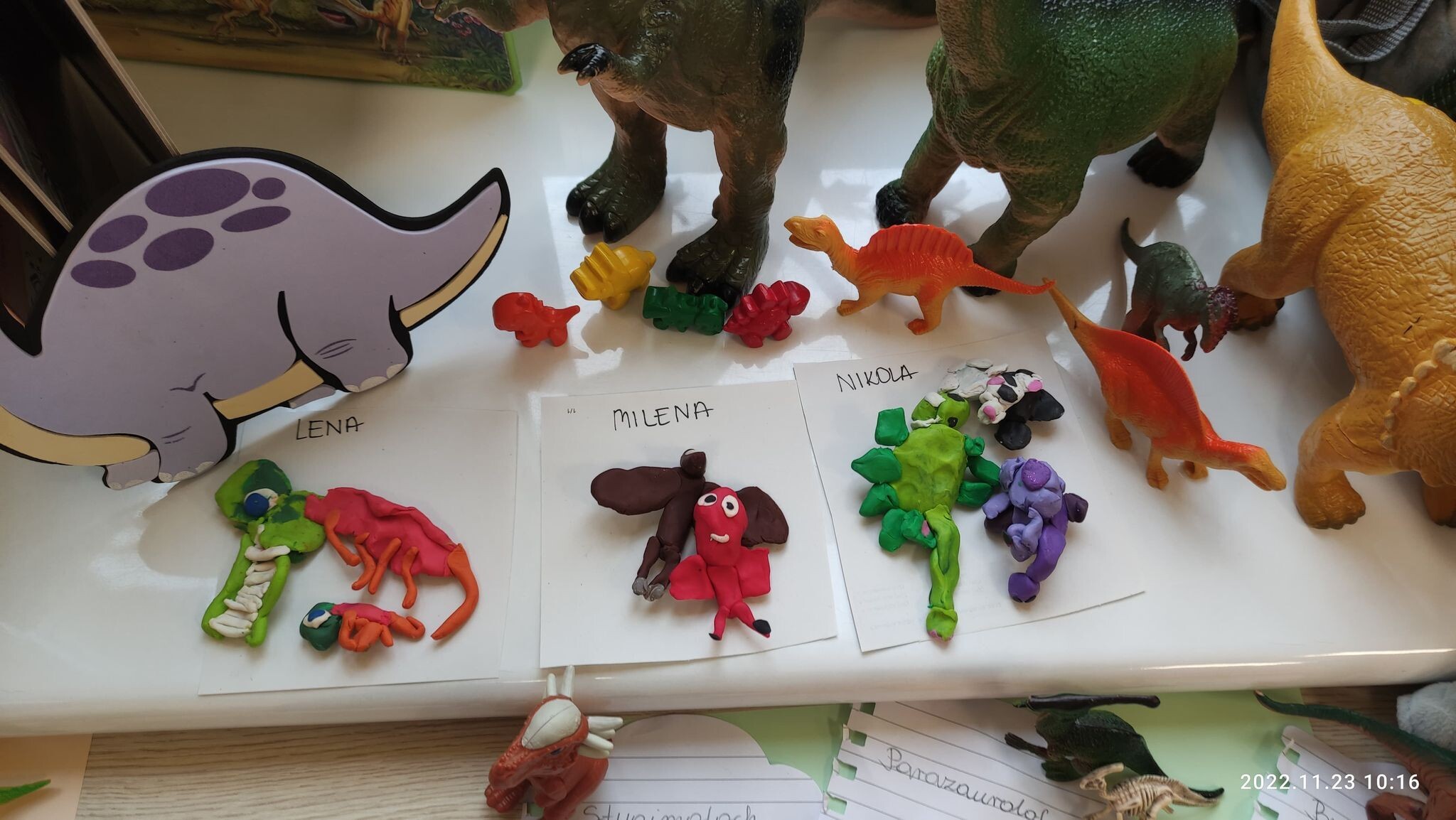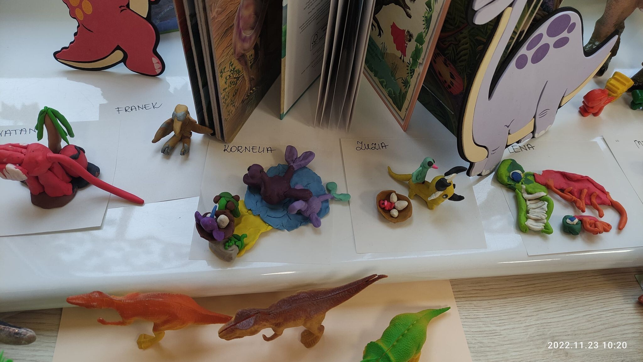 Pierwszoklasiści w zeszłym tygodniu zapoznali ze zwierzętami zamieszkującymi Ziemię w czasach prehistorycznych – dinozaury i inne gady. Czytali ciekawostki na temat ich życia i wyginięcia oraz poznali nazwy niektórych dinozaurów. Uczniowie wykonali z plasteliny swoje ulubione dinozaury i wspólnie stworzyli kącik smoków.