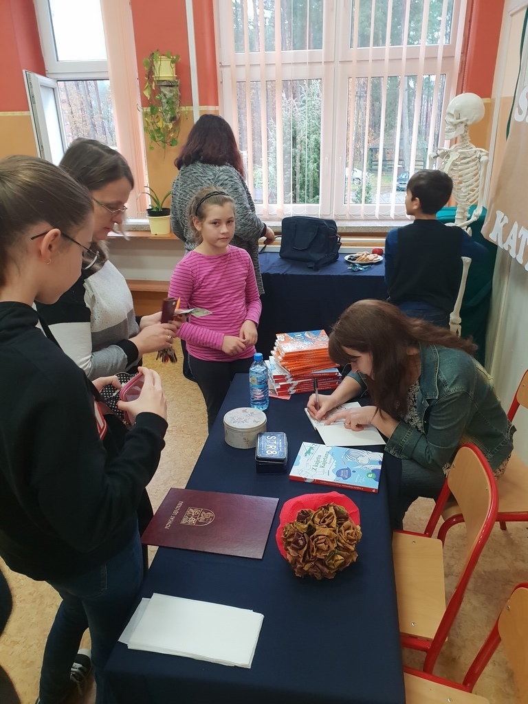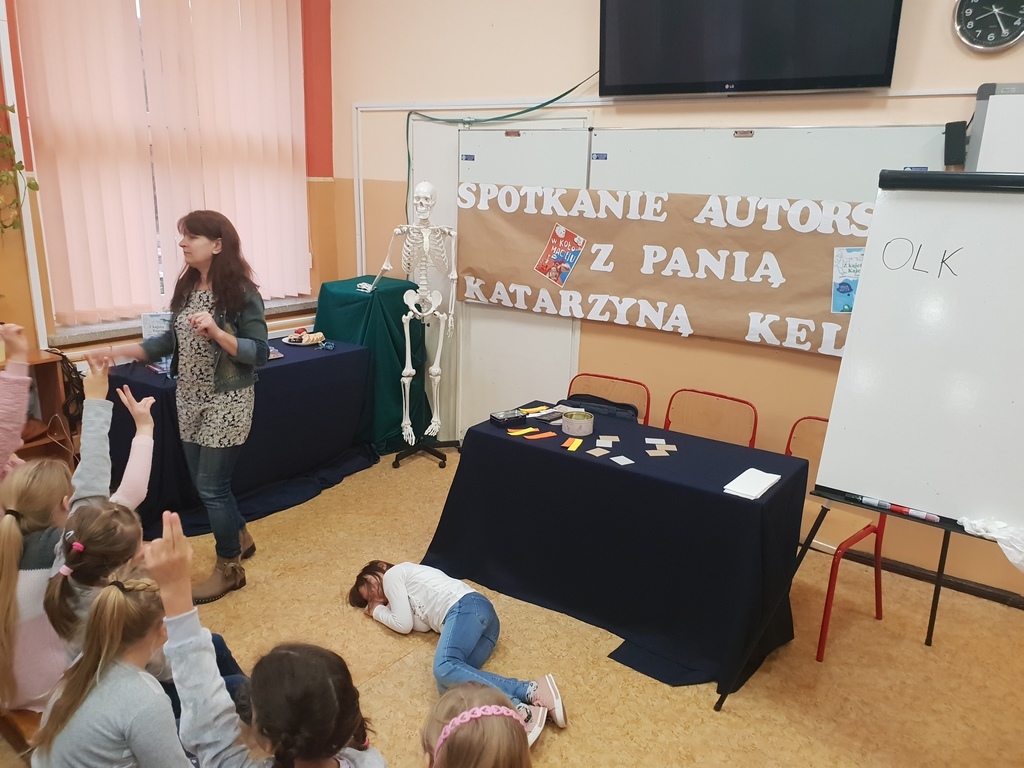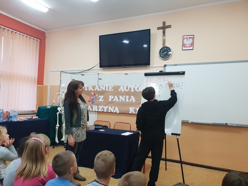 Spotkanie autorskie rozpoczęło się od kreatywnej zabawy czytelniczej pt. „Garnek z zupą”, na podstawie której dzieci odgadywały elementy potrzebne do napisania książki. Następnie uczniowie spróbowali stworzyć własną powieść, dowiedzieli się w jaki sposób zilustrować książkę….gdy nie umie się rysować. Znajomością bajek dzieci mogły się wykazać w zabawie „kalambury”. Pani Katarzyna zaangażowała do zabawy zarówno uczniów jak i nauczycieli. Było wesoło, ciekawie i kreatywnie. Na koniec pisarka zaprezentowała uczniom swoje książki pt. „W koło Macieju”, „Wróżki ratują święta” oraz „Z kajetu Kajetana”