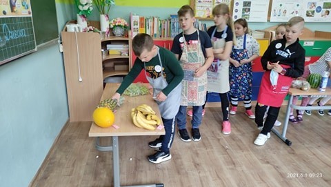 Uczniowie z klasy II promowali zdrowe nawyki żywieniowe, komponując własne sałatki owocowe.