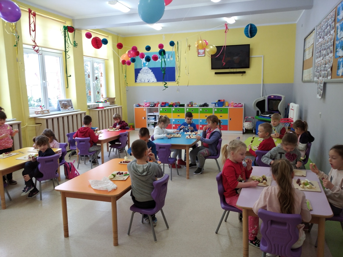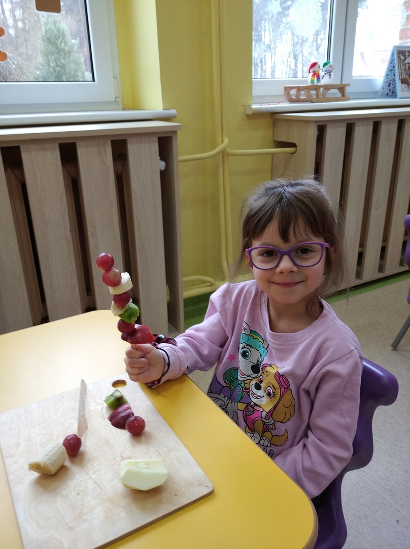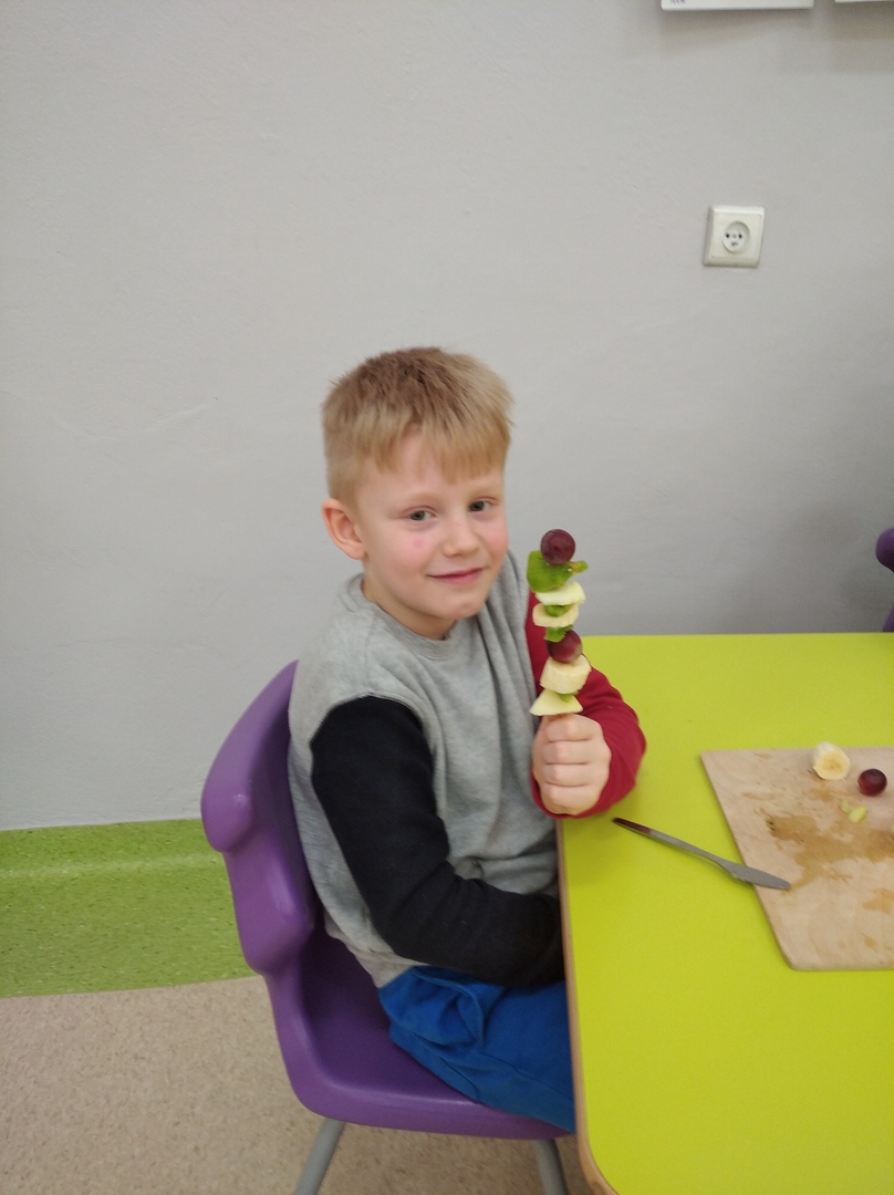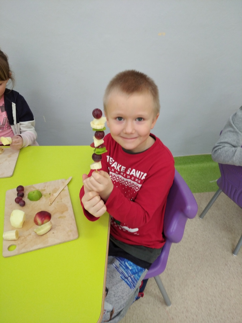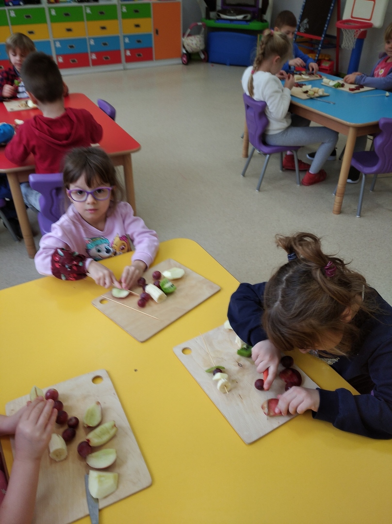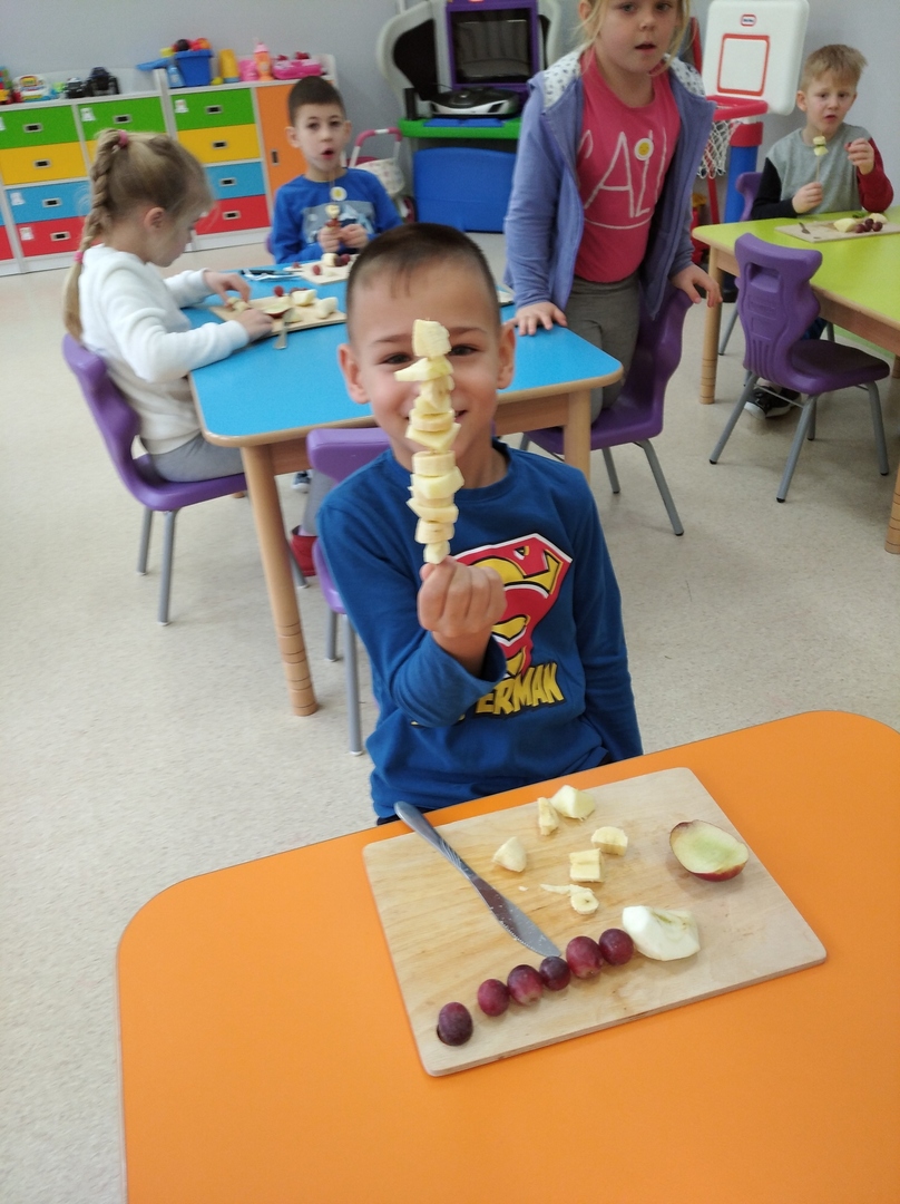 Dzieci tego dnia miały dużo pracy. Jako Przedszkole Promujące Zdrowie, przedszkolaki postanowiły na swoich zajęciach własnoręcznie przygotować owocowe szaszłyki. Najpierw przedszkolaki określały kształt, kolor, wielkość oraz zapamiętywały nazwy owoców. Potem kroiły owoce na kawałki i nadziewały na patyczki tworząc pyszne i zdrowe szaszłyki owocowe.Po skończonej pracy wszystkie dzieci ze smakiem zjadły szaszłyki.