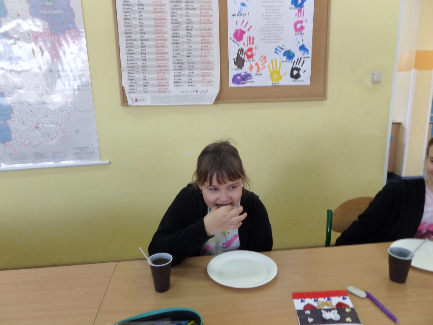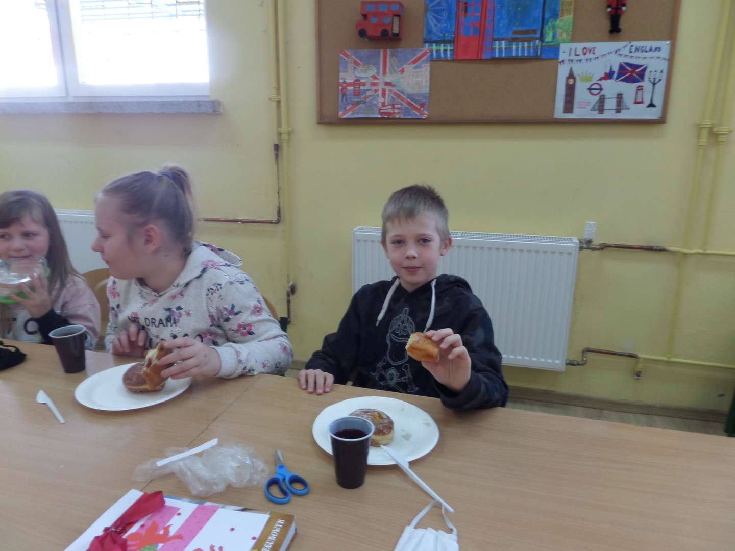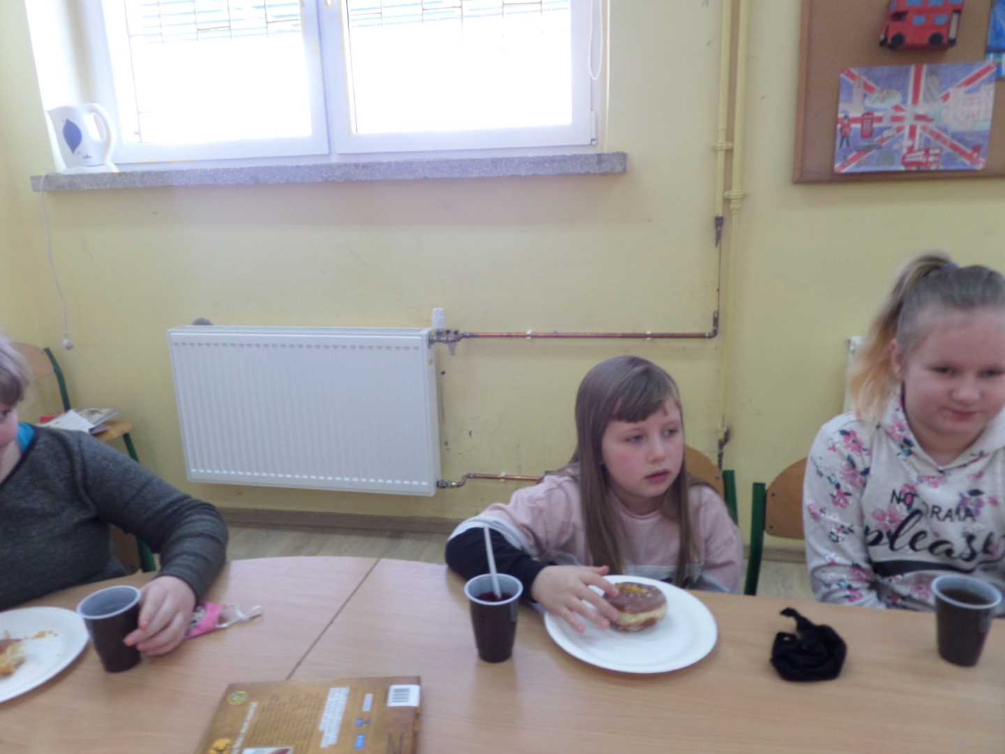 W Tłusty Czwartek od samego rana z pomieszczenia klasy trzeciej roznosił się zapach świeżych, pachnących pączków. Przesąd mówi, że ten skazany jest na niepowodzenia w przyszłości, kto nie zje w Tłusty Czwartek przynajmniej jednego pączka. To był ciekawy i miły dzień. Poznaliśmy historię i tradycje Tłustego Czwartku, były wiersze, przysłowia, ciekawostki i pączkowe kolorowanki. Najważniejszym punktem imprezy była oczywiście degustacja pączków i owocowa herbata. "Chodź była kalorii bomba, ale kto nie zjadł pączka ten trąba"