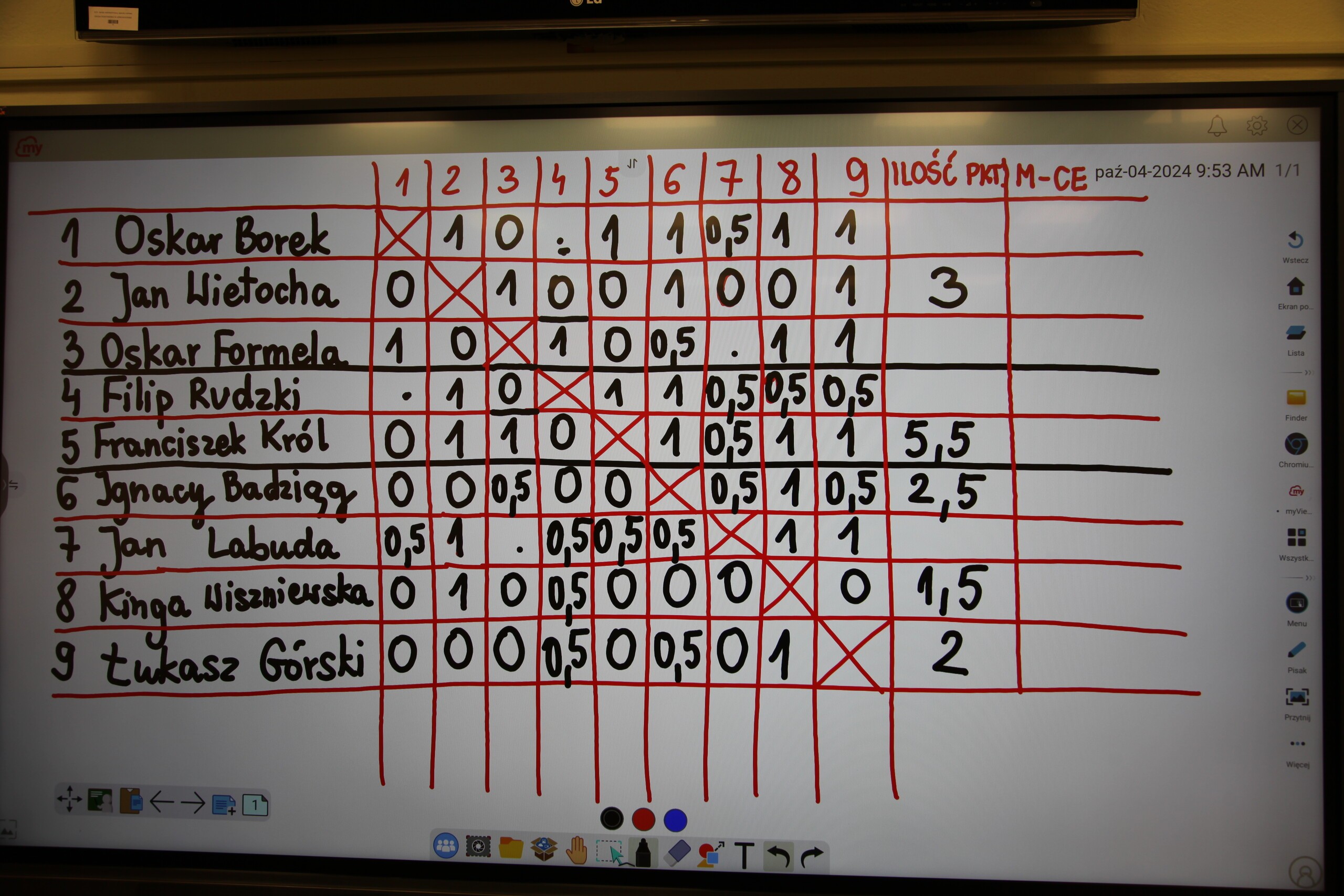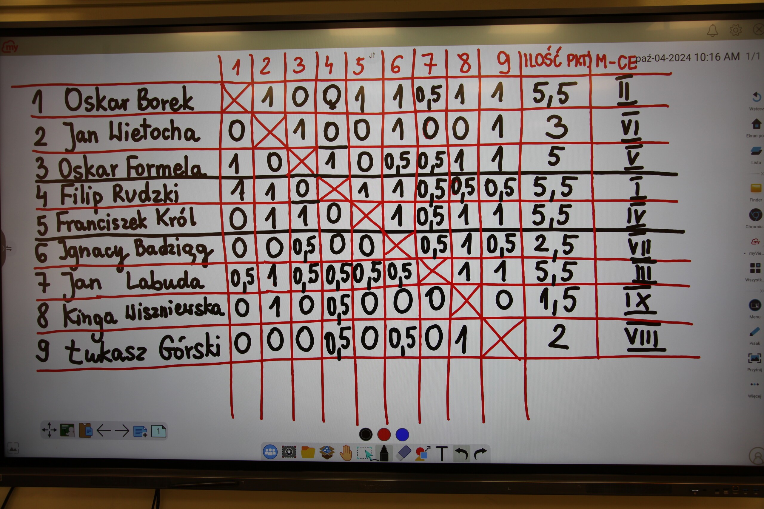 Pierwsze miejsce z ilością 5,5 p. z 8 możliwych zajął uczeń klasy 6 – Filip Rudzki, kolejne miejsca z identyczną ilością punktów zajęli – drugie: Oskar Borek, trzecie: Jan Labuda – obaj z klasy 6, zaś na czwartym miejscu, zdobywając również 5,5 p., uplasował się Franciszek Król z klasy 4. W ustaleniu ostatecznej kolejności zadecydowała punktacja dodatkowa i bezpośrednie pojedynki, zaś w przypadku Oskara Borka i Jana Labudy dodatkowy mecz o drugie miejsce.