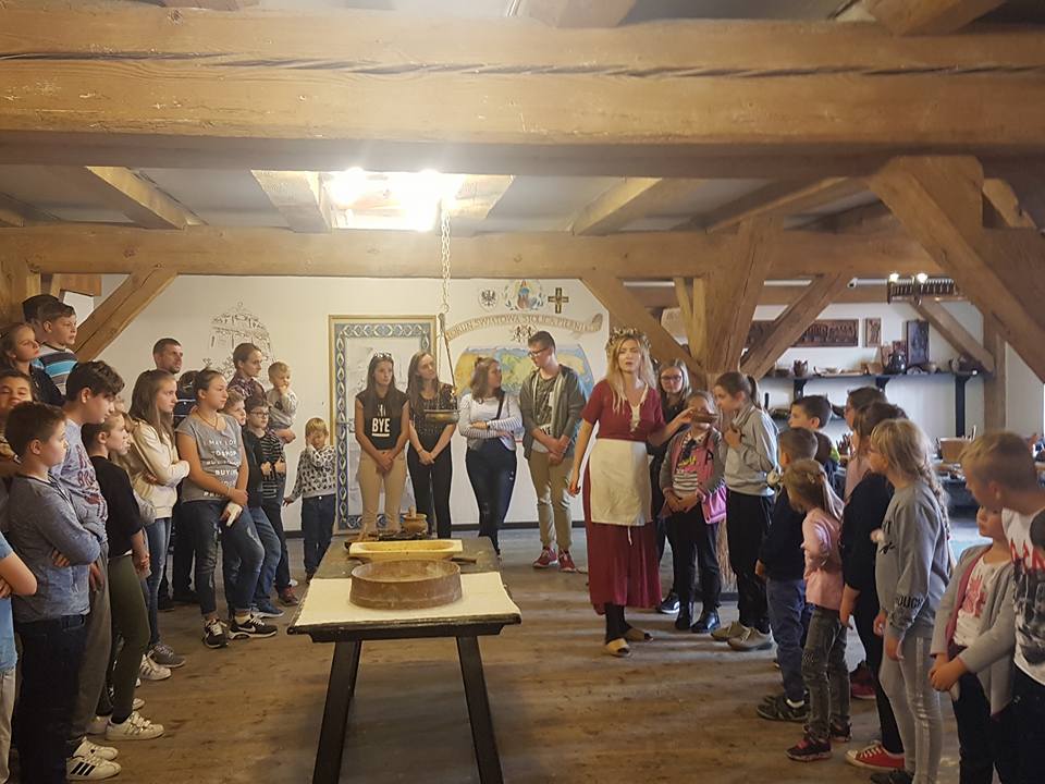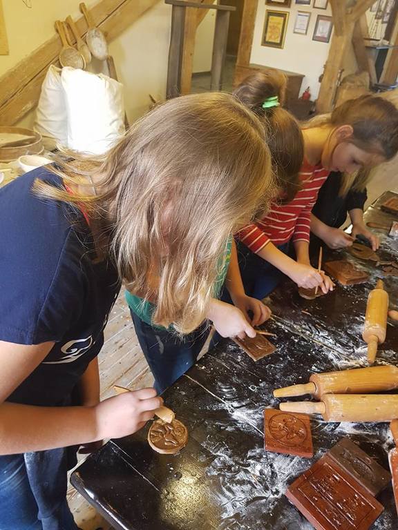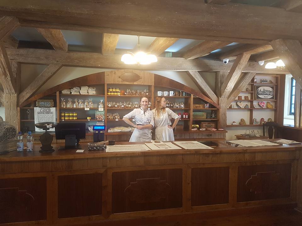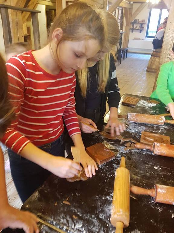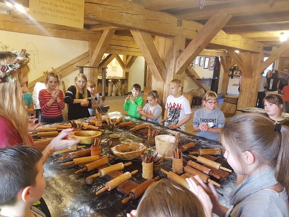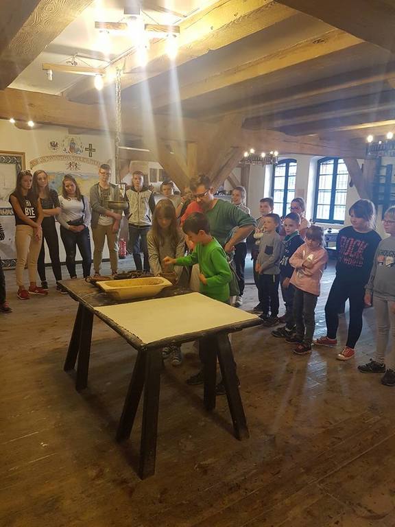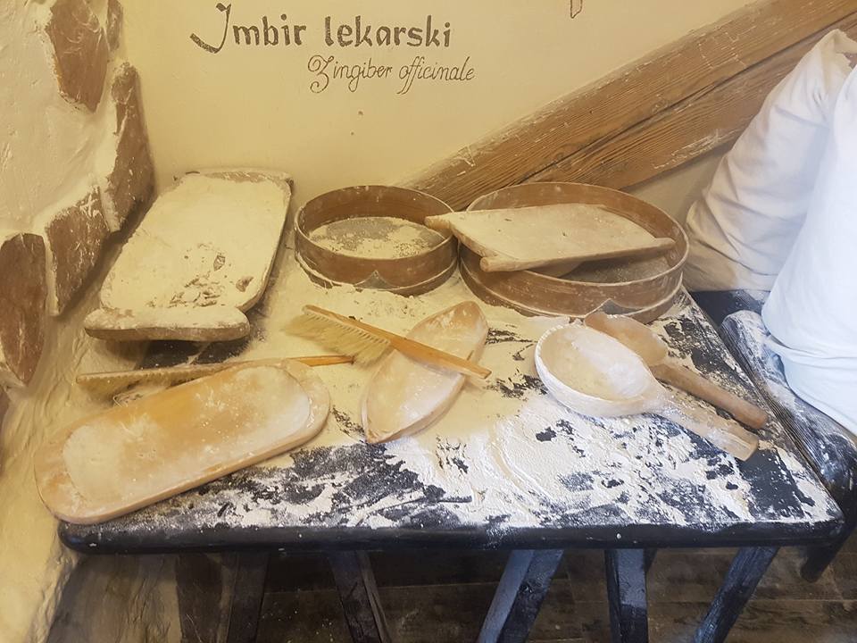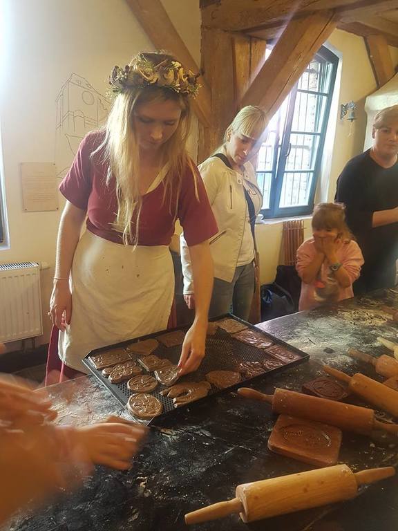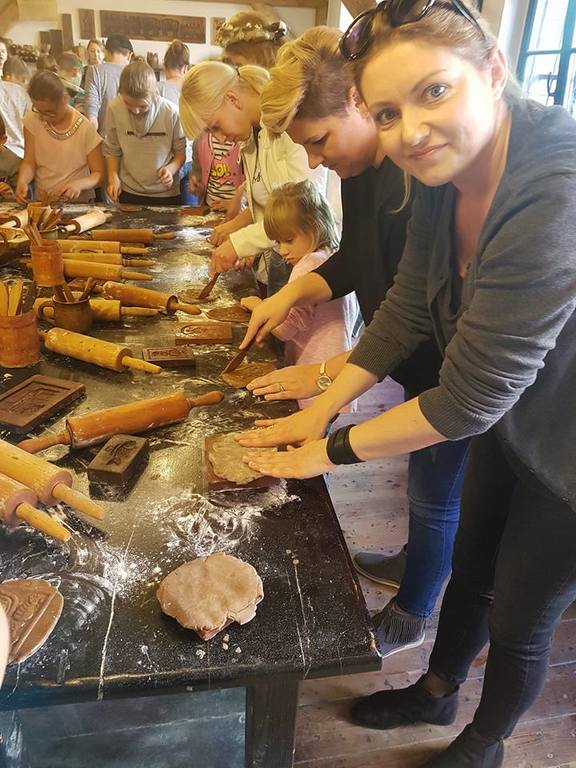 Pierwszym punktem wycieczki były warsztaty oraz zwiedzanie Żywego Muzeum Piernika, gdzie pod czujnym okiem mistrza (magistrum piernikarum) Łukasza uczniowie wykonali własnoręcznie pierniki. Obejrzeliśmy również pokaz - cykl wytwarzania i przechowywania ciasta na pierniki oraz późniejszego ich zdobienia.