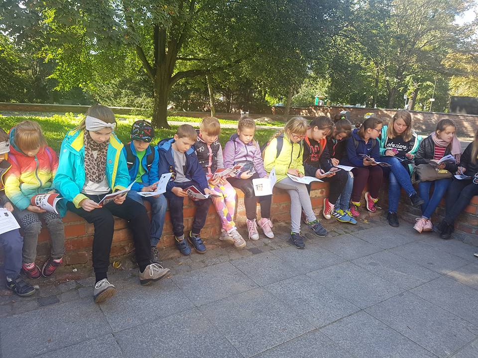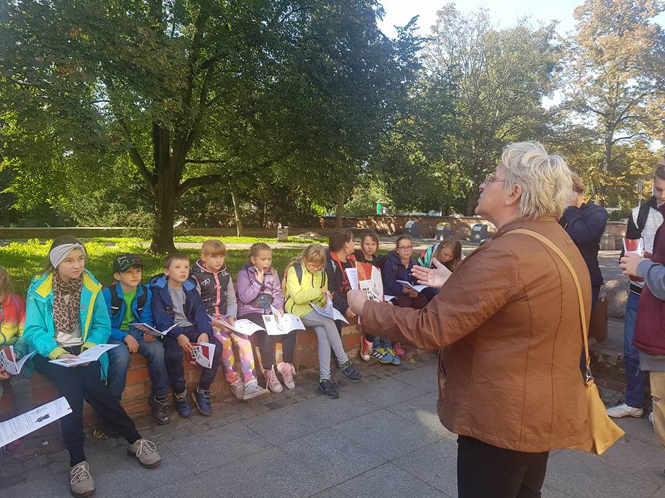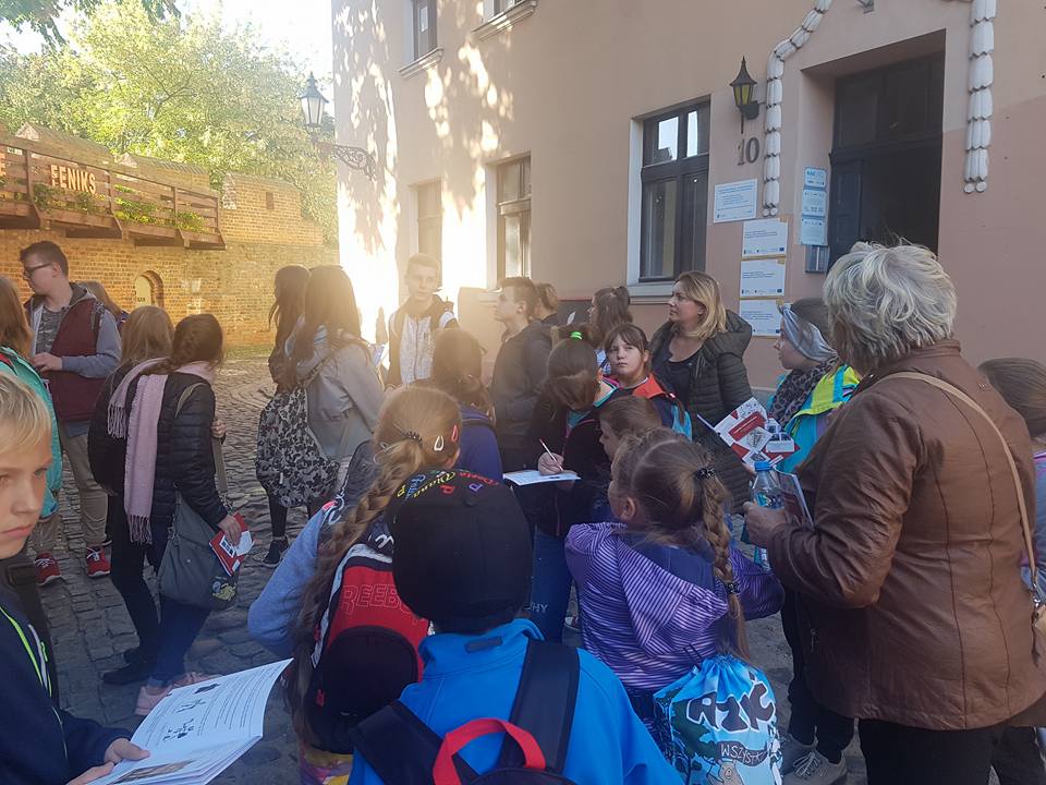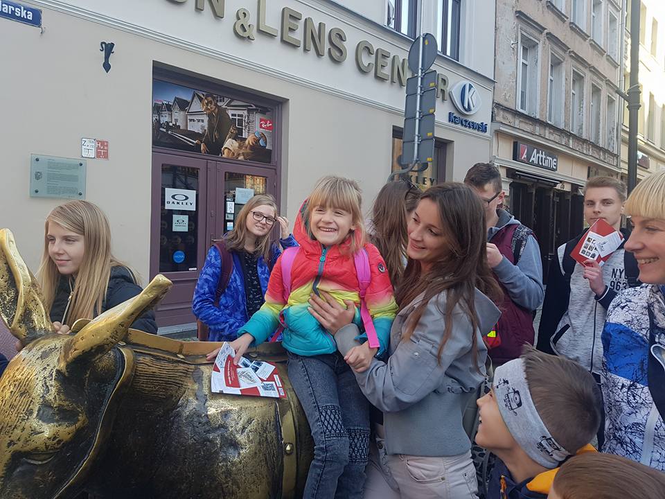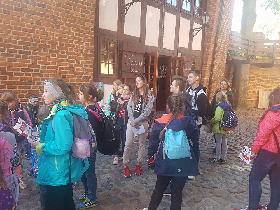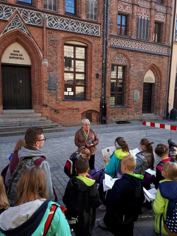 Po posiłku w Mc Donalds rozpoczęliśmy aktywne zwiedzanie Torunia wraz z przewodniczką Anną z Toruńskiego Serwisu Turystycznego. Wybraliśmy trasę "Legendy i fakty toruńskie". Każdy uczeń otrzymał 26 stronicową książeczkę pełną ciekawych zadań, które wykonywaliśmy w trakcie pokonywania trasy. Uczniowie mieli okazje obejrzeć Krzywą Wieżę,Spichlerze, Klasztor Benedyktynek, Bramę Klasztorną i Miejską,Pałac Dąbskich, Toruńską Katedrę,Aleję Gmerków, Dom Mikołaja Kopernika oraz jego pomnik, Ratusz, Dwór Artusa, Kamienicę pod Gwiazdą oraz Pałac Jakuba Meissnera.