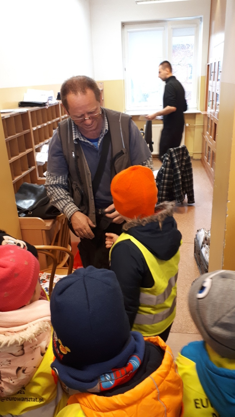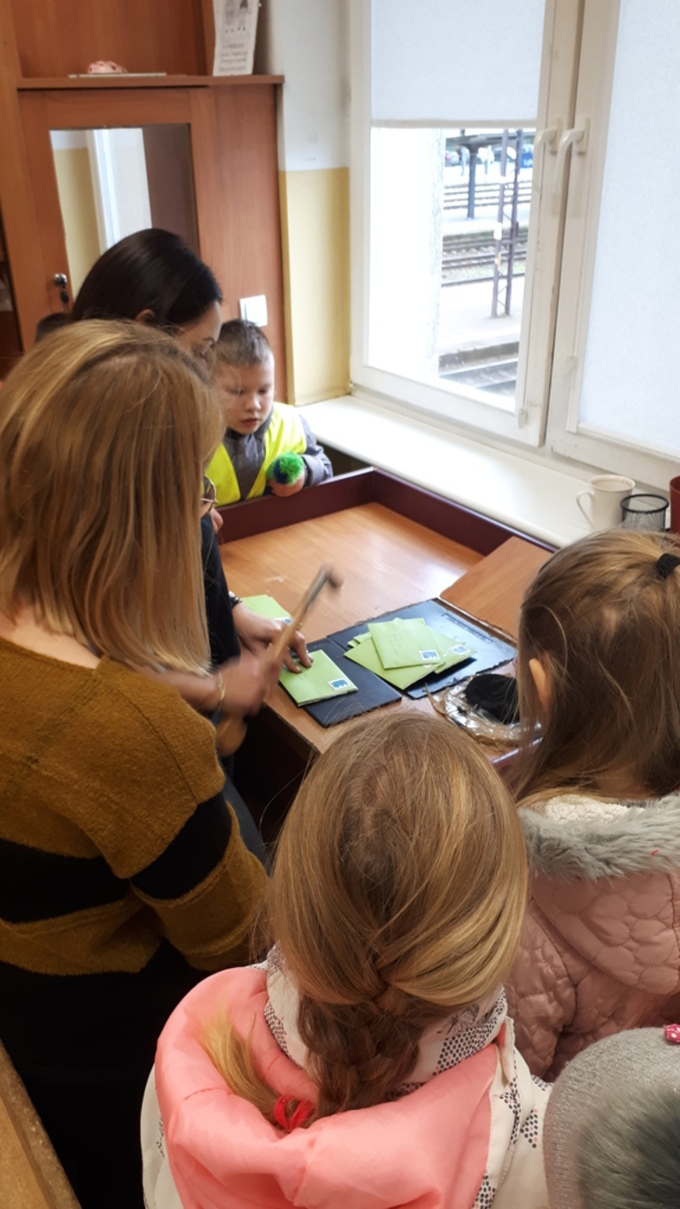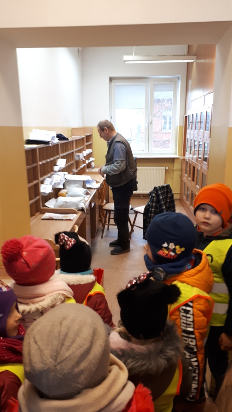 W czasie wycieczki dzieci zobaczyły jak wygląda praca na poczcie z drugiej strony okienka. Zwiedziły różne pomieszczenia, zapoznały się z ich funkcjami. Poznały logo poczty oraz drogę listu, paczki i innych przesyłek. Miały okazję obserwować pracę listonosza przygotowujacego się do wyjścia w teren.