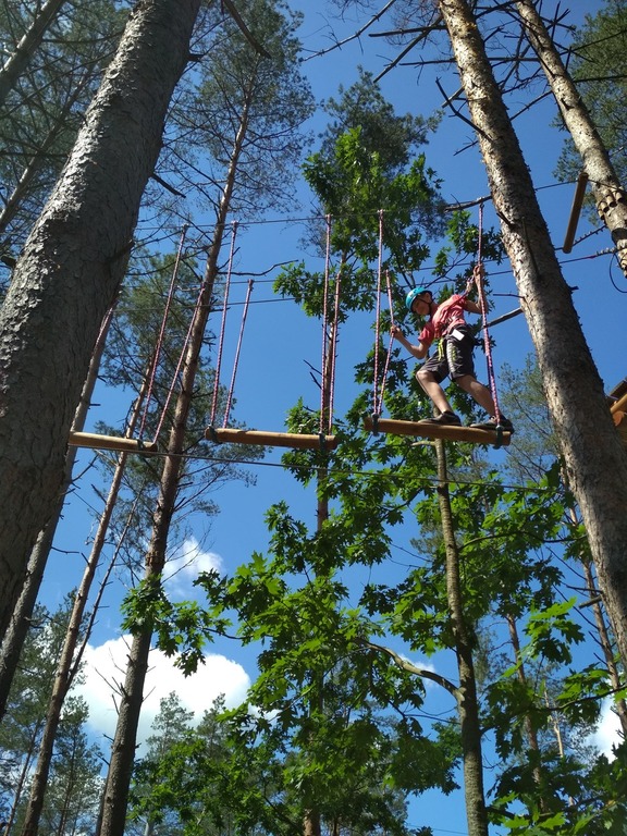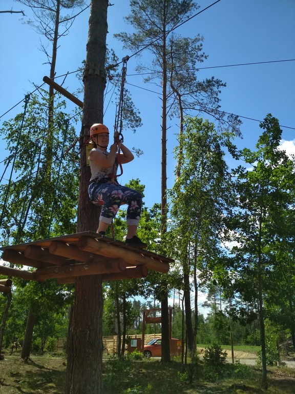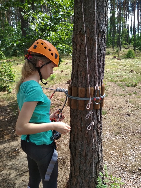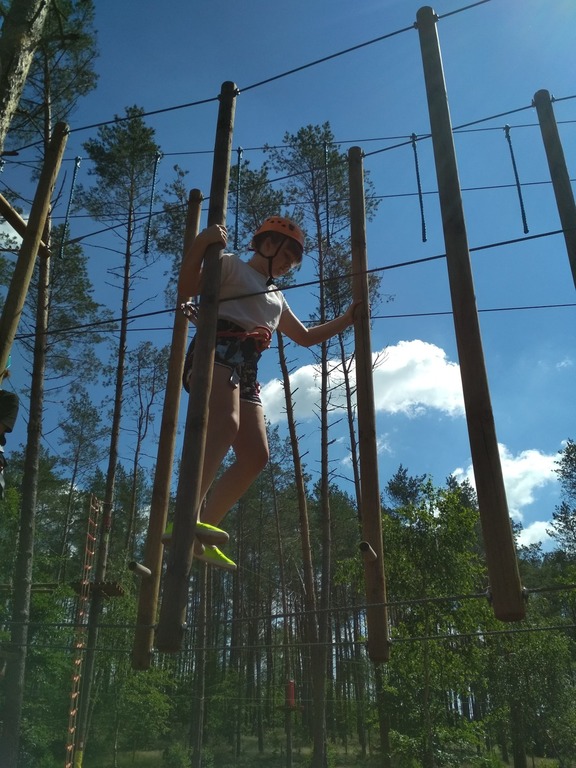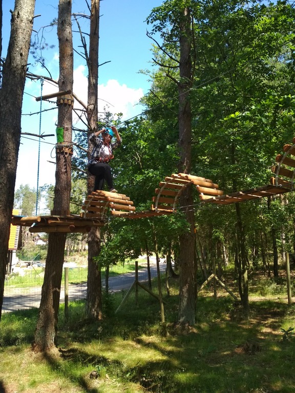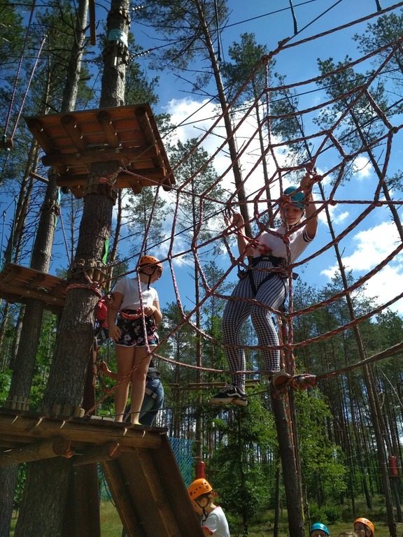 Zaczęliśmy od mniejszej pętli: dwa pierwsze zadania – banalne, potem tyrolka, której co niektórzy nie mogli lub nie chcieli skończyć. Przejście po cienkiej linie na wysokości kilkunastu metrów nie było już tak banalne. Nogi drżały, ręce piekły od kurczowego trzymania się lin, czasami odzywał się ukrywany lęk wysokości, ale nie było już powrotu. Wszyscy daliśmy radę dopingując się wzajemnie. Czas na dużą pętlę, a tu już nie było żartów. Przechodzenie po ruchomych deskach, linach, pajęczynach, wdrapywanie się po ścianie, tyrolka była dla nas już tylko odprężeniem.