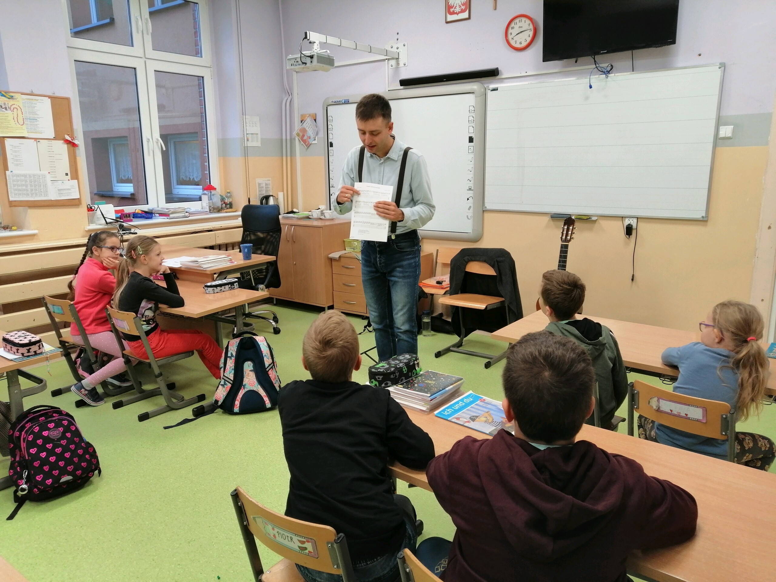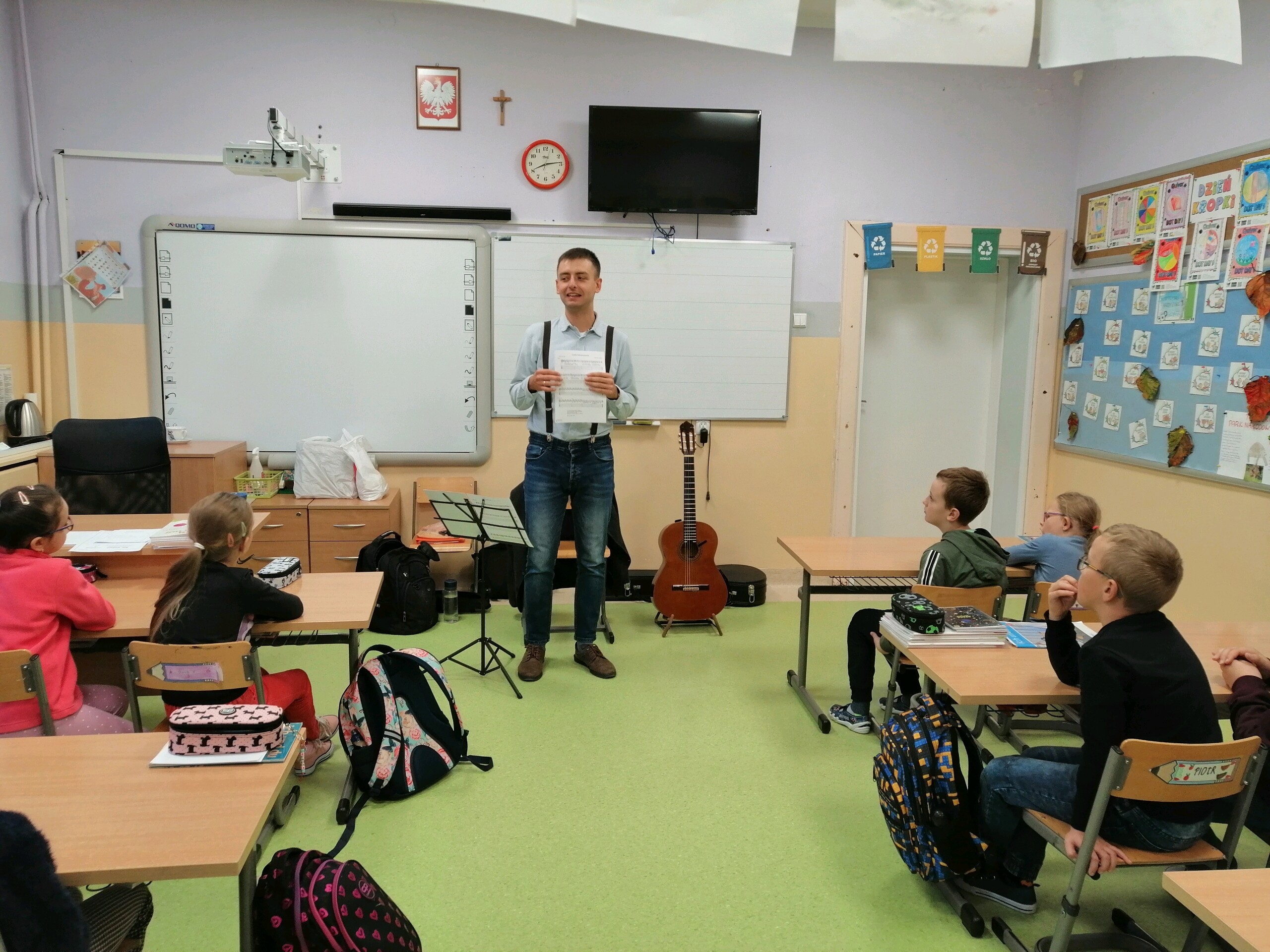 W naszej szkole odbyły się zajęcia muzyczne, które poprowadził Pan Mikołaj Dudkiewicz absolwent Akademii Muzycznej w Warszawie. Uczniowie mieli okazję usłyszeć wirtuozowską grę na gitarze w wykonaniu p. Mikołaja jak i sami spróbować gry na tym pięknym instrumencie. Uczniowie poznali również historię tego instrumentu, jego budowę i technikę gry. Dziękujemy