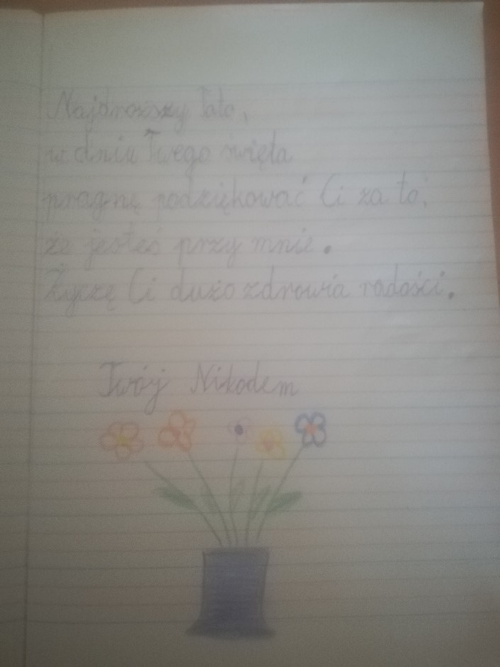 Te prace to: ciekawe zdjęcie, bezbłędnie wykonana praca domowa, starannie napisane życzenia dla mamy i dla taty z okazji ich święta.